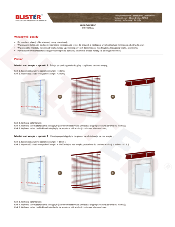 Żaluzja aluminiowa | bambusowa | drewniana System 25 mm | 50mm | 50mm RETRO Montaż nad wnęką | do sufitu JAK POMIERZYĆ INSTRUKCJA Wskazówki i porady • • • • Do pomiaru używaj tylko stalowej taśmy mierniczej ; W pierwszej kolejności podajemy szerokość (mierzona od lewej do prawej), a następnie wysokość żaluzji ( mierzona od góry do dołu) ; W przypadku montażu żaluzji nad wnęką należy upewnić się czy jest dość miejsca między górną krawędzią wnęki , a sufitem ; Poniższy schemat przedstawia sugerowany sposób pomiaru, zatem nie zawsze należy się do niego stosować; Pomiar Montaż nad wnęką - sposób 1. Żaluzja po podciągnięciu do góry częściowo zasłania wnękę ; Krok 1. Szerokość żaluzji to szerokość wnęki +10cm ; Krok 2. Wysokość żaluzji to wysokość wnęki +10cm ; Krok 3. Wybierz kolor żaluzji; Krok 4. Wybierz stronę sterowania żaluzją L/P (sterowanie zazwyczaj umieszcza się po przeciwnej stronie niż klamka); Krok 5. Wybierz rodzaj drabinki na której będą się wspierać pióra żaluzji: taśmowa lub sznurkowa; Montaż nad wnęką - sposób 2 Żaluzja po podciągnięciu do górny w całości zwija się nad wnękę ; Krok 1. Szerokość żaluzji to szerokość wnęki + 10cm ; Krok 2. Wysokość żaluzji to wysokość wnęki + ilość miejsca nad wnęką potrzebna do zwinięcia żaluzji ( tabela str. 2 ) Krok 3. Wybierz kolor żaluzji; Krok 4. Wybierz stronę sterowania żaluzją L/P (sterowanie zazwyczaj umieszcza się po przeciwnej stronie niż klamka); Krok 5. Wybierz rodzaj drabinki na której będą się wspierać pióra żaluzji: taśmowa lub sznurkowa; Montaż do sufitu Krok 1. Szerokość żaluzji to szerokość wnęki + 10cm ; Krok 2. Wysokość żaluzji to wysokość od sufitu do parapetu / podłogi - 2cm; Krok 3. Wybierz kolor żaluzji; Krok 4. Wybierz stronę sterowania żaluzją L/P (sterowanie zazwyczaj umieszcza się po przeciwnej stronie niż klamka); Krok 5. Wybierz rodzaj drabinki na której będą się wspierać pióra żaluzji: taśmowa lub sznurkowa; Uwagi • Poniższa tabela informuje jak wysoko należy zamontować żaluzję aby po jej podciągnięciu nie zasłaniała wnęki; ( wysokość żaluzji obliczamy ze wzoru = wysokość wnęki + ilość miejsca nad wnęką potrzebna do zwinięcia żaluzji ) W przypadku montażu żaluzji nad wnęką należy upewnić się czy jest dość miejsca między górną krawędzią wnęki , a sufitem ; 100 120 140 160 Wysokość wnęki ( cm ) 180 200 220 240 260 280 300 sznurkowa 24 24 26 26 28 30 32 34 37 41 44 taśmowa 21 23 25 26 28 29 32 35 37 39 40 17 19 22 23 24 26 27 28 32 33 34 23 25 26 28 30 33 35 37 - - - 17 19 22 23 24 25 26 27 28 29 31 17 19 21 22 23 24 25 26 27 28 30 16 16 16 17 17 17 18 18 18 19 19 12 12 13 13 14 14 15 15 16 16 17 Produkt Typ drabinki Żaluzja drewniana 25mm Żaluzja drewniana 50mm Żaluzja drewniana 50mm RETRO Żaluzja bambusowa 50mm Żaluzja aluminiowa 50mm sznurkowa taśmowa taśmowa sznurkowa taśmowa sznurkowa Ilość miejsca nad wnęką ( cm ) • Tel. 13 43 226 04 | 799 129 900 e-mail: [email protected] | www.zaluzjedrewniane.pl | www.zaluzjedrewniane.eu