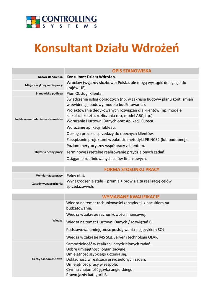 Konsultant Działu Wdrożeń OPIS STANOWISKA Nazwa stanowiska Miejsce wykonywania pracy Stanowisko podlega Podstawowe zadania na stanowisku ‘Kryteria oceny pracy Konsultant Działu Wdrożeń. Wrocław (wyjazdy służbowe: Polska, ale mogą wystąpić delegacje do krajów UE). Pion Obsługi Klienta. Świadczenie usług doradczych (np. w zakresie budowy planu kont, zmian w ewidencji, budowy modelu budżetowania). Projektowanie dedykowanych rozwiązań dla klientów (np. modele kalkulacji kosztu, rozliczania retr, model ABC, itp.). Wdrażanie Hurtowni Danych oraz Aplikacji Eureca. Wdrażanie aplikacji Tableau. Obsługa procesu sprzedaży do obecnych klientów. Zarządzanie projektami w zakresie metodyki PRINCE2 (lub podobnej). Poziom merytoryczny współpracy z klientem. Terminowe i rzetelne realizowanie przydzielonych zadań. Osiąganie zdefiniowanych celów finansowych. FORMA STOSUNKU PRACY Wymiar czasu pracy Zasady wynagrodzenia Pełny etat. Wynagrodzenie stałe + premia + prowizja za realizację celów sprzedażowych. WYMAGANE KWALIFIKACJE Wiedza na temat rachunkowości zarządczej, z naciskiem na budżetowanie. Wiedza w zakresie rachunkowości finansowej. Wiedza Wiedza na temat Hurtowni Danych / rozwiązań BI. Podstawowa umiejętność posługiwania się językiem SQL. Wiedza w zakresie MS SQL Server i technologii OLAP. Cechy osobowościowe Samodzielność w realizacji przydzielonych zadań. Dobre umiejętności organizacyjne, Umiejętność szybkiego uczenia się. Dokładność w realizacji przydzielonych zadań. Umiejętność pracy w zespole. Czynna znajomość języka angielskiego. Prawo jazdy kategorii B. Korzyści z podjęcia pracy na stanowisku Wynagrodzenie Urządzenia Szkolenia Czas pracy Kultura organizacyjna Inne warunki umowy Wynagrodzenie adekwatne do realizowanych prac. Telefon/laptop Szkolenie z budowy Hurtowni Danych w MS SQL SERVER. Szkolenie z Aplikacji Eureca. Szkolenie z Tableau. Nienormowany czas pracy, rozliczanie zadaniowe. Pracę w przyjaznej atmosferze. Atrakcyjne grupowe ubezpieczenie zdrowotne. Atrakcyjne grupowe ubezpieczenie na życie. Możliwość pracy zdalnej. Aplikację proszę przesyłać na adres e-mail: [email protected]