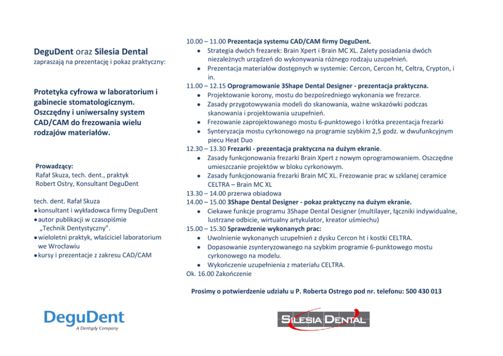 DeguDent oraz Silesia Dental zapraszają na prezentację i pokaz praktyczny: Protetyka cyfrowa w laboratorium i gabinecie stomatologicznym. Oszczędny i uniwersalny system CAD/CAM do frezowania wielu rodzajów materiałów. Prowadzący: Rafał Skuza, tech. dent., praktyk Robert Ostry, Konsultant DeguDent tech. dent. Rafał Skuza konsultant i wykładowca firmy DeguDent autor publikacji w czasopiśmie „Technik Dentystyczny”. wieloletni praktyk, właściciel laboratorium we Wrocławiu kursy i prezentacje z zakresu CAD/CAM 10.00 – 11.00 Prezentacja systemu CAD/CAM firmy DeguDent. Strategia dwóch frezarek: Brain Xpert i Brain MC XL. Zalety posiadania dwóch niezależnych urządzeń do wykonywania różnego rodzaju uzupełnień. Prezentacja materiałów dostępnych w systemie: Cercon, Cercon ht, Celtra, Crypton, i in. 11.00 – 12.15 Oprogramowanie 3Shape Dental Designer - prezentacja praktyczna. Projektowanie korony, mostu do bezpośredniego wykonania we frezarce. Zasady przygotowywania modeli do skanowania, ważne wskazówki podczas skanowania i projektowania uzupełnień. Frezowanie zaprojektowanego mostu 6-punktowego i krótka prezentacja frezarki Synteryzacja mostu cyrkonowego na programie szybkim 2,5 godz. w dwufunkcyjnym piecu Heat Duo 12.30 – 13.30 Frezarki - prezentacja praktyczna na dużym ekranie. Zasady funkcjonowania frezarki Brain Xpert z nowym oprogramowaniem. Oszczędne umieszczanie projektów w bloku cyrkonowym. Zasady funkcjonowania frezarki Brain MC XL. Frezowanie prac w szklanej ceramice CELTRA – Brain MC XL 13.30 – 14.00 przerwa obiadowa 14.00 – 15.00 3Shape Dental Designer - pokaz praktyczny na dużym ekranie. Ciekawe funkcje programu 3Shape Dental Designer (multilayer, łączniki indywidualne, lustrzane odbicie, wirtualny artykulator, kreator uśmiechu) 15.00 – 15.30 Sprawdzenie wykonanych prac: Uwolnienie wykonanych uzupełnień z dysku Cercon ht i kostki CELTRA. Dopasowanie zsynteryzowanego na szybkim programie 6-punktowego mostu cyrkonowego na modelu. Wykończenie uzupełnienia z materiału CELTRA. Ok. 16.00 Zakończenie Prosimy o potwierdzenie udziału u P. Roberta Ostrego pod nr. telefonu: 500 430 013