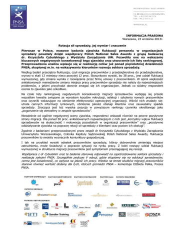 INFORMACJA PRASOWA Warszawa, 23 września 2013r. Rotacja sił sprzedaży, jej wymiar i znaczenie Pierwsze w Polsce, masowe badania zjawiska fluktuacji personelu w organizacjach sprzedaży powstały dzięki współpracy Polish National Sales Awards z grupą badawczą dr. Krzysztofa Cybulskiego z Wydziału Zarządzania UW. Pozwoliły one na wskazanie kluczowych negatywnych konsekwencji tego zjawiska oraz utworzenie ich listy rankingowej. Przeprowadzona analiza wpisuje się w realizację celów już ponad pięcioletniej działalności PNSA, skupionej m.in. na wskazywaniu kierunków rozwoju sektora sprzedaży. Według badań przeciętna fluktuacja, czyli migracja pracowników z przedsiębiorstwa do przedsiębiorstwa, wynosi w skali 12 miesięcy nieco powyżej 12 proc. Stosunkowo wysoki, bo 38 proc., jest udział fluktuacji wymuszonej, gdy zmiana wynika z rozwiązania przez firmę umowy z pracownikiem. W opinii większości ankietowanych menedżerów zmiana miejsca pracy pracowników sprzedaży nie należy do najważniejszych problemów, z jakimi przychodzi obecnie zmagać się ich organizacjom. Jednak co siódmy respondent ocenia to zjawisko jako szkodliwe. Na czoło listy rankingowej negatywnych konsekwencji migracji sprzedawców wybijają się przede wszystkim kwestie związane ze wzrostem kosztów rekrutacji, selekcji i szkolenia nowych pracowników oraz czynniki wskazujące na obniżenie efektywności operacyjnej organizacji. Wśród nich znalazły się: utrata cennych informacji rynkowych, obniżenie jakości obsługi klientów oraz zauważalny spadek sprzedaży. Znacząca jest też wysoka pozycja w powyższym rankingu czynnika określanego jako „pogorszenie się atmosfery w zespole sprzedawców”. Niezależnie od ogólnie negatywnej oceny zjawiska, respondenci wskazali również na pewne pozytywne strony migracji. Dla ponad 50 proc. ankietowanych najważniejszym z nich jest „korzystny wpływ fluktuacji sprzedawców na skuteczność i motywację pozostałych w organizacji pracowników” oraz „pozytywne oddziaływanie zjawiska na poprawę relacji sił sprzedaży z klientami oraz poziom ich obsługi”. Zgodnie z badaniami przeprowadzonymi przez zespół dr Krzysztofa Cybulskiego z Wydziału Zarządzania Uniwersytetu Warszawskiego, Członka Kapituły Sędziowskiej Polish National Sales Awards, fluktuacja pracowników to swoisty wyznacznik koniunktury gospodarczej. I tak na przykład wysoki odsetek pracowników sprzedaży, którzy dobrowolnie zmieniają miejsce zatrudnienia, może świadczyć o poprawie sytuacji na rynku pracy. Z kolei rosnący udział fluktuacji wymuszonej w strukturze migracji pracowników jest symptomem przeciągającej się recesji. Współpraca z dr Cybulskim oraz te badania stanowią odpowiedź na zapotrzebowanie sektora sprzedaży i realizację założeń PNSA. Szczególnie podczas V edycji, gdzie skupiamy się na edukacji sprzedawców, cenna jest świadomość, co wpływa na jakość ich pracy. Wiedza na temat skutków migracji pracowników stanowi również wartość dodaną dla tych, których gromadzi PNSA – komentuje Elżbieta Pełka, Prezes PNSA. Przeprowadzone badania objęły organizacje najbardziej różniące się ze względu na podstawowy zakres swojej działalności. Większość, bo ponad 69 proc. przedsiębiorstw prowadzi działalność na rynku polskim przez okres co najmniej 7 lat, jedynie nieco ponad co dziesiąta analizowana firma funkcjonuje w biznesie krócej niż 3 lata. W ocenach ankietowanych menedżerów aktualna pozycja rynkowa ich przedsiębiorstw jest w większości „bardzo dobra” lub co najmniej „dobra”. Łącznie tego typu oceny stanowiły aż 67 proc. wyrażonych opinii. W badanej grupie firm największy udział miały przedsiębiorstwa, których roczne przychody w 2012 roku mieściły się w przedziale od 21 do 50 mln PLN, następnie firmy o przychodach powyżej 100 mln PLN rocznie. Podobnie kształtuje się struktura liczby sprzedawców zatrudnionych w działach sprzedaży badanych organizacji. Przedsiębiorstwa zatrudniające nie więcej niż 20 sprzedawców stanowią blisko 45 proc. badanej zbiorowości, a jednocześnie ponad 1/4 przedsiębiorstw zatrudnia w strukturach sprzedaży 100 bądź więcej pracowników. W 65 proc. badanych firm większość sprzedawców zatrudnionych jest na stałych umowach o pracę, zaś główne systemy wynagradzania sprzedawców z badanych organizacji to kolejno model „płaca stała plus premia uznaniowa” bądź „płaca stała plus prowizja”. Wyniki badań wskazują, że wysokość przeciętnego miesięcznego wynagrodzenia połowy pracowników działów sprzedaży badanych przedsiębiorstw kształtuje się w przedziale 3001–5000 PLN, a jednocześnie niemal 1/4 sprzedawców uzyskuje dochody znacząco wyższe, bo dochodzące do 10 000 PLN miesięcznie. W strukturze wynagrodzenia sprzedawców przeważają komponenty stałe. Stanowią one 60 proc. dochodów typowego sprzedawcy. Niemal co siódmy sprzedawca z badanych organizacji pracuje w terenie, zaś zdecydowana większość z nich posiada wydzielony obszar sprzedażowy, z czego blisko 63 proc. na wyłączność. *** Badania zrealizowano z wykorzystaniem ankiety internetowej w okresie luty-kwiecień br. Objęły one próbę 310 losowo wybranych menedżerów działów sprzedaży z przedsiębiorstw działających w różnych sektorach polskiej gospodarki. Kontakt dla mediów: Agnieszka Wawrynek Junior PR Account Executive Kom.: (+48) 600 073 489 e-mail: [email protected]