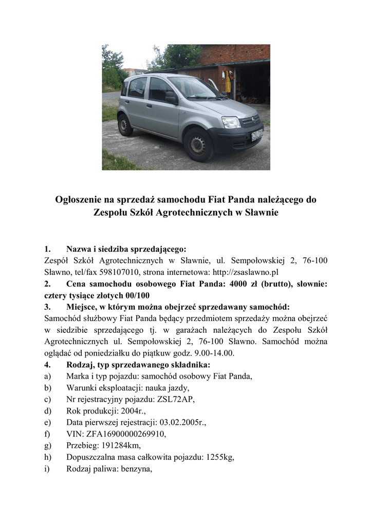 Ogłoszenie na sprzedaż samochodu Fiat Panda należącego do Zespołu Szkół Agrotechnicznych w Sławnie 1. Nazwa i siedziba sprzedającego: Zespół Szkół Agrotechnicznych w Sławnie, ul. Sempołowskiej 2, 76-100 Sławno, tel/fax 598107010, strona internetowa: http://zsaslawno.pl 2. Cena samochodu osobowego Fiat Panda: 4000 zł (brutto), słownie: cztery tysiące złotych 00/100 3. Miejsce, w którym można obejrzeć sprzedawany samochód: Samochód służbowy Fiat Panda będący przedmiotem sprzedaży można obejrzeć w siedzibie sprzedającego tj. w garażach należących do Zespołu Szkół Agrotechnicznych ul. Sempołowskiej 2, 76-100 Sławno. Samochód można oglądać od poniedziałku do piątkuw godz. 9.00-14.00. 4. Rodzaj, typ sprzedawanego składnika: a) Marka i typ pojazdu: samochód osobowy Fiat Panda, b) Warunki eksploatacji: nauka jazdy, c) Nr rejestracyjny pojazdu: ZSL72AP, d) Rok produkcji: 2004r., e) Data pierwszej rejestracji: 03.02.2005r., f) VIN: ZFA16900000269910, g) Przebieg: 191284km, h) Dopuszczalna masa całkowita pojazdu: 1255kg, i) Rodzaj paliwa: benzyna, j) k) l) m) n) Pojemność/moc silnika: 1108cm3 / 40kW, Liczba osi: 2, Rodzaj skrzyni biegów: manualna, Kolor powłoki lakieru: srebrny, Liczba miejsc siedzących: 5. Samochód kompletny – wykonanie standard. Termin badania technicznego do 21.01.2016r.