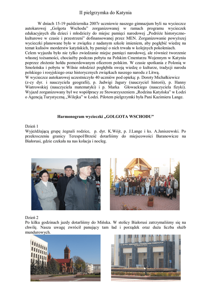 II pielgrzymka do Katynia W dniach 15-19 października 2007r uczniowie naszego gimnazjum byli na wycieczce autokarowej „Golgota Wschodu” zorganizowanej w ramach programu wycieczek edukacyjnych dla dzieci i młodzieży do miejsc pamięci narodowej „Podróże historycznokulturowe w czasie i przestrzeni” dofinansowanej przez MEN. Zorganizowanie powyższej wycieczki planowane było w związku z nadanym szkole imieniem, aby pogłębić wiedzę na temat kulisów morderstw katyńskich, by pamięć o nich trwała w kolejnych pokoleniach. Celem wyjazdu było nie tylko zwiedzanie miejsc pamięci narodowej, ale również tworzenie własnej tożsamości, chociażby podczas pobytu na Polskim Cmentarzu Wojennym w Katyniu poprzez złożenie hołdu pomordowanym oficerom polskim. W czasie spotkania z Polonią w Smoleńsku i pobytu w Wilnie młodzież pogłębiła swoją wiedzę o kulturze, tradycji narodu polskiego i rosyjskiego oraz historycznych związkach naszego narodu z Litwą. W wycieczce autokarowej uczestniczyło 40 uczniów pod opieką: p. Doroty Michałkiewicz (z-cy dyr. i nauczyciela geografii), p. Jadwigi Jagury (nauczyciel historii), p. Hanny Wiatrowskiej (nauczyciela matematyki) i p. Marka Głowackiego (nauczyciela fizyki). Wyjazd zorganizowany był we współpracy ze Stowarzyszeniem „Rodzina Katyńska” w Łodzi o Agencją Turystyczną „Wilejka” w Łodzi. Pilotem pielgrzymki była Pani Kazimiera Lange. Harmonogram wycieczki „GOLGOTA WSCHODU” Dzień 1 Wyjeżdżającą grupę żegnali rodzice, p. dyr. K.Wójt, p. J.Lange i ks. A.Janiszewski. Po przekroczeniu granicy Terespol/Brześć dotarliśmy do miejscowości Baranowicze na Białorusi, gdzie czekała na nas kolacja i nocleg. Dzień 2 Po kilku godzinach jazdy dotarliśmy do Mińska. W stolicy Białorusi zatrzymaliśmy się na chwilę. Nasza uwagę zwrócił panujący tam ład i porządek oraz duża liczba służb mundurowych. Po przekroczeniu kolejnej granicy, tym razem białorusko-rosyjskiej, dotarliśmy późnym popołudniem do Katynia. Choć była już późna godzina, to na chwilę wstąpiliśmy na Polski Cmentarz Wojenny. Ciemność, cisza i pojedyncze zapalone znicze dały dużo do myślenia. Zakwaterowani byliśmy w Smoleńsku. Dzień 3 P śniadaniu pojechaliśmy do miejscowości Gniazdowo, gdzie znajduje się stacja kolejowa, na którą przywożono transporty polskich jeńców. Stąd przez las prowadziła droga na miejsce straceń. Na Polskim Cmentarzu Wojennym odprawiona została Msza Święta w intencji polskich oficerów rozstrzelanych przez NKWD przez o.Ptolemeusza (proboszcza Polonii w Smoleńsku) w obecności pocztu sztandarowego szkoły. Młodzież złożyła hołd wszystkim pomordowanym w Katyniu. W części rosyjskiej cmentarza, gdzie spoczywają ofiary totalitarnych represji, także złożyliśmy kwiaty i zapaliliśmy znicze. Następnie każdy uczeń otrzymał kartkę z kilkoma nazwiskami pomordowanych Polaków – łodzian oraz znicze i miał za zadanie odnaleźć wśród 4416 indywidualnych inskrypcji otrzymane nazwiska. Przy każdym odnalezionym nazwisku uczniowie zapalili znicz. Pod koniec pobytu zwiedziliśmy muzeum katyńskie, które znajduje się na terenie Memoriału. Obejrzeliśmy tam eksponaty odnalezione podczas ekshumacji zwłok zamordowanych polskich oficerów. Po zakończenie uroczystości na cmentarzu udaliśmy się do Smoleńska. Zwiedzaliśmy miasto. Ponownie spotkaliśmy się z o.Ptolemeuszemm w kaplicy rzymsko-katolickiej parafii obok kościoła Niepokalanego Poczęcia NMP. Następnie udaliśmy się na spotkanie z polską młodzieżą mieszkającą w Smoleńsku. Po obejrzeniu części artystycznej, przygotowanej przez tutejsza młodzież i zaśpiewaniu przez naszych uczniów kilku pieśni patriotycznych, podarowaliśmy gospodarzom drobne upominki ufundowane przez sponsorów i radę rodziców naszego gimnazjum. Dzień 4 Wyruszyliśmy na Litwę. W drodze do Wilna odwiedziliśmy Kuropaty, kompleks leśny na przedmieściach Mińska – miejsce rozstrzelania i pochówku ofiar stalinowskiego terroru na Białorusi. Znajdują się tam tysiące drewnianych krzyży upamiętniających obywateli polskich i białoruskich pomordowanych przez NKWD. Na jednej z mogił oficerów polskich złożyliśmy kwiaty i zapaliliśmy znicze. Wieczorem dotarliśmy do stolicy Litwy. Wyglądała wspaniale. Dzień 5 Zwiedzaliśmy Wilno. Byliśmy na cmentarzu na Rossie, w Ostrej Bramie, Muzeum Adama Mickiewicza, Katedrze Wileńskiej i na starówce. Na chwilę wstąpiliśmy jeszcze do Trok – poprzedniej stolicy Litwy. Jako członkowie Unii Europejskiej szybko przekraczamy granicę polsko-litewską i pojechaliśmy do Piątnicy. Tam czekała na nas dyrekcja i nauczyciele gimnazjum, które, tak jak my, nosi imię Ofiar Katynia. Choć na zegarku była 22.00, zostaliśmy bardzo miło przyjęci. Naszą młodzież urzekła stan techniczny i nowoczesne wyposażenie szkoły. Po zjedzeniu ciepłego posiłku wróciliśmy do Łodzi, gdzie czekali na nas nasi rodzice.