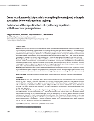 PRACE ORYGINALNE I KLINICZNE © Aluna Ocena leczniczego oddziaływania krioterapii ogólnoustrojowej u chorych z zespołem bólowym kręgosłupa szyjnego Evolutation of therapeutic effects of cryotherapy in patients with the cervical pain syndrome Patrycja Daniszewska1, Adam Kroc2, Magdalena Barocha1,3, Łukasz Kikowski1 1 Ośrodek Profilaktyki i Rehabilitacji Creator Sp. z o.o. w Łodzi Zakład Medycyny Fizykalnej, Katedra Rehabilitacji Uniwersytetu Medycznego w Łodzi 3 Centrum Medyczne Profamilia w Łodzi 2 STRESZCZENIE Wstęp: Zespoły bólowe kręgosłupa szyjnego dotyczą około 2 milionów dorosłych Polaków, a najczęstszą ich przyczyną jest choroba zwyrodnieniowa, która prowadzi do nieodwracalnych zmian w strukturach stawów i w efekcie powoduje ból i ograniczenie ruchomości. Skuteczną metodą terapii o szerokim spektrum działania i małym ryzyku powikłań jest krioterapia ogólnoustrojowa skojarzona z kinezyterapią. Wpływa ona na zmniejszenie dolegliwości bólowych, obniżenie napięcia mięśniowego i poprawę zakresu ruchomości stawów. Celem pracy była ocena leczniczego oddziaływania zabiegów krioterapii ogólnoustrojowej u pacjentów z zespołem bólowym kręgosłupa szyjnego. Materiał i metody: Do badania zakwalifikowano 49 pacjentów w wieku 28-75 lat z zespołem bólowym kręgosłupa szyjnego wynikającym z choroby zwyrodnieniowej. Do badania wykorzystano skalę NRS oraz zmodyfikowany Kwestionariusz Wskaźników Bólu wg Laitinena oraz dokonano pomiaru zakresu ruchomości kręgosłupa szyjnego w płaszczyźnie strzałkowej, czołowej i poprzecznej mierniczą taśmą ortopedyczną. Badania przeprowadzono dwukrotnie, przed rozpoczęciem i po zakończeniu serii 10 zabiegów krioterapii. Wnioski: Zaobserwowano istotne statystycznie zmniejszenie nasilenia dolegliwości bólowych oraz zwiększenie zakresu ruchomości kręgosłupa szyjnego. Krioterapia ogólnoustrojowa jest metodą fizykoterapeutyczną, która korzystnie wpływa na stan zdrowia pacjentów z zespołami bólowymi kręgosłupa szyjnego w przebiegu choroby zwyrodnieniowej. Słowa kluczowe: krioterapia ogólnoustrojowa, zespół bólowy kręgosłupa szyjnego, choroba zwyrodnieniowa SUMMARY Introduction: Cervical pain syndromes affect two millions of adult Poles. The most common cause of them is osteoarthritis which leads to irreversible changes in the structure of the joints and as a result causes pain and limited mobility. Effective method of broad-spectrum treatment with low risk of complications is cryotherapy associated with kinesitherapy. It affects the reduction of pain, mitigation of muscle tension and improve range of motion of the joints. The aim of this study was to evaluate the therapeutic effects of cryotherapy treatment for patients with cervical pain syndrome. Material and methods: The study included 49 patients aged 28-75 years with cervical spine pain syndrome resulting from osteoarthritis. To assess intensity of pain a numerical scale (NRS) was used as well as and modified questionnaire for pain evaluation acc. to Laitinen. Measured the range of motion of the cervical spine in the sagittal, frontal and transverse planes. The study was conducted twice, before and after the series of 10 treatments of cryotherapy. Conclusions: A statistically significant reduction of pain and increase range of motion of the cervical spine was obtained in tested group. Cryotherapy is a method of physical therapy, which positively affects the health of patients with cervical pain syndromes resulting from osteoarthritis. Key words: cryotherapy, cervical pain syndrome, osteoarthritis Acta Balneol., TOM LVI, Nr 2 (136)/2014, s.100-105 100 Acta Balneologica TOM LVI, Nr 2 (136) /2014 Ocena leczniczego oddziaływania krioterapii ogólnoustrojowej u chorych z zespołem bólowym kręgosłupa szyjnego WSTĘP Zespół bólowy kręgosłupa to nocyceptywne wrażenia o różnorodnej etiologii, zlokalizowane w obrębie kręgosłupa i tkanek przykręgosłupowych. Według danych epidemiologicznych, w ciągu ostatnich lat zwiększyła się częstotliwość występowania zespołów bólowych w odcinku szyjnym [15]. Ból szyi dotyczy rocznie 30-50% populacji, co plasuje go na drugim, po odcinku lędźwiowo-krzyżowym, miejscu pod względem częstości występowania wśród zespołów bólu mięśniowo-szkieletowego. Przewiduje się, że 2/3 populacji doświadczy w swoim życiu bólu kręgosłupa szyjnego [2, 7]. Etiologia zespołów bólowych kręgosłupa szyjnego jest bardzo złożona, jednak najczęściej wiąże się ona z chorobą zwyrodnieniową [1, 3, 12]. Choroba zwyrodnieniowa, według definicji Keuttnera i Goldberga [20] z 1995 r., to wynik zarówno biologicznych, jak i mechanicznych zdarzeń, które destabilizują powiązane ze sobą procesy degradacji i syntezy chrząstki stawowej – chondrocytów i macierzy pozakomórkowej oraz warstwy podchrzęstnej kości. Rozpoznanie choroby zwyrodnieniowej opiera się na kryteriach American College od Rheumatology [8], które obejmują dolegliwości bólowe stawów, sztywność poranną do 30 min. oraz trzeszczenia podczas wykonywania ruchu. Zmiany radiologiczne stanowią potwierdzenie diagnozy. Do objawów choroby zwyrodnieniowej kręgosłupa należą: poszerzenie i zniekształcenie obrysów kostnych, tkliwość palpacyjna zajętych stawów, wysięk, zwężenie światła otworów międzykręgowych oraz uszkodzenie krążków międzykręgowych. Kręgosłup w części szyjnej przez swoją największą ruchomość jest szczególnie narażony na zmiany zwyrodnieniowe. Leczenie zespołów bólowych kręgosłupa polega na leczeniu farmakologicznym, fizjoterapeutycznym oraz operacyjnym. Celem tych działań jest łagodzenie objawów, zapobieganie progresji oraz nawrotom choroby. Należy dążyć do ograniczenia częstości występowania, długości trwania i intensywności okresów zaostrzeń. Wysoką skuteczność w leczeniu chorób narządu ruchu o etiologii przeciążeniowo-z