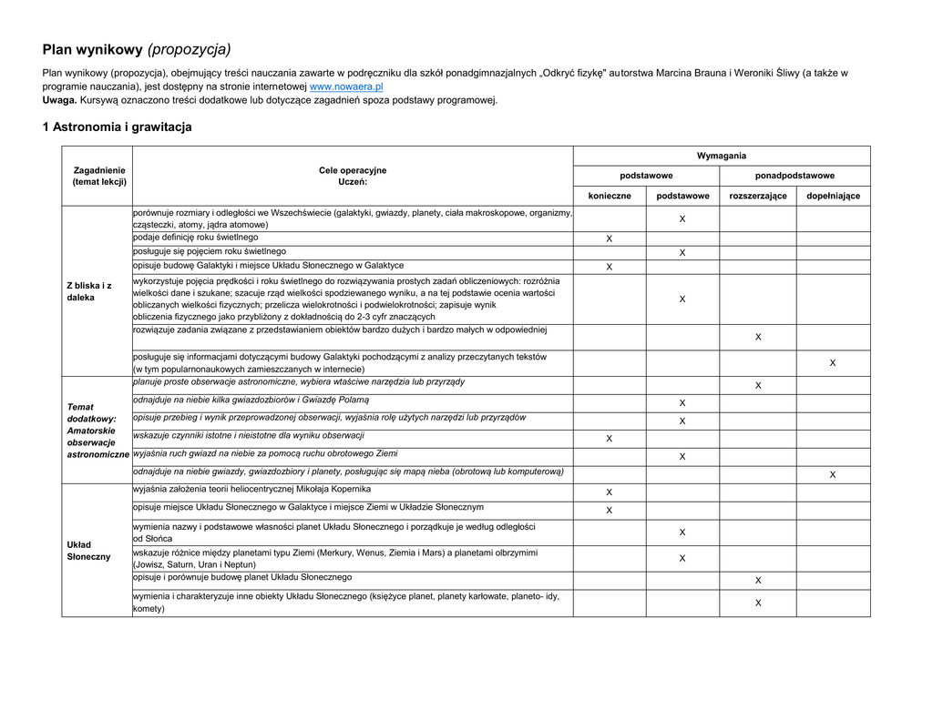 Plan wynikowy (propozycja) Plan wynikowy (propozycja), obejmujący treści nauczania zawarte w podręczniku dla szkół ponadgimnazjalnych „Odkryć fizykę" autorstwa Marcina Brauna i Weroniki Śliwy (a także w programie nauczania), jest dostępny na stronie internetowej www.nowaera.pl Uwaga. Kursywą oznaczono treści dodatkowe lub dotyczące zagadnień spoza podstawy programowej. 1 Astronomia i grawitacja Wymagania Zagadnienie (temat lekcji) Cele operacyjne Uczeń: podstawowe konieczne porównuje rozmiary i odległości we Wszechświecie (galaktyki, gwiazdy, planety, ciała makroskopowe, organizmy, cząsteczki, atomy, jądra atomowe) podaje definicję roku świetlnego Z bliska i z daleka podstawowe X X X X posługuje się informacjami dotyczącymi budowy Galaktyki pochodzącymi z analizy przeczytanych tekstów (w tym popularnonaukowych zamieszczanych w internecie) planuje proste obserwacje astronomiczne, wybiera wtaściwe narzędzia lub przyrządy X X odnajduje na niebie kilka gwiazdozbiorów i Gwiazdę Polarną X X X X odnajduje na niebie gwiazdy, gwiazdozbiory i planety, posługując się mapą nieba (obrotową lub komputerową) Układ Słoneczny X wyjaśnia założenia teorii heliocentrycznej Mikołaja Kopernika X opisuje miejsce Układu Słonecznego w Galaktyce i miejsce Ziemi w Układzie Słonecznym X wymienia nazwy i podstawowe własności planet Układu Słonecznego i porządkuje je według odległości od Słońca wskazuje różnice między planetami typu Ziemi (Merkury, Wenus, Ziemia i Mars) a planetami olbrzymimi (Jowisz, Saturn, Uran i Neptun) opisuje i porównuje budowę planet Układu Słonecznego wymienia i charakteryzuje inne obiekty Układu Słonecznego (księżyce planet, planety karłowate, planeto- idy, komety) dopełniające X wykorzystuje pojęcia prędkości i roku świetlnego do rozwiązywania prostych zadań obliczeniowych: rozróżnia wielkości dane i szukane; szacuje rząd wielkości spodziewanego wyniku, a na tej podstawie ocenia wartości obliczanych wielkości fizycznych; przelicza wielokrotności i podwielokrotności; zapisuje wynik obliczenia fizycznego jako przybliżony z dokładnością do 2-3 cyfr znaczących rozwiązuje zadania związane z przedstawianiem obiektów bardzo dużych i bardzo małych w odpowiedniej Temat opisuje przebieg i wynik przeprowadzonej obserwacji, wyjaśnia rolę użytych narzędzi lub przyrządów dodatkowy: Amatorskie wskazuje czynniki istotne i nieistotne dla wyniku obserwacji obserwacje astronomiczne wyjaśnia ruch gwiazd na niebie za pomocą ruchu obrotowego Ziemi rozszerzające X posługuje się pojęciem roku świetlnego opisuje budowę Galaktyki i miejsce Układu Słonecznego w Galaktyce ponadpodstawowe X X X X Wymagania Zagadnienie (temat lekcji) Cele operacyjne Uczeń: podstawowe konieczne wyjaśnia obserwowany na niebie ruch planet wśród gwiazd jako złożenie ruchów obiegowych: Ziemi i obserwowanej planety rozwiązuje proste zadania związane z budową Układu Słonecznego ponadpodstawowe podstawowe Księżyc towarzysz Ziemi X X X wyjaśnia przyczynę występowania faz i zaćmień Księżyca X wykorzystuje wiedzę o charakterze naukowym do formułowania wniosków opartych na obserwacjach empirycznych dotyczących faz i zaćmień Księżyca X wyjaśnia, w której fazie Księżyca można obserwować zaćmienie Słońca, a w której Księżyca, i dlaczego nie następują one w każdej pełni i w każdym nowiu wyjaśnia, dlaczego mieszkaniec Ziemi częściej obserwuje zaćmienia Księżyca niż zaćmienia Słońca opisuje Słońce jako jedną z gwiazd, a Galaktykę (Drogę Mleczną) jako jedną z wielu galaktyk we Wszechświecie wyjaśnia, na czym polega zjawisko paralaksy opisuje zasadę pomiaru odległości dzielącej Ziemię od Księżyca i planet opartą na paralaksie i zasadę pomiaru odległości od najbliższych gwiazd opartą na paralaksie rocznej przedstawia graficznie zasadę wyznaczania odległości za pomocą paralaks geo- i heliocetrycznej Gwiazdy i galaktyki X opisuje warunki panujące na Księżycu posługuje się informacjami dotyczącymi zaćmień Księżyca i Słońca pochodzącymi z analizy przeczytanych tekstów, w tym popularnonaukowych opisuje gwiazdy jako naturalne źródła światła rozwiązuje proste zadania obliczeniowe z wykorzystaniem zasady paralaksy: szacuje rząd wielkości spodziewanego wyniku, a na tej podstawie ocenia wartości obliczanych wielkości fizycznych; przelicza wielokrotności i podwielokrotności; rozróżnia wielkości dane i szukane; zapisuje wynik pomiaru lub obliczenia fizycznego jako przybliżony z dokładnością do 2-3 cyfr znaczących oblicza odległość do gwiazdy (w parsekach) na podstawie jej kąta paralaksy posługuje się jednostkami: parsek, rok świetlny, jednostka astronomiczna wyjaśnia, dlaczego Galaktyka widziana jest z Ziemi w postaci smugi na nocnym niebie posługuje się informacjami dotyczącymi klasyfikacji gwiazd i galaktyk pochodzącymi z analizy przeczytanych tekstów, w tym popularnonaukowych dopełniające X posługuje się informacjami dotyczącymi budowy Układu Słonecznego, a także poszukiwań życia poza Ziemią, pochodzącymi z analizy przeczytanych tekstów (w tym popularnonaukowych zamieszczanych w internecie) wyjaśnia, dlaczego zawsze widzimy tę samą stronę Księżyca rozszerzające X X X X X X X X X X X X X Wymagania Zagadnienie (temat lekcji) Cele operacyjne Uczeń: podstawowe podstawowe przedstawia graficznie wektor prędkości w ruchu prostoliniowym i krzywoliniowym ponadpodstawowe rozszerzające Ruch krzywoliniowy podaje przykłady ruchu krzywoliniowego, szczególnie ruchu jednostajnego po okręgu X X X X rozwiązuje proste zadania obliczeniowe związane z ruchem jednostajnym po okręgu: rozróżnia wielkości dane i szukane; przelicza wielokrotności i podwielokrotności; szacuje rząd wielkości spodziewanego wyniku, a na tej podstawie ocenia wartości obliczanych wielkości fizycznych; zapisuje wynik obliczenia fizycz