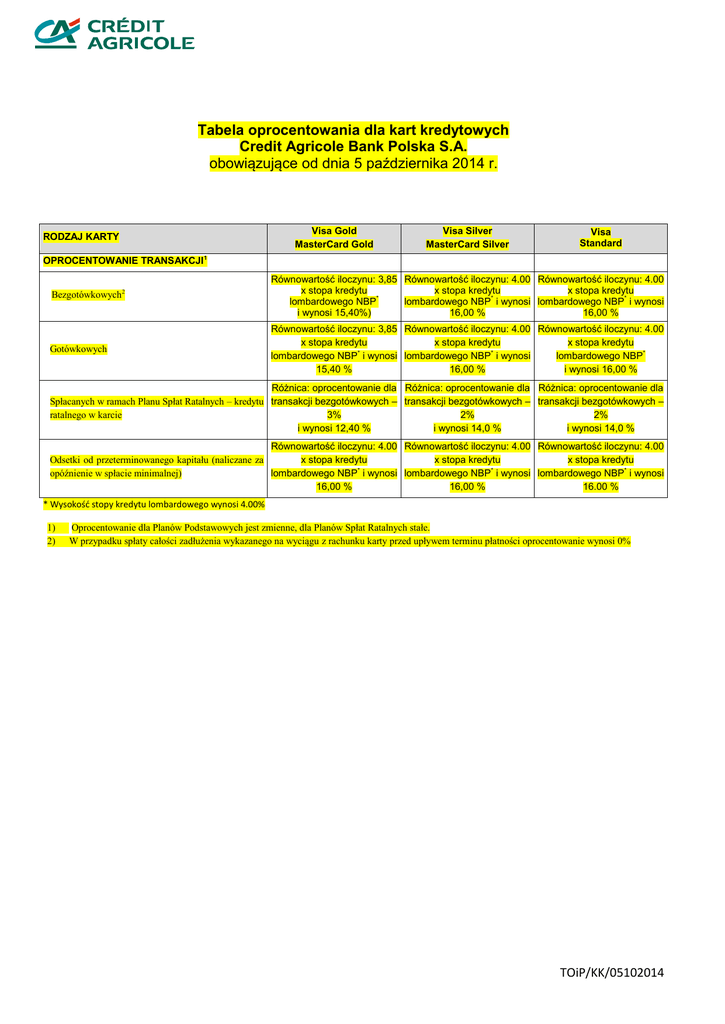 Tabela oprocentowania dla kart kredytowych Credit Agricole Bank Polska S.A. obowiązujące od dnia 5 października 2014 r. RODZAJ KARTY Visa Gold MasterCard Gold Visa Silver MasterCard Silver Visa Standard OPROCENTOWANIE TRANSAKCJI1 Bezgotówkowych2 Równowartość iloczynu: 3,85 Równowartość iloczynu: 4.00 Równowartość iloczynu: 4.00 x stopa kredytu x stopa kredytu x stopa kredytu lombardowego NBP* lombardowego NBP* i wynosi lombardowego NBP* i wynosi i wynosi 15,40%) 16,00 % 16,00 % Gotówkowych Równowartość iloczynu: 3,85 Równowartość iloczynu: 4.00 Równowartość iloczynu: 4.00 x stopa kredytu x stopa kredytu x stopa kredytu lombardowego NBP* i wynosi lombardowego NBP* i wynosi lombardowego NBP* 15,40 % 16,00 % i wynosi 16,00 % Różnica: oprocentowanie dla Różnica: oprocentowanie dla Różnica: oprocentowanie dla Spłacanych w ramach Planu Spłat Ratalnych – kredytu transakcji bezgotówkowych – transakcji bezgotówkowych – transakcji bezgotówkowych – ratalnego w karcie 3% 2% 2% i wynosi 12,40 % i wynosi 14,0 % i wynosi 14,0 % Równowartość iloczynu: 4.00 Równowartość iloczynu: 4.00 Równowartość iloczynu: 4.00 Odsetki od przeterminowanego kapitału (naliczane za x stopa kredytu x stopa kredytu x stopa kredytu opóźnienie w spłacie minimalnej) lombardowego NBP* i wynosi lombardowego NBP* i wynosi lombardowego NBP* i wynosi 16,00 % 16,00 % 16.00 % * Wysokość stopy kredytu lombardowego wynosi 4.00% 1) 2) Oprocentowanie dla Planów Podstawowych jest zmienne, dla Planów Spłat Ratalnych stałe. W przypadku spłaty całości zadłużenia wykazanego na wyciągu z rachunku karty przed upływem terminu płatności oprocentowanie wynosi 0% TOiP/KK/05102014