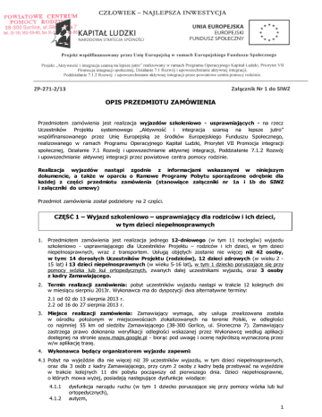CZŁOWIEK – NAJLEPSZA INWESTYCJA Projekt współfinansowany przez Unię Europejską w ramach Europejskiego Funduszu S połecznego Projekt „Aktywność i integracja szansą na lepsze jutro” realizowany w ramach Programu Operacyjnego Kapitał Ludzki, Priorytet VII Promocja integracji społecznej, Działanie 7.1 Rozwój i upowszechnianie aktywnej integracji, Poddziałanie 7.1.2 Rozwój i upowszechnianie aktywnej integracji przez powiatowe centra pomocy rodzinie. ZP-271-2/13 Załącznik Nr 1 do SIWZ OPIS PRZEDMIOTU ZAMÓWIENIA Przedmiotem zamówienia jest realizacja wyjazdów szkoleniowo - usprawniających - na rzecz Uczestników Projektu systemowego „Aktywność i integracja szansą na lepsze jutro” współfinansowanego przez Unię Europejską ze środków Europejskiego Funduszu Społecznego, realizowanego w ramach Programu Operacyjnego Kapitał Ludzki, Priorytet VII Promocja integracji społecznej, Działanie 7.1 Rozwój i upowszechnianie aktywnej integracji, Poddziałanie 7.1.2 Rozwój i upowszechnianie aktywnej integracji przez powiatowe centra pomocy rodzinie. Realizacja wyjazdów nastąpi zgodnie z informacjami wskazanymi w niniejszym dokumencie, a także w oparciu o Ramowe Programy Pobytu sporządzone odrębnie dla każdej z części przedmiotu zamówienia (stanowiące załączniki nr 1a i 1b do SIWZ i załączniki do umowy) Przedmiot zamówienia został podzielony na 2 części. CZĘŚĆ 1 – Wyjazd podsumowująco – szkoleniowy dlai Uczestników CZĘŚĆ 1 – Wyjazd szkoleniowo – usprawniający dla rodziców ich dzieci, Projektu (RP) grupa I dzieci niepełnosprawnych w tym 1. Przedmiotem zamówienia jest realizacja jednego 12-dniowego (w tym 11 noclegów) wyjazdu szkoleniowo - usprawniającego dla Uczestników Projektu – rodziców i ich dzieci, w tym dzieci niepełnosprawnych, wraz z transportem. Usługą objętych zostanie nie więcej niż 42 osoby, w tym: 14 dorosłych Uczestników Projektu (rodziców), 12 dzieci zdrowych (w wieku 2 15 lat) i 13 dzieci niepełnosprawnych (w wieku 5-16 lat), w tym 1 dziecko poruszające się przy pomocy wózka lub kul ortopedycznych, zwanych dalej uczestnikami wyjazdu, oraz 3 osoby z kadry Zamawiającego. 2. Termin realizacji zamówienia: pobyt uczestników wyjazdu nastąpi w trakcie 12 kolejnych dni w miesiącu sierpniu 2013r. Wykonawca ma do dyspozycji dwa alternatywne terminy: 2.1 od 02 do 13 sierpnia 2013 r. 2.2 od 16 do 27 sierpnia 2013 r. 3. Miejsce realizacji zamówienia: Zamawiający wymaga, aby usługa zrealizowana została w ośrodku położonym w miejscowościach zlokalizowanych na terenie Polski, w odległości co najmniej 55 km od siedziby Zamawiającego (38-300 Gorlice, ul. Słoneczna 7). Zamawiający zastrzega prawo dokonania weryfikacji odległości wskazanej przez Wykonawcę według aplikacji dostępnej na stronie www.maps.google.pl - biorąc pod uwagę i ocenę najkrótszą wyznaczoną przez w/w aplikację trasę. 4. Wykonawca będący organizatorem wyjazdu zapewni: 4.1 Pobyt na wyjeździe dla nie więcej niż 39 uczestników wyjazdu, w tym dzieci niepełnosprawnych, oraz dla 3 osób z kadry Zamawiającego, przy czym 2 osoby z kadry będą przebywać na wyjeździe w trakcie kolejnych 11 dni pobytu począwszy od pierwszego dnia. Dzieci niepełnosprawne, o których mowa wyżej, posiadają następujące dysfunkcje wiodące: 4.1.1 4.1.2 dysfunkcja narządu ruchu (w tym 1 dziecko poruszające się przy pomocy wózka lub kul ortopedycznych), autyzm, 1 4.1.3 4.1.4 4.1.5 4.1.6 dziecięce porażenie mózgowe, epilepsja, niedosłuch, rozszczep kręgosłupa. 4.2 Zakwaterowanie w obiekcie, który spełnia następujące warunki: 4.2.1 uzyskał wpis do rejestru ośrodków prowadzonego przez właściwego wojewodę na podstawie rozporządzenia Ministra Pracy i Polityki Społecznej z dnia 15 listopada 2007 roku w sprawie turnusów rehabilitacyjnych (Dz. U. Nr 230 poz.1694), 4.2.2 spełnia wymogi bezpieczeństwa, w szczególności w zakresie ochrony przeciwpożarowej, 4.2.3 posiada jest przystosowany do przyjmowania niepełnosprawnych z dysfunkcjami, o których mowa w pkt 4.1, 4.2.4 posiada zaplecze do przeprowadzania do schorzeń wskazanych w pkt 4.1, 4.2.5 posiada zaplecze do realizacji aktywnych form rehabilitacji, umożliwiające prowadzenie zajęć ukierunkowanych na poprawę psychofizycznej sprawności niepełnosprawnych dzieci uczestników wyjazdu, 4.2.6 posiada zaplecze rekreacyjno – wypoczynkowe, 4.2.7 zakwaterowanie uczestników wyjazdu w dwu/trzy/cztero – osobowych pokojach, z pełnym węzłem sanitarnym – wc, umywalka, natrysk w każdym pokoju (z całodobowym dostępem do ciepłej i zimnej wody). Uczestnicy wyjazdu muszą być usytuowani w pokojach blisko siebie, w jednym budynku. zabiegów zorganizowanych fizjoterapeutycznych, grup osób adekwatnych UWAGA Wymaga się, aby dziecko poruszające się przy pomocy kul ortopedycznych lub wózka inwalidzkiego zostało zakwaterowane wraz z opiekunem (rodzicem) w pokoju dostosowanym do dysfunkcji narządu ruchu, posiadającym pomieszczenie higieniczno – sanitarne o powierzchni umożliwiającej swobodę poruszania się, wyposażone w uchwyty zapewniające bezpieczeństwo korzystania z sedesu, ławkę lub siedzisko pod natryskiem. Wyposażenie, a także rozmieszczenie tego wyposażenia w w/w pokoju i pomieszczeniach ogólnego użytku ma zapewnić swobodę ruchu i użytkowania tego wyposażenia przez dziecko, o którym mowa w zdaniu pierwszym. Usytuowanie pokoi i pomieszczeń ogólnego użytku ma umożliwić w/w dziecku swobodne poruszanie się po terenie ośrodka i kontakt z pracownikami Wykonawcy (obsługą) oraz z pozostałymi uczestnikami wyjazdu, jak również bezproblemowy udział w zajęciach organizowanych w trakcie pobytu. Szczegóły dotyczące liczby pokoi wieloosobowych i rozmieszczenia w nich osób zostaną ustalone z Wykonawcą w terminie z nim uzgodnionym. Wykonawca zobowiązany jest uwzględnić fakt, iż rodzice muszą być zakwaterowani w jednym pokoju ze
