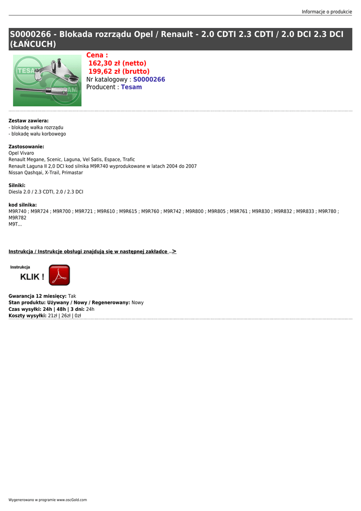 Informacje o produkcie S0000266 - Blokada rozrządu Opel / Renault - 2.0 CDTI 2.3 CDTI / 2.0 DCI 2.3 DCI (ŁAŃCUCH) Cena : 162,30 zł (netto) 199,62 zł (brutto) Nr katalogowy : S0000266 Producent : Tesam Zestaw zawiera: - blokadę wałka rozrządu - blokadę wału korbowego Zastosowanie: Opel Vivaro Renault Megane, Scenic, Laguna, Vel Satis, Espace, Trafic Renault Laguna II 2,0 DCI kod silnika M9R740 wyprodukowane w latach 2004 do 2007 Nissan Qashqai, X-Trail, Primastar Silniki: Diesla 2.0 / 2.3 CDTI, 2.0 / 2.3 DCI kod silnika: M9R740 ; M9R724 ; M9R700 ; M9R721 ; M9R610 ; M9R615 ; M9R760 ; M9R742 ; M9R800 ; M9R805 ; M9R761 ; M9R830 ; M9R832 ; M9R833 ; M9R780 ; M9R782 M9T... rozrzadu Instrukcja / Instrukcje obsługi znajdują się w następnej zakładce Gwarancja 12 miesięcy: Tak Stan produktu: Używany / Nowy / Regenerowany: Nowy Czas wysyłki: 24h | 48h | 3 dni: 24h Koszty wysyłki: 21zł | 26zł | 0zł Wygenerowano w programie www.oscGold.com > ----