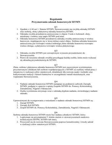 Regulamin Przyznawania odznak honorowych SITMN §1 1. Zgodnie z § 44 ust 1. Statutu SITMN, Stowarzyszenie ma zwykłą odznakę SITMN oraz srebrną, złotą i platynową odznakę honorową SITMN. 2. Odznaka zwykła przedstawia umieszczone w elipsie 3 koła w kolorach: złoty, miedziany i srebrny oraz napis SITMN pod nimi. 3. Odznaka honorowa SITMN przedstawia odznakę zwykłą umieszczoną w wieńcu laurowym, znajdującym się w lewej dolnej części elipsy. Srebrna odznaka honorowa umieszczona jest wewnątrz wieńca srebrnego,złota odznaka honorowa wewnątrz wieńca złotego, a platynowa wewnątrz wieńca platynowego §2 1. Odznaka zwykła SITMN jest zewnętrznym wyrazem przynależności do Stowarzyszenia. 2. Prawo do noszenia odznaki zwykłej przysługuje każdej osobie, która może wykazać się aktualną przynależnością do SITMN. §3 Złota, srebrna i platynowa odznaka honorowa SITMN jest zaszczytnym wyróżnieniem, przyznawanym członkom lub osobom współpracującym z SITMN za osobisty wkład pracy i inicjatywę w realizacji celów statutowych, działalność dla rozwoju nauki i techniki oraz kultywowanie tradycji i historii hutnictwa w szczególności metali nieżelaznych, oraz wspieranie Stowarzyszenia. §4 1. Nadanie odznaki honorowej SITMN następuje na podstawie uchwały Zarządu SITMN, podjętej w oparciu o opinię Zespołu SITMN ds. Pomocy Koleżeńskiej, Zatrudnienia, Nagród i Odznaczeń. 2. Osoba wyróżniona otrzymuje wraz z odznaką dyplom nadania, stwierdzający nadanie odznaki. §5 Uprawnionymi do występowania z wnioskami o nadanie odznaki honorowej SITMN są: 1. Zarząd SITMN. 2. Zarządy Kół SITMN. 3. Zespół SITMN ds. Pomocy Koleżeńskiej, Zatrudnienia, Nagród i Odznaczeń. §6 Srebrna odznaka honorowa SITMN może być nadana członkowi SITMN, który: 1. Legitymuje się przynajmniej 5–letnim stażem w stowarzyszeniach naukowotechnicznych (SITPH, SITMN lub inne), 2. Przyczynił się do rozwoju Stowarzyszenia poprzez konsekwentny i trwały udział w realizacji celów statutowych SITMN. §7 Złota odznaka honorowa SITMN może być nadana członkowi SITMN, który: 1. Posiada srebrną odznakę SITMN (SNT, NOT) co najmniej przez okres 3–letni i wyróżnił się wybitnymi osiągnięciami w dziedzinie techniki lub pracy społecznej na rzecz Stowarzyszenia. 2. W uzasadnionych przypadkach Zarząd SITMN może podjąć decyzję o nadaniu złotej honorowej odznaki SITMN osobie nie posiadającej srebrnej odznaki honorowej SITMN. §8 Okazją do nadawania i wręczania odznaczeń są: Zebrania Delegatów Stowarzyszenia, kwartalne konferencje naukowo – techniczne, Walne Zebrania Członków Koła, uroczystości jubileuszowe i inne ważne wydarzenia stowarzyszeniowe. §9 Wręczenia honorowych odznak SITMN łącznie z dyplomem nadania dokonuje Prezes Zarządu SITMN lub osoba reprezentująca Zarząd SITMN. § 10 1. Zarząd SITMN ma prawo podjąć uchwałę o pozbawieniu odznaki honorowej SITMN w razie stwierdzenia, że jej nadanie nastąpiło wskutek wprowadzenia w błąd lub w przypadku, gdy osoba wyróżniona stała się niegodna posiadania odznaki. 2. Utrata odznaki honorowej SITMN następuje w przypadku prawomocnego wyroku sądu powszechnego, skazującego osobę odznaczoną na karę pozbawienia praw publicznych. § 11 W przypadku zagubienia dyplomu nadania lub odznaki Biuro Zarządu SITMN wydaje duplikat na wniosek odznaczonego. § 12 1. Wnioskodawcy, wyszczególnieni w § 5, składają wnioski do Biura Zarządu SITMN na formularzach (załącznik numer 1do niniejszego Regulaminu). Biuro przekazuje wnioski do zaopiniowania do Zespołu SITMN ds. Pomocy Koleżeńskiej, Zatrudnienia, Nagród i Odznaczeń w terminie co najmniej 30 dni przed planowanym wręczeniem. 2. Każdy wniosek, zgodnie z treścią formularza, opiniuje Zarząd Koła SITMN, Zespół ds. Pomocy Koleżeńskiej, Zatrudnienia, Nagród i Odznaczeń oraz Zarząd SITMN. Niniejszy Regulamin został uchwalony przez Prezydium Zarządu SITMN w dniu: 13 września 2005r i zatwierdzony przez Zarząd SITMN w dniu: ………………... Zmiany: 26.03.2011