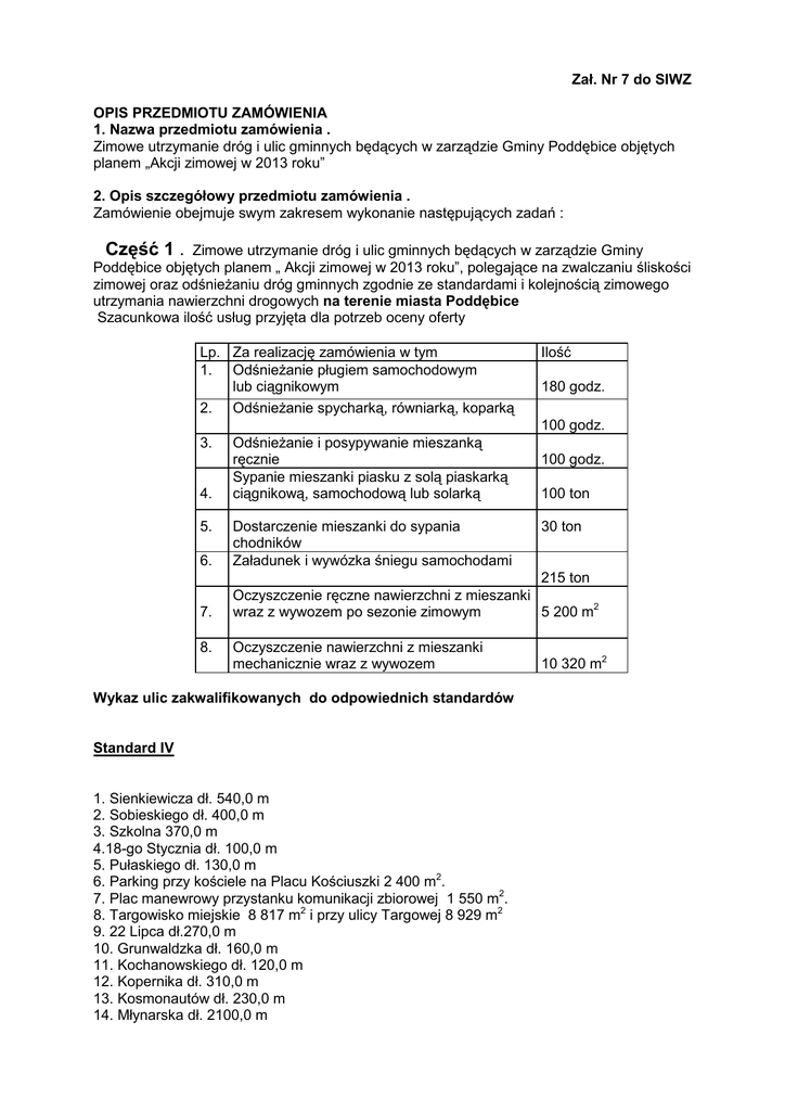 Zał. Nr 7 do SIWZ OPIS PRZEDMIOTU ZAMÓWIENIA 1. Nazwa przedmiotu zamówienia . Zimowe utrzymanie dróg i ulic gminnych będących w zarządzie Gminy Poddębice objętych planem „Akcji zimowej w 2013 roku” 2. Opis szczegółowy przedmiotu zamówienia . Zamówienie obejmuje swym zakresem wykonanie następujących zadań : Część 1 . Zimowe utrzymanie dróg i ulic gminnych będących w zarządzie Gminy Poddębice objętych planem „ Akcji zimowej w 2013 roku”, polegające na zwalczaniu śliskości zimowej oraz odśnieżaniu dróg gminnych zgodnie ze standardami i kolejnością zimowego utrzymania nawierzchni drogowych na terenie miasta Poddębice Szacunkowa ilość usług przyjęta dla potrzeb oceny oferty Lp. Za realizację zamówienia w tym 1. Odśnieżanie pługiem samochodowym lub ciągnikowym 2. Odśnieżanie spycharką, równiarką, koparką Ilość 180 godz. 100 godz. 3. 4. 5. Odśnieżanie i posypywanie mieszanką ręcznie Sypanie mieszanki piasku z solą piaskarką ciągnikową, samochodową lub solarką 100 godz. 100 ton 6. Dostarczenie mieszanki do sypania chodników Załadunek i wywózka śniegu samochodami 7. 215 ton Oczyszczenie ręczne nawierzchni z mieszanki wraz z wywozem po sezonie zimowym 5 200 m2 8. Oczyszczenie nawierzchni z mieszanki mechanicznie wraz z wywozem Wykaz ulic zakwalifikowanych do odpowiednich standardów Standard IV 1. Sienkiewicza dł. 540,0 m 2. Sobieskiego dł. 400,0 m 3. Szkolna 370,0 m 4.18-go Stycznia dł. 100,0 m 5. Pułaskiego dł. 130,0 m 6. Parking przy kościele na Placu Kościuszki 2 400 m2. 7. Plac manewrowy przystanku komunikacji zbiorowej 1 550 m2. 8. Targowisko miejskie 8 817 m2 i przy ulicy Targowej 8 929 m2 9. 22 Lipca dł.270,0 m 10. Grunwaldzka dł. 160,0 m 11. Kochanowskiego dł. 120,0 m 12. Kopernika dł. 310,0 m 13. Kosmonautów dł. 230,0 m 14. Młynarska dł. 2100,0 m 30 ton 10 320 m2 15. Morelowa dł. 150,0 m 16. Nowa dł. 50,0 m 17. Ogrodowa dł. 210,0 m 18. 18-go Stycznia dł. 100,0 m 19. Partyzantów dł. 1700,0 m 20. Poprzeczna dł. 260,0 m 21. Reja dł. 270,0 m 22. Rzemieślnicza dł. 400,0 m 23. Świerczewskiego dł. 140,0 m 24. Wyzwolenia dł. 150,0 m 25. Plac Kościuszki od ul. Kilińskiego do ul. Przejazd i od ul. Przejazd do ul. Pułaskiego ) dł. 595,0 26. Mickiewicza ( od Pl. Kościuszki do ul. Targowej ) dł. 558,0 m 27. Przejazd ( od Pl. Kościuszki do ul. Narutowicza ) dł. 102,0 m 28. Narutowicza dł. 520,0 m 29. Polna ( od ul. Mickiewicza do ul. Narutowicza ) dł. 130,0 m 30. Kilińskiego ( od ul. Piotrowskiego do Pl. Kościuszki) dł. 260,0 m Standard V 1. Dojazd dł. 150,0 m 2. Przyszłość dł. 150,0 m 3. Konopnickiej dł. 160,0 m 4. Miła dł. 590,0 m 5. Spacerowa dł. 130,0 m 6. Piękna dł. 140,0 m 7. Pogodna dł. 320,0 m 8. Radosna dł. 700,0 m 9. Słoneczna dł. 170 m 10. Cicha dł. 80 m 11. Wesoła dł. 350,0 m 12. Baczyńskiego dł. 260,0 m 13. Deczyńskiego dł. 160,0 m 14. Dębowa dł. 90,0 m 15. Spokojna dł. 270,0 m 16. Brzozowa dł. 200,0 m 17. Cmentarna dł. 120,0 m 18. Kilińskiego dł. 180,0 m 19. Nadrzeczna dł. 170,0 m 20. Wiejska dł. 240,0 m 21. Wiśniowa dł. 260,0 m 22. Wodna dł. 80,0 m Standard VI 1. 2. 3. 4. 5. Piaskowa dł. 160,0 m Zacisze dł. 160,0 m Leśna dł. 230,0 m Przejazd dł. 900,0 m Sosnowa dł. 200,0 m WYKAZ CHODNIKÓW PRZEWIDZIANYCH DO ODŚNIEŻANIA I POSYPYWANIA 1. Chodniki przy kościele na Placu Kościuszki 2. Chodniki wokół placu manewrowego przystanku komunikacji zbiorowej 3.Chodniki wokół Urzędu Miejskiego 4.Chodnik przy ul. Sobieskiego- strona południowa 5.Chodnik przy ul. Zielonej – odcinek od ul. Kosmonautów do ul. Przejazd 6.Chodnik od ronda na ul. Łęczyckiej ( skrzyżowanie z ul. Krasickiego) w stronę ul. Słonecznej 7.Chodnik przy ul. Przejazd przy cmentarzu 8. Chodnik przy ul. Mickiewicza ( odcinek od ul. Konopnickiej do liceum) WYKAZ MIEJSC DO USTAWIENIA POJEMNIKÓW NA PIASEK DO POSYPYWANIA CHODNIKÓW 1. Budynek Urzędu Miejskiego - 2 szt. 2. Na przystankach komunikacji zbiorowej – 2 szt. 3. Plac przy kościele na Placu Kościuszki – 2 szt. 4. Targowisko miejskie - 2 szt. 5. ul. Przejazd przy cmentarzu – 1 szt. 6.Chodnik od ronda na ul. Łęczyckiej ( skrzyżowanie z ul. Krasickiego) w stronę ul. Słonecznej – 1 szt. Część 2 . Zimowe utrzymanie dróg i ulic gminnych będących w zarządzie Gminy Poddębice objętych planem „ Akcji zimowej w 2013 roku”, polegające na zwalczaniu śliskości zimowej oraz odśnieżaniu dróg gminnych zgodnie ze standardami i kolejnością zimowego utrzymania nawierzchni drogowych na terenie gminy Poddębice Szacunkowa ilość usług przyjęta dla potrzeb oceny oferty Lp. Za realizację zamówienia w tym 1. Odśnieżanie pługiem samochodowym lub ciągnikowym Odśnieżanie spycharką, równiarką, 2. Koparką 3. 4. Sypanie mieszanki piasku z solą piaskarką ciągnikową, samochodową lub solarką Dojazd do dróg poza teren miasta Poddębice Ilość 400 km 180 km 120 ton 500 km Wykaz dróg gminnych zakwalifikowanych do odpowiednich standardów Standard IV 1. Bałdrzychów – Góra Bałdrzychowska dł. 2,8 km 2. od drogi pow. Niewiesz-Bronów do wsi Józefów i przez wieś Józefów i do Sempółek dł. 4,8 km 3. od drogi pow. Praga – Pudłowek przez wieś Podgórcze dł. 3,3 km 4. Kolonia Bali n- Gibaszew- Dzierzązna – Lubiszewie gr. gm Pęczniew dł. 8,1 km 5. Poddębice – Sworawa – Małe dł. 3,8 km 6. od drogi pow. Poddębice – Brudnów – do Golic – droga pow. Poddębice Brudnów dł. 3,0 km 7.Poddębice – Kol. Byczyna do dr. pow. Poddębice – Ciężków – 3.1 km Standard V 1. dr. gminna Pudłów St. – Pudłów N. dł. 3,0 km 2. dr. gminna Góra Bałrzychowska – Feliksów –do dr. pow. Pudłówek –Ruda dł. – 6,2 km 3. droga gminna Leokadiew Tumusin dł. – 3,0 4. droga gminna przez wieś Panaszew w kierunku Krzemieniewa dł. -1,2 km 5. od drogi pow. Poddębice – Brudnów przez wieś Tarnowę do granicy gminy dł. 3,1 km 6. przez wieś Mrowiczna dł. 2,0 