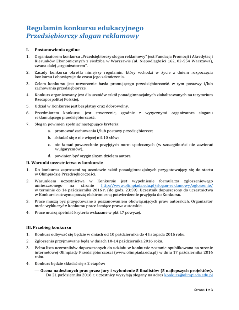 Regulamin konkursu edukacyjnego Przedsiębiorczy slogan reklamowy I. Postanowienia ogólne 1. Organizatorem konkursu „Przedsiębiorczy slogan reklamowy” jest Fundacja Promocji i Akredytacji Kierunków Ekonomicznych z siedzibą w Warszawie (al. Niepodległości 162, 02-554 Warszawa), zwana dalej „organizatorem”. 2. Zasady konkursu określa niniejszy regulamin, który wchodzi w życie z dniem rozpoczęcia konkursu i obowiązuje do czasu jego zakończenia. 3. Celem konkursu jest utworzenie hasła promującego przedsiębiorczość, w tym postawy i/lub zachowania przedsiębiorcze. 4. Konkurs organizowany jest dla uczniów szkół ponadgimnazjalnych zlokalizowanych na terytorium Rzeczpospolitej Polskiej. 5. Udział w Konkursie jest bezpłatny oraz dobrowolny. 6. Przedmiotem konkursu jest stworzenie, zgodnie z wytycznymi organizatora sloganu reklamującego przedsiębiorczość. 7. Slogan powinien spełniać następujące kryteria: a. promować zachowania i/lub postawy przedsiębiorcze; b. składać się z nie więcej niż 10 słów; c. nie łamać powszechnie przyjętych norm społecznych (w szczególności nie zawierać wulgaryzmów), d. powinien być oryginalnym dziełem autora II. Warunki uczestnictwa w konkursie 1. Do konkursu zaproszeni są uczniowie szkół ponadgimnazjalnych przygotowujący się do startu w Olimpiadzie Przedsiębiorczości. 2. Warunkiem uczestnictwa w Konkursie jest wypełnienie formularza zgłoszeniowego umieszczonego na stronie http://www.olimpiada.edu.pl/slogan-reklamowy/zgloszenie/ w terminie do 14 października 2016 r. (do godz. 23:59). Uczestnik dopuszczony do uczestnictwa w Konkursie otrzyma pocztą elektroniczną potwierdzenie przyjęcia do Konkursu. 3. Prace muszą być przygotowane z poszanowaniem obowiązujących praw autorskich. Organizator może wykluczyć z konkursu prace łamiące prawa autorskie. 4. Prace muszą spełniać kryteria wskazane w pkt I.7 powyżej. III. Przebieg konkursu 1. Konkurs odbywać się będzie w dniach od 10 października do 4 listopada 2016 roku. 2. Zgłoszenia przyjmowane będą w dniach 10-14 października 2016 roku. 3. Pełna lista uczestników dopuszczonych do udziału w konkursie zostanie opublikowana na stronie internetowej Olimpiady Przedsiębiorczości (www.olimpiada.edu.pl) w dniu 17 października 2016 roku. 4. Konkurs będzie składać się z 2 etapów: Ocena nadesłanych prac przez jury i wyłonienie 5 finalistów (5 najlepszych projektów). Do 21 października 2016 r. uczestnicy wysyłają slogany na adres [email protected] Strona 1 z 3 zgodnie z wytycznymi podanymi w punkcie I.7 regulaminu. Każdy z uczestników może przysłać maksymalnie 3 propozycje. Prace oceni trzyosobowe jury konkursowe. Każdy z członków jury może przyznać uczestnikowi konkursu od 0 do 10 punktów, co oznacza, że z oceny jury każda praca może maksymalnie otrzymać 30 punktów. O kolejności miejsc uczestników zadecyduje punktacja łączna. W przypadku remisu punktowego o ostatecznej kolejności zadecyduje jury. Lista 5 finalistów zostanie ogłoszona 24 października 2016 roku. Finał: a. Głosowanie w serwisie Facebook. W dniu 24 października 2016 roku Organizatorzy opublikują na fanpage’u Olimpiady Przedsiębiorczości w serwisie Facebook w osobnych wpisach informacje o finałowych sloganach (w kolejności losowej). W każdym wpisie znajdzie się slogan z ilustracją dobraną przez organizatorów. Wpisy o każdym sloganie będzie można komentować, a także polubić (przy użyciu funkcji „like”) w okresie od 24 do 2 listopada 2016 roku. Stan like’ów każdego wpisu zostanie zapisany na koniec etapu finałowego (2 listopada 2016 roku, godz. 15.00) i wykorzystany do przyznania oceny, która będzie stanowiła drugą składową oceny finałowej konkursu. Za stan like’ów każda praca może otrzymać 1, 2, 3, 4 lub 5 punktów. O liczbie punktów decyduje kolejność – praca z największą liczbą like’ów otrzymuje 5 punktów, ta z najmniejszą 1 punkt. b. Wynik końcowy. O kolejności miejsc finalistów zadecyduje punktacja sumaryczna – z oceny jury konkursowego oraz głosowania w serwisie Facebook. W przypadku remisu punktowego o ostatecznej kolejności zadecyduje jury. Ogłoszenie wyników. Oficjalne wyniki zostaną ogłoszone 4 listopada 2016 r. na stronie www.olimpiada.edu.pl. 5. Finaliści zostaną nagrodzeni bonami prezentowymi do wykorzystania w salonach Empik o wartości: 350 zł dla laureata I miejsca, 250 zł dla laureata II miejsca 200 zł dla laureata III miejsca, 100 zł dla laureata IV i V miejsca. IV. Postanowienia końcowe 1. Organizator zastrzega sobie możliwość odwołania konkursu, w szczególności z uwagi na niskie zainteresowanie lub względnie niski poziom prac konkursowych. 2. Regulamin konkursu dostępny jest w siedzibie organizatora oraz na stronie internetowej www.olimpiada.edu.pl. 3. Uczestnikom nie przysługuje wynagrodzenie za uczestnictwo w konkursie, wykorzystywanie przez organizatora elementów zgłoszenia w jakikolwiek sposób. 4. Przesyłając zgłoszenie do konkursu uczestnik potwierdza, iż akceptuje niniejszy regulamin i opisane w nim warunki uczestnictwa. 5. Uczestnik konkursu poprzez udział w konkursie wyraża zgodę na przetwarzanie jego danych osobowych w celach związanych z realizacją konkursu i celach marketingowych organizatora. Administratorem danych w rozumieniu ustawy z dnia 29 sierpnia 1997 r. o ochronie danych osobowych (tekst jednolity: Dz. U. z 2002 r. Nr 101, poz. 926 ze zm.) jest Fundacja Promocji i Akredytacji Kierunków Ekonomicznych z siedzibą w Warszawie (al. Niepodległości 162, 02-554 Warszawa). Dane osobowe przetwarzane są w celu przeprowadzenia i dokumentowania konkursu, w tym wykonania zobowiązań organizatora wobec uczestników, oraz w celu niezbędnej sprawozdawczości. 6. Zgłoszenie pracy na konkurs jest równoznaczne z wyrażeniem zgody na jej publikację w ramach konkursu na stronie internetowej Olimpiady Przedsiębiorczości oraz na f