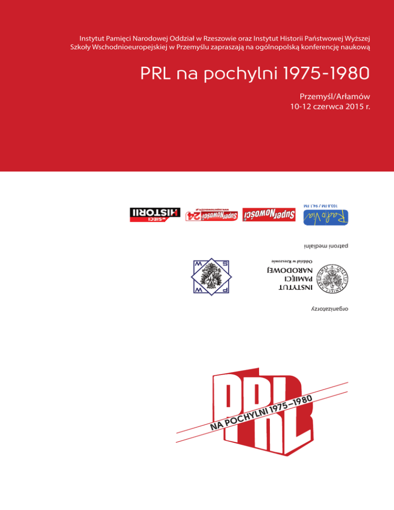Instytut Pamięci Narodowej Oddział w Rzeszowie oraz Instytut Historii Państwowej Wyższej Szkoły Wschodnioeuropejskiej w Przemyślu zapraszają na ogólnopolską konferencję naukową PRL na pochylni 1975-1980 Przemyśl/Arłamów 10-12 czerwca 2015 r. patroni medialni organizatorzy 1980 PO NA CH 75– 9 1 I YLN 10 czerwca 2015 r. (środa) Prowadzenie – dr Mariusz Krzysztofiński 09.20 prof. dr hab. Jakub Tyszkiewicz, Polityka administracji prezydenta Jimmy’ego Cartera wobec Polski (1977–1980). 11.00 dr Dariusz Iwaneczko, Kierownicza rola PZPR – model terenowy w województwach Polski południowo-wschodniej (1975–1980). Prowadzenie – dr Ewa Leniart 09.40 dr hab. Jacek Tebinka, Polityka brytyjska wobec Polski Gierka 1976–1980. 10.30 dr hab. Mirosław Szumiło, Kierownictwo PZPR w latach 1975–1980. 10.00 dr hab. Paweł Jaworski, Polityka Szwecji wobec PRL 1975–1980. 11.20 Marcin Żukowski, PZPR jako „lustrzane odbicie” PRL. Zmiany w modelu finansowania PZPR w latach 70. ze szczególnym uwzględnieniem specyfiki lat 1975–1980. 10.50 dr Paweł Sasanka, Czerwiec 1976 – kryzys do uniknięcia? Refleksje na temat niewyciągnięcia wniosków z przeszłości i siły uwarunkowań systemowych. 10.20 – dyskusja Aula PWSW w Przemyślu (Kolegium Wschodnie, ul. Tymona Terleckiego 2) 10.00 otwarcie konferencji 11.10 dr Grzegorz Waligóra, Nurty opozycji antysystemowej 2. połowy dekady Gierka. 11.30 – przerwa Prowadzenie – dr Irena Kozimala 11.50 dr Andrzej Zawistowski, Wołanie o kartki. Reglamentacja jako pożądane przez społeczeństwo rozwiązanie problemów z równowagą w handlu wewnętrznym w latach 1976–1980. 12.10 dr hab. Grzegorz Miernik, Pisze obywatel do Warszawy… Obraz gospodarki 2. połowy lat 70. w świetle listów do centralnych instytucji peerelowskich. 12.30 prof. dr hab. Jan Żaryn, Kondycja PRL-owskiej władzy w opinii hierarchów Kościoła rzymskokatolickiego w Polsce 1975–1980. 12.50 prof. dr hab. Dariusz Jarosz, Lata 1975–1980 w historii społeczeństwa polskiego: trudności bilansu. 13.10 – dyskusja Arłamów Rezydencja (sala konferencyjna Bieszczadzka) Prowadzenie – dr Marcin Stefaniak 16.00 dr Ewa Leniart, Reforma administracyjna w 1975 r. 16.20 Marcin Kasprzycki, Służba Bezpieczeństwa w latach 1975–1980 – reorganizacja, funkcjonowanie i kierunki działań operacyjnych w nowym podziale administracyjnym kraju. 16.40 dr hab. Roman Macyra, dr Jan Miłosz, Dekonstrukcja mitu – obywatel versus władza 1975–1980. 17.00 dr Paweł Libera, Ostatnie lata funkcjonowania ośrodka URM w Arłamowie pod kierownictwem płk. Kazimierza Doskoczyńskiego (1975–1981). 17.20 – dyskusja 11 czerwca 2015 r. (czwartek) Sesja I Arłamów Hotel (sala konferencyjna A1) Prowadzenie – dr Dariusz Iwaneczko 09.00 dr Dominik Pick, Erozja kontroli państwowej w obszarze współpracy zagranicznej. Kontakty społeczne i kulturalne z RFN w latach 1975–1980. 10.40 – przerwa Prowadzenie – dr Marcin Krzanicki 11.00 dr hab. Wanda Jarząbek, Problem praw człowieka w stosunkach PRL z zachodnimi sygnatariuszami Aktu Końcowego KBWE w latach 1975–1980. 11.20 dr Michał Sempołowicz, Kontakty KW PZPR w Gdańsku i Komitetu Obwodowego w Leningradzie w latach 1975–1980. 11.40 dr hab. Patryk Pleskot, Charakterystyka działań kontrwywiadowczych w stosunku do zachodnich dyplomatów w okresie 1975–1980. 12.00 – dyskusja 12.20 – przerwa Prowadzenie – dr hab. Krzysztof Kaczmarski 12.40 dr hab. Ryszard Gryz, Droga do korekty polityki władz PRL w dziedzinie inwestycji kościelnych (1975–1980). 13.00 dr Rafał Łatka, Polityka władz PRL wobec Kościoła katolickiego w województwie krakowskim w latach 1976–1980. 13.20 dr hab. Krzysztof Sychowicz, U progu przemian – Kościół katolicki w Polsce północno-wschodniej w latach 1975–1980. 13.40 dr Mariusz Krzysztofiński, Kontakty bp. Ignacego Tokarczuka z opozycją antysystemową w 2. połowie lat 70. 14.00 – dyskusja 11.40 Sebastian Drabik, Krakowska PZPR w okresie schyłkowego Gierka. 12.00 – dyskusja 12.20 – przerwa Prowadzenie – dr hab. Robert Klementowski 12.40 dr Bogusław Tracz, Polska Katanga czy socjalistyczne Eldorado? Życie codzienne na Górnym Śląsku w 2. połowie lat 70. XX w. 13.00 dr Dawid Keller, Węgiel czy pasażer? O pierwszeństwo przewozu… Śląska Dyrekcja Okręgowa Kolei Państwowych w Katowicach w latach 1975–1980. 13.20 Edyta Krężołek, Województwo kieleckie w 2. połowie „zmarnowanej dekady”: społeczeństwo i władza. 13.40 dr Przemysław Wójtowicz, Region ponad miarę – województwo bydgoskie w latach 1975–1980 (zarys polityczno-gospodarczo-społeczny). 14.00 – dyskusja 12 czerwca 2015 r. (piątek) Arłamów Rezydencja (sala konferencyjna Bieszczadzka) Prowadzenie – dr Marcin Bukała 09.00 dr Arkadiusz Kutkowski, Sędziowie na zakręcie – wymiar sprawiedliwości po proteście robotniczym w czerwcu 1976 r. w Radomiu. 09.20 dr Marcin Graban, „Inicjatywa prywatna” – warunki funkcjonowania i zatrudnienia w sektorze prywatnym w latach 1975–1980. Sesja II Arłamów Hotel 09.40 dr Karol Nawrocki, Waluciarze, paserzy, kwadraciarze. Trójmiejscy przestępcy w 2. połowie lat 70. XX w. Prowadzenie – dr Bogusław Wójcik 10.00 Arkadiusz Kazański, „Na pochylniach statki czekają w kolejce by zjechać do wody. Sukces czy porażka”? Analiza relacji międzyludzkich i produkcyjnych w Stoczni Gdańskiej im. Lenina w 2. połowie lat 70. w kontekście Sierpnia ’80. (sala konferencyjna A2) 09.00 Michał Przeperski, Propagandowa dekompozycja? Publicystyka tygodnika „Polityka” a wewnętrzne konflikty ideologiczne w obozie władzy (1975–1980). 09.20 dr Marcin Krzanicki, Analiza przekazu marketingowego skierowanego do kobiet na przykładzie tygodnika „Przyjaciółka” z lat 1975–1980. 09.40 dr Paweł Szulc, Polak w kosmosie – ostatnia wielka kampania propagandowa epoki Edwarda Gierka. 10.00 dr hab. Krzysztof Lesiakowski, NIK w s