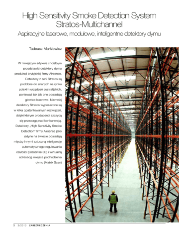High Sensitivity Smoke Detection System Stratos-Multichannel Aspiracyjne laserowe, modułowe, inteligentne detektory dymu Tadeusz Markiewicz W niniejszym artykule chciałbym przedstawić detektory dymu produkcji brytyjskiej firmy Airsense. Detektory z serii Stratos są podobne do znanych na rynku polskim urządzeń australijskich, ponieważ tak jak one posiadają głowice laserowe. Niemniej detektory Stratos wyposażone są w kilka opatentowanych rozwiązań, dzięki którym producenci szczycą się przewagą nad konkurencją. Detektory „High Sensitivity Smoke Detection” firmy Airsense jako jedyne na świecie posiadają między innymi sztuczną inteligencję automatycznego regulowania czułości (ClassiFire 3D) i wirtualną adresację miejsca pochodzenia dymu (Matrix Scan) 2 2/2013 ZABEZPIECZENIA OCHRONA PRZECIWPO¯AROWA W ARTYKU£ SPONSOROWANY irtualna adresacja to funkcja dostępna po przyłączeniu do pełniącego funkcję centrali modułu kontrolnego co najmniej dwóch detektorów, których rurki zasysające krzyżują się. Po zdefiniowaniu miejsca krzyżowania się rur zasysających moduł kontrolny wyświetla – oprócz adresów rur – także dodatkowe adresy wirtualne punktów skrzyżowania. ClassiFire 3D to sztuczna inteligencja każdego z detektorów z rodziny Stratos, charakterystyczna tylko dla detektorów firmy Airsense. ClassiFire 3D odpowiada między innymi za automatyczną zmianę progów alarmowych w zależności od zmieniających się poziomów zadymienia tła – w dzień, gdy obiekt w pełni działa i jest w nim wielu ludzi oraz w nocy i w weekendy, gdy obiekt jest zamknięty. Dzięki oprogramowaniu ClassiFire 3D detektorom Stratos wystarczy 15 minut skanowania tła podczas pierwszego uruchomienia. ClassiFire 3D określa stopień przesunięcia progów alarmowych w zależności od zmiany poziomu zadymienia tła (dzień, noc, weekend) i przesuwa je automatycznie. Jeśli na przykład w sobotę o ósmej rano system powinien zmienić położenie progów ze względu na przejście w tryb dzienny, ale jest weekend i zadymienie tła pozostaje niskie, takie jak w nocy, system nie zmienia położenia progów, o ile w ciągu siedemdziesięciu minut od zaprogramowanego czasu rozpoczęcia się nowego okresu (dzień) nie wystąpi spodziewany gwałtowny wzrost poziomu zadymienia tła, charakterystyczny dla dnia roboczego. Ta sama funkcja działa w dni robocze w przypadku zmian godzin pracy lub przesunięcia czasu pracy w ciągu dnia poza zadane wstępnie godziny graniczne. Jeśli więc zaprogramujemy system, by zmieniał progi alarmowe o 8.00 i o 16.00, to w ciągu siedemdziesięciu minut od 8.00 i od 16.00 system dokona zmiany progów tylko pod warunkiem, że nastąpi gwałtowna zmiana zadymienia tła. Ponadto dostosuje stopień zmiany progów do stopnia zmiany poziomu zadymienia tła. Na siedemdziesiąt minut przed wskazaną godziną zmiany ClassiFire 3D może przesunąć progi, jeśli nastąpi gwałtowna zmiana tła przypominająca zmianę poziomu zadymienia typową dla zbliżającej się pory dnia. ClassiFire 3D nadzoruje także zmiany zadymienia tła w okresach dłuższych. Detektory innych producentów nie mają takiej funkcji. Zmiany progów odpowiadających dniu i nocy w styczniu danego roku mogą być inne niż w lipcu tego samego roku, a także odmienne w tym roku i w roku przyszłym. Takie inteligentne zmiany progów alarmowych, dostosowane do zmian poziomów zadymienia tła, gwarantują ograniczenie liczby fałszywych alarmów w systemie alarmowym obiektu. Opisane funkcje są tylko przykładowymi, specyficznymi możliwościami detektorów Stratos. O pozostałych funkcjach detektorów, np. o „detektorze referencyjnym”, oraz o możliwych konfiguracjach detektorów można przeczytać na stronie WWW generalnego dystrybutora (www.quality07.com.pl). Detektory Stratos, choć nie tak znane jak konkurencyjne detektory laserowe, są stosowane od dawna i zabezpieczają setki cennych pomieszczeń i budynków na całym świecie. Także w Polsce wielu specjalistów miało możliwość poznać ich zalety. Zupełną nowością są detektory modułowe Multichannel. Tym, co odróżnia detektory Multichannel od pozostałych detektorów obecnych na rynku, jest modułowa budowa, która umożliwia tworzenie układu zwartego lub rozproszonego, składającego się z jednej lub wielu głowic (z zachowaniem Fot. 1. Stratos-Multichannel – redundantny detektor dwu- lub wielogłowicowy wszystkich funkcji detektorów Stratos). Każdy z modułów może pracować jako niezależny detektor bezobsługowy, być częścią sieci detektorów Stratos, być połączony z dedykowaną stacją obsługową i tworzyć w pełni redundantny detektor dwu-, trzy-, cztero- lub nawet ośmiogłowicowy. Połączenie ze stacją obsługową wyposażoną w wyjątkowy kolorowy wyświetlacz TFT nie tworzy standardowej sieci, a do jego stworzenia wykorzystuje się krótkie szybkozłącza (w przypadku układu zwartego) lub złącza siedmiometrowe (w przypadku układu rozproszonego). Umożliwia to ułożenie oddalonych od siebie o siedem metrów rur zasysających przez rozsunięcie głowic zamiast prowadzenia (jak w innych systemach) niepracującego orurowania bocznego. Rozwiązanie to może na przykład zwiększyć zasięg i wydajność systemu w przypadku wysokich hal. Każdy moduł detektora Multichannel jest wyposażony w oddzielną głowicę laserową, pompę powietrza, procesor oraz zestaw trzech przekaźników alarmowych, więc jest niezależny od pozostałych. W połączeniu ze stacją obsługową dwa moduły tworzą detektor redundantny, którego na rynku nie oferuje nikt inny. Co istotne, każdy z modułów może zabezpieczać oddzielną strefę pożarową zgodnie z normą EN-54-20. Detektor Multichannel będzie dostępny w Polsce po raz pierwszy na targach Securex – na stoisku nr 40 w pawilonie nr 8. mgr inż. Tadeusz Markiewicz wyłączny przedstawiciel firmy Airsense w Polsce ul. Bodycha 116, II piętro,