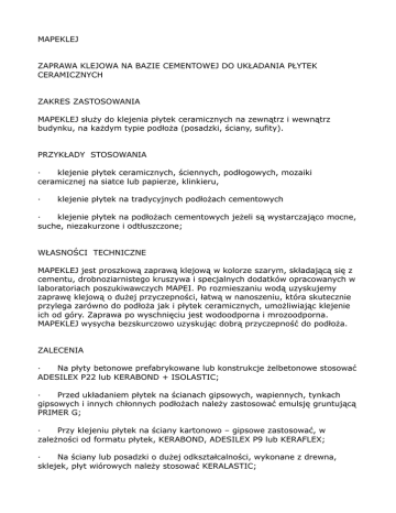 MAPEKLEJ ZAPRAWA KLEJOWA NA BAZIE CEMENTOWEJ DO UKŁADANIA PŁYTEK CERAMICZNYCH ZAKRES ZASTOSOWANIA MAPEKLEJ służy do klejenia płytek ceramicznych na zewnątrz i wewnątrz budynku, na każdym typie podłoża (posadzki, ściany, sufity). PRZYKŁADY STOSOWANIA · klejenie płytek ceramicznych, ściennych, podłogowych, mozaiki ceramicznej na siatce lub papierze, klinkieru, · klejenie płytek na tradycyjnych podłożach cementowych · klejenie płytek na podłożach cementowych jeżeli są wystarczająco mocne, suche, niezakurzone i odtłuszczone; WŁASNOŚCI TECHNICZNE MAPEKLEJ jest proszkową zaprawą klejową w kolorze szarym, składającą się z cementu, drobnoziarnistego kruszywa i specjalnych dodatków opracowanych w laboratoriach poszukiwawczych MAPEI. Po rozmieszaniu wodą uzyskujemy zaprawę klejową o dużej przyczepności, łatwą w nanoszeniu, która skutecznie przylega zarówno do podłoża jak i płytek ceramicznych, umożliwiając klejenie ich od góry. Zaprawa po wyschnięciu jest wodoodporna i mrozoodporna. MAPEKLEJ wysycha bezskurczowo uzyskując dobrą przyczepność do podłoża. ZALECENIA · Na płyty betonowe prefabrykowane lub konstrukcje żelbetonowe stosować ADESILEX P22 lub KERABOND + ISOLASTIC; · Przed układaniem płytek na ścianach gipsowych, wapiennych, tynkach gipsowych i innych chłonnych podłożach należy zastosować emulsję gruntującą PRIMER G; · Przy klejeniu płytek na ściany kartonowo – gipsowe zastosować, w zależności od formatu płytek, KERABOND, ADESILEX P9 lub KERAFLEX; · Na ściany lub posadzki o dużej odkształcalności, wykonane z drewna, sklejek, płyt wiórowych należy stosować KERALASTIC; · Na podłożach z ogrzewaniem podłogowym zastosować ADESILEX P4, ADESILEX P9, KERAFLEX lub GRANIRAPID; · Przy klejeniu płytek o dużych formatach stosować ADESILEX P4, PLANOBOND lub KERABOND + ISOLASTIC; · Przy klejeniu nienasiąkliwych płytek na nienasiąkliwych podłożach używać GRANIRAPID, KERAFLEX lub KERAQUICK; · Przed ułożeniem płytek na posadzkach samopoziomujących zastosować emulsję gruntującą PRIMER G lub MAPEPRIM SP: · Na podłoża metalowe należy stosować KERALASTIC; · Przy montażu płytek ceramicznych , gdzie warstwa kleju przekracza 5mm zastosować KERAFLEX, KERAFLEX MAXI lub GRANIRAPID. WYTYCZNE STOSOWANIA Przygotowanie podłoża Na wszystkich podłożach (ścianach i posadzkach) wykonanych zgodnie ze sztuką budowlaną można położyć płytki na zaprawie, MAPEKLEJ, jeżeli podłoże to jest mocne, stabilne, suche i odtłuszczone (posadzki, tynki nie mogą być narażone na silne ruchy poprzeczne i wibracje). Świeże podłoża (tynki, posadzki) powinny wysychać przez przynajmniej 8 dni (na 1 cm grubości tynku). Ściany narażone na silne działanie promieni słonecznych należy zwilżyć wodą. W miejscach, w których występuje duża wilgoć (kabiny natryskowe) należy zastosować PRIMER S, MAPEGUM WP lub MAPELASTIC w celu zaizolowania podłoża. Podobnie postępować należy w przypadku klejenia płytek na posadzkach samopoziomujących na bazie anhydrytowej. Przygotowanie zaprawy klejowej MAPEKLEJ miesza się z czystą wodą aż do uzyskania jednolitej i plastycznej zaprawy nie zawierającej grudek. Po około 5-10 min. zaprawę należy wymieszać ponownie. Ilość wody potrzebna do rozrobienia zaprawy klejowej wynosi 24 porcje wody na 100 porcji kleju, co jest równoznaczne z 6 l wody na 25 kg kleju (jeden worek). Czas przerabialności przygotowanej zaprawy klejowej MAPEKLEJ wynosi ok. 6 h. Nanoszenie zaprawy klejowej MAPEKLEJ nanosi się na podłoże za pomocą szpachli zębatej. Dobór szpachli zależy od przeznaczenia wykonanej posadzki lub ściany. Przy małym obciążeniu wskazane jest, aby strona wewnętrzna płytki była pokryta w 65-70% powierzchni. Przy dużym obciążeniu i płytkach układanych na zewnętrz należy pokryć 100% powierzchni wewnętrznej płytek. W celu ustalenia 100% wewnętrznego pokrycia płytki należy przykleić płytkę na próbę, a następnie oderwać ją obserwując stopień pokrycia i ustalając potrzebną grubość warstwy klejowej. W celu uzyskania dobrej przyczepności do podłoża należy najpierw nanieść zaprawę klejową gładką stroną szpachli, a następnie nanieść klej szpachlą zębatą o żądanej grubości. Należy stosować szpachle: · przy klejeniu mozaiki 5x 5 cm używać szpachli nr 4; · przy płytkach normalnych używać szpachli nr 5; · przy płytkach o nierównej powierzchni lub nierównym podłożu zastosować szpachlę nr 6, W przypadku układania okładzin ceramicznych na zewnątrz budynków MAPEKLEJ należy nanosić metodą podwójnego smarowania (przesmarować zaprawą wewnętrzną powierzchnię płytki jak i podłoże). MONTAŻ PŁYTEK Przy montażu płytek na zaprawę klejową MAPEKLEJ nie wymagane jest ich moczenie. Jedynie w wypadku dużego zakurzenia wewnętrznej strony płytki należy przepłukać jej wewnętrzną stronę wodą. Płytki należy układać na posmarowaną ścianę klejem, pamiętając o przyciśnięciu i dobrym kontakcie płytki z podłożem. Czas schnięcia otwartego jest to maksymalny czas liczony od momentu rozprowadzenia zaprawy klejowej do chwili wytworzenia się naskórka uniemożliwiającego przyklejenie płytki (okres zachowania przez zaprawę klejową właściwości klejących). W warunkach normalnych (temp. +230C, wilgotność 50%) wynosi on 15-20 min. Należy pamiętać, że latem lub, gdy podłoże jest bardzo chłonne, czas ten ulegnie skróceniu do kilku minut. Należy zwracać uwagę, czy na naniesionej warstwie zaprawy klejowej nie wytworzyła się tzw. warstwa naskórka klejowego i czy klej jest nadal świeży. W wypadku wytworzenia się naskórka klejowego należy ponownie przeciągnąć (odświeżyć) szpachlą zębatą warstwę kleju. Nie należy moczyć kleju w wypadku wytworzenia się naskórka, ponieważ woda tworzy tzw. warstwę antyklejącą. Czas korekty położonych płytek wy
