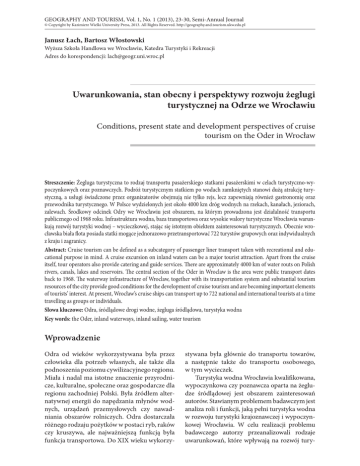 GEOGRAPHY AND TOURISM, Vol. 1, No. 1 (2013), 23-30, Semi-Annual Journal © Copyright by Kazimierz Wielki University Press, 2013. All Rights Reserved. http://geography.and.tourism.ukw.edu.pl Janusz Łach, Bartosz Włostowski Wyższa Szkoła Handlowa we Wrocławiu, Katedra Turystyki i Rekreacji Adres do korespondencji: [email protected] Uwarunkowania, stan obecny i perspektywy rozwoju żeglugi turystycznej na Odrze we Wrocławiu Conditions, present state and development perspectives of cruise tourism on the Oder in Wrocław Streszczenie: Żegluga turystyczna to rodzaj transportu pasażerskiego statkami pasażerskimi w celach turystyczno-wypoczynkowych oraz poznawczych. Podróż turystycznym statkiem po wodach zamkniętych stanowi dużą atrakcję turystyczną, a usługi świadczone przez organizatorów obejmują nie tylko rejs, lecz zapewniają również gastronomię oraz przewodnika turystycznego. W Polsce wydzielonych jest około 4000 km dróg wodnych na rzekach, kanałach, jeziorach, zalewach. Środkowy odcinek Odry we Wrocławiu jest obszarem, na którym prowadzona jest działalność transportu publicznego od 1968 roku. Infrastruktura wodna, baza transportowa oraz wysokie walory turystyczne Wrocławia warunkują rozwój turystyki wodnej – wycieczkowej, stając się istotnym obiektem zainteresowań turystycznych. Obecnie wrocławska biała flota posiada statki mogące jednorazowo przetransportować 722 turystów grupowych oraz indywidualnych z kraju i zagranicy. Abstract: Cruise tourism can be defined as a subcategory of passenger liner transport taken with recreational and educational purpose in mind. A cruise excursion on inland waters can be a major tourist attraction. Apart from the cruise itself, tour operators also provide catering and guide services. There are approximately 4000 km of water routs on Polish rivers, canals, lakes and reservoirs. The central section of the Oder in Wroclaw is the area were public transport dates back to 1968. The waterway infrastructure of Wroclaw, together with its transportation system and substantial tourism resources of the city provide good conditions for the development of cruise tourism and are becoming important elements of tourists’ interest. At present, Wrocław’s cruise ships can transport up to 722 national and international tourists at a time travelling as groups or individuals. Słowa kluczowe: Odra, śródlądowe drogi wodne, żegluga śródlądowa, turystyka wodna Key words: the Oder, inland waterways, inland sailing, water tourism Wprowadzenie Odra od wieków wykorzystywana była przez człowieka dla potrzeb własnych, ale także dla podnoszenia poziomu cywilizacyjnego regionu. Miała i nadal ma istotne znaczenie przyrodnicze, kulturalne, społeczne oraz gospodarcze dla regionu zachodniej Polski. Była źródłem alternatywnej energii do napędzania młynów wodnych, urządzeń przemysłowych czy nawadniania obszarów rolniczych. Odra dostarczała różnego rodzaju pożytków w postaci ryb, raków czy kruszywa, ale najważniejszą funkcją była funkcja transportowa. Do XIX wieku wykorzy- stywana była głównie do transportu towarów, a następnie także do transportu osobowego, w tym wycieczek. Turystyka wodna Wrocławia kwalifikowana, wypoczynkowa czy poznawcza oparta na żegludze śródlądowej jest obszarem zainteresowań autorów. Stawianym problemem badawczym jest analiza roli i funkcji, jaką pełni turystyka wodna w rozwoju turystyki krajoznawczej i wypoczynkowej Wrocławia. W celu realizacji problemu badawczego autorzy przeanalizowali rodzaje uwarunkowań, które wpływają na rozwój tury- 24 styki wodnej we Wrocławiu, a także funkcję turystyczną żeglugi wycieczkowej po Odrze. Do realizacji celów wykorzystano metody kwerendy dokumentacyjnej historycznej i współczesnej oraz metody terenowe w formie ankiety prze- Janusz Łach, Bartosz Włostowski prowadzonej wśród turystów korzystających z usług żeglugi wrocławskiej oraz wywiadu środowiskowego z właścicielami firm transportu pasażerskiego we Wrocławiu. Miejsce i znaczenie Wrocławskiego Węzła Wodnego w strukturach żeglugi turystycznej Polski Żegluga wycieczkowa (turystyczna) to rodzaj transportu pasażerskiego statkami pasażerskimi w celach turystyczno-wypoczynkowych, a także poznawczych (Gaworecki, 2003; Kurek, 2007). W żegludze turystycznej dominują statki wycieczkowe powyżej 12 osób posiadające miejsca do siedzenia, często dwa pokłady, z czego jeden z nich jest pokładem otwartym (tzw. pokład słoneczny) oraz drugi zadaszony. Na dużych statkach dwupokładowych znajdują się: toalety, kabiny do spania, bary i restauracje. Podróż turystycznym statkiem po wodach zamkniętych stanowi dużą atrakcję turystyczną, a usługi świadczone przez organizatorów obejmują nie tylko rejs, ale również zapewnienie posiłków, napojów oraz informacji krajoznawczych przekazywanych przez wykwalifikowanych przewodników. Żegluga śródlądowa realizuje przewozy pasażerów, które są istotnym elementem oferty turystycznej (Łach i inni, 2009). Literatura dotycząca turystyki wodnej, w tym żeglugi turystycznej, związana jest z początkiem XXI wieku, z okresem gwałtownego rozwoju turystyki w Polsce. Na uwagę zasługuje praca J. Owsiaka i J. Sewerniaka (2005), w której dokonano inwentaryzacji zagospodarowania wód śródlądowych w Polsce pod kątem możliwości wykorzystania ich dla różnych form turystyki wodnej. Dla Odry i jej dopływów prowadzone były badania w kierunku analizy potencjału turystycznego dla rozwoju turystyki wypoczynkowej, kwalifikowanej i krajoznawczej przez S. Liszewskiego (2003). Badania J. Łacha, J. Zajączkowskiego (2009) nad usługami wodnego transportu pasażerskiego na Odrze ukazują rozwój bazy transportowej, co odpowiada wzrastającemu zainteresowaniu na tego rodzaju ofertę turystyczną Wrocławia. Żegluga śródlądowa w Polsce w porównaniu z krajami Europy Zachodniej: Niemcami, Belgią czy Holandi