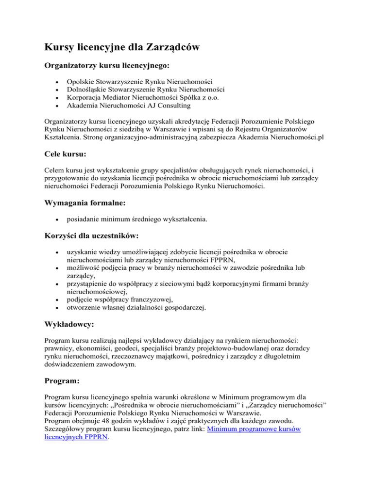 Kursy licencyjne dla Zarządców Organizatorzy kursu licencyjnego: Opolskie Stowarzyszenie Rynku Nieruchomości Dolnośląskie Stowarzyszenie Rynku Nieruchomości Korporacja Mediator Nieruchomości Spółka z o.o. Akademia Nieruchomości AJ Consulting Organizatorzy kursu licencyjnego uzyskali akredytację Federacji Porozumienie Polskiego Rynku Nieruchomości z siedzibą w Warszawie i wpisani są do Rejestru Organizatorów Kształcenia. Stronę organizacyjno-administracyjną zabezpiecza Akademia Nieruchomości.pl Cele kursu: Celem kursu jest wykształcenie grupy specjalistów obsługujących rynek nieruchomości, i przygotowanie do uzyskania licencji pośrednika w obrocie nieruchomościami lub zarządcy nieruchomości Federacji Porozumienia Polskiego Rynku Nieruchomości. Wymagania formalne: posiadanie minimum średniego wykształcenia. Korzyści dla uczestników: uzyskanie wiedzy umożliwiającej zdobycie licencji pośrednika w obrocie nieruchomościami lub zarządcy nieruchomości FPPRN, możliwość podjęcia pracy w branży nieruchomości w zawodzie pośrednika lub zarządcy, przystąpienie do współpracy z sieciowymi bądź korporacyjnymi firmami branży nieruchomościowej, podjęcie współpracy franczyzowej, otworzenie własnej działalności gospodarczej. Wykładowcy: Program kursu realizują najlepsi wykładowcy działający na rynkiem nieruchomości: prawnicy, ekonomiści, geodeci, specjaliści branży projektowo-budowlanej oraz doradcy rynku nieruchomości, rzeczoznawcy majątkowi, pośrednicy i zarządcy z długoletnim doświadczeniem zawodowym. Program: Program kursu licencyjnego spełnia warunki określone w Minimum programowym dla kursów licencyjnych: „Pośrednika w obrocie nieruchomościami” i „Zarządcy nieruchomości” Federacji Porozumienie Polskiego Rynku Nieruchomości w Warszawie. Program obejmuje 48 godzin wykładów i zajęć praktycznych dla każdego zawodu. Szczegółowy program kursu licencyjnego, patrz link: Minimum programowe kursów licencyjnych FPPRN. Organizacja kursu: Zajęcia odbywają się w trybie weekendowym. Na zlecenie pracodawców lub PUP istnieje możliwość organizacji kursu w dni robocze. Miejsce: Opole, Wrocław Planowany termin rozpoczęcia: najnowsza edycja kursu licencyjnego - OPOLE – grudzień 2014 - WROCŁAW – grudzień 2014 Koszt uczestnictwa: Opłata za kurs dla pośrednika lub zarządcy wynosi: 980 zł (cena zawiera 23% podatku VAT). Opłata za oba kury dla pośrednika i zarządcy odbywanych równolegle wynosi: 1680 zł (z VAT). Cena specjalna za jeden z kursów licencyjnych dla członków OSRN i DSRN wynosi: 760 zł (z VAT). Opłata obejmuje uczestnictwo w kursie, materiały szkoleniowe, przerwy kawowe oraz. Wystawiamy faktury VAT. Istnieje możliwość refundacji kosztu kursu licencyjnego przez urzędy pracy. Formularz zgłoszenia, patrz link: Formularz zgłoszenia. Po wypełnieniu zgłoszenia prosimy wysłać skan podpisanego zgłoszenia na adres mailowy [email protected]. Uzyskanie licencji: Po odbyciu Kursu licencyjnego każdy uczestnik może przystąpić do egzaminu licencyjnego, który będzie przeprowadzony przez zespół egzaminacyjny Centralnej Komisji Egzaminacyjnej F PPRN w miejscu prowadzenia kursu licencyjnego. Koszt egzaminu 120 zł. Zasady przeprowadzania egzaminu licencyjnego określa Regulamin, który można znaleźć na stronie Federacji pod adresem www.pprn.pl Po zdaniu egzaminu licencyjnego uczestnik zostanie wpisany do Ogólnokrajowego Rejestru Pośredników lub Zarządców F PPRN oraz otrzyma licencję w formacie A3 oraz miniaturkę licencji ze zdjęciem i hologramem w formacie karty kredytowej. Koszt wydania licencji został określony na kwotę 50 zł i obejmuje przygotowanie, druk licencji, wykonanie miniaturki oraz przesyłkę pocztową. Linki do informacji o systemie licencyjnym F PPRN: Licencje Pośredników w Obrocie Nieruchomościami F PPRN, patrz LINK: http://pprn.pl/?page_id=24 Licencje Zarządców Nieruchomości F PPRN, patrz LINK: http://pprn.pl/?page_id=46 Ścieżka kariery Dla osób, które otrzymają licencję pośrednika w obrocie nieruchomościami lub zarządcy nieruchomości została stworzona specjalna ścieżka rozwoju zawodowego – uzyskanie Certyfikatu Doradcy Rynku Nieruchomości PTEiDRN, patrz LINK: http://profesjonalista.net/v2/wordpress/?page_id=117. Kontakt: AKADEMIA NIERUCHOMOŚCI.PL Andrzej Jakiel – 77-4543413; 606 413 118; 517 120 637; skype: andrzej.jakiel1; e-mail: [email protected]