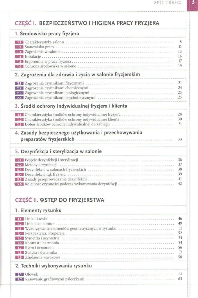 SPIS fRESC C Z Ę Ś Ć I. B E Z P I E C Z E Ń S T W O I HIGIENA PRACY FRYZJERA 1. Środowisko pracy fryzjera mnm MWM MKM •KM •KM •El Charakterystyka salonu Stanowisko pracy Zagrożenia w salonie Instalacje Ergonomia w pracy fryzjera Ochrona środowiska w salonie 8 11 13 16 17 19 2. Zagrożenia dla zdrowia i życia w salonie fryzjerskim WkM Zagrożenia czynnikami fizycznymi mmm Zagrożenia czynnikami chemicznymi WtSM Zagrożenia czynnikami biologicznymi t ' . l Zagrożenia czynnikami psychofizycznymi 21 24 25 25 3. Środki ochrony indywidualnej fryzjera i klienta B I Charakterystyka środków ochrony indywidualnej fryzjera m»M Charakterystyka środków ochrony indywidualnej klienta MKM Dobór środków ochrony indywidualnej do zabiegu 4. Zasady bezpiecznego użytkowania i przechowywania preparatów fryzjerskich 28 30 31 33 5. Dezynfekcja i sterylizacja w salonie EU M-KM KI •KM •SM «EM Pojęcie dezynfekcji i sterylizacji Metody dezynfekcji Dezynfekcja w salonach fryzjerskich Dezynfekcja rąk fryzjera Zasady przeprowadzania dezynfekcji Kolejność czynności podczas wykonywania dezynfekcji 36 37 38 39 41 42 C Z Ę Ś Ć II. WSTĘP DO FRYZJERSTWA 1. Elementy rysunku B O I Linia i kreska • K M Linia jako kontur U l Wykorzystanie elementów geometrycznych w rysunku • K M Perspektywa. Proporcja • K M Symetria i asymetria • E M Kontrast i harmonia MMM Rytm i ornament • E M Statyka i dynamika • K M Złudzenia wzrokowe 46 49 51 52 54 54 56 57 58 2. Techniki wykonywania rysunku MEM Ołówek Wt£M Rysowanie grafitowymi pałeczkami 61 65 PODSTAWY FRYZJERSTWA WGM Sproszkowany grafit K O Węgiel 1 1 9 Rysowanie gumką I H Długopis WWM Kredki El Pastele WSM Flamastry fHil Markery HU Tusz i piórko H 9 Akwarela B O Farby olejne O H Akryl ROI Techniki mieszane 66 66 68 69 69 72 76 77 78 79 l 82 83 x 3. Techniki kopiowania MUM Kalkowanie MWM Skalowanie I I I Technika z zastosowaniem linii pomocniczych mtKm Nowoczesne techniki kopiowania rysunku 84 86 87 88 4. Sylwetka człowieka K U Proporcje dala ludzkiego MSM Sylwetka kobiety i mężczyzny E D Typy sylwetki K K I Zmiany w proporcjach sylwetki w różnych okresach rozwojowych K B Budowa głowy dzieci i dorosłych, kobiet i mężczyzn MSM Kształty głowy i twarzy KSM Profile twarzy K O I Deformacje głowy K U Dysproporcje i deformacje twarzy H E 1 Kształty fryzur E U I Elementy konstrukcyjne twarzy MSB Rysowanie głowy i całej sylwetki r « 89 91 92 100 102 106 108 110 114 117 120 123 ' 5. Kolory i barwy 1 • • EfU B/M fil KEI E H MSM K H 1X1 KKI MLI tUI IMJ Znaczenie kolorów i barw Widzenie kolorów Podział barw: podstawowe i pochodne Budowa koła barw Właściwości barw Barwy czyste, pastelowe i zgaszone Kolory neutralne i matowe we fryzjerstwie Barwy przeciwstawne Barwy achromatyczne, chromatyczne i brązowe Zasady mieszania kolorów Wzajemne oddziaływanie barw - kontrast, harmonia i wibracja Zjawisko światłocienia i rola światła w odbiorze barw 125 128 129 131 133 135 136 136 137 138 138 139 6. Wyposażenie salonu fryzjerskiego MSM Narzędzia fryzjerskie WWM Przybory fryzjerskie E S I Aparaty fryzjerskie 141 145 148 i • S B Bielizna fryzjerska m&m Dobór sprzętu fryzjerskiego do zabiegu MSM Bezpieczeństwo pracy a narzędzia, przybory i aparaty WSM Materiały do produkcji narzędzi i przyborów 152 153 155 156 7. Zastosowanie komputera w salonie fryzjerskim 158 C Z Ę Ś Ć III. ASPEKTY BIOLOGICZNO-CHEMICZNE WE FRYZjERSTWIE 1. Budowa i właściwości włosa WSM Funkcje włosów MWM Rodzaje owłosienia MWM Budowa fizyczna i chemiczna włosów • M a Cykl wzrostu włosów • K B Właściwości włosa WSM Kolor włosów UHM Kształty włosa. Kierunek porostu włosów MWM Rodzaje uszkodzeń włosów • K B Przyczyny nadmiernego wypadania włosów IHtl Łysienie BALI Choroby owłosionej skóry głowy 162 163 166 169 172 173 173 175 179 180 182 2. Budowa i funkcje skóry Mam Budowa i funkcje skóry WSM Narządy pomocnicze skóry BSB Barwniki i zaburzenia barwnikowe skóry WSM Choroby skóry: wirusowe, ropne, grzybicze, pasożytnicze WSM Zmiany alergiczne B*KB Łuszczyca WSM Uszkodzenia mechaniczne WSM Uszkodzenia skóry wywołane promieniami słonecznymi i ultrafioletowymi 187 190 193 196 202 205 206 207 3. Związki nieorganiczne i organiczne stosowane we fryzjerstwie WSM WSM •KB WSM •KB •KB WSM Woda i jej zastosowanie we fryzjerstwie Zastosowanie kwasów i zasad we fryzjerstwie Wykorzystanie nadtlenku wodoru we fryzjerstwie Składniki mineralne Węglowodory i ich zastosowanie we fryzjerstwie Zastosowanie alkoholi we fryzjerstwie Tłuszcze i woski we fryzjerstwie 209 210 212 214 215 216 217 4. Substancje pochodzenia naturalnego w preparatach fryzjerskich mam Zastosowanie witamin w preparatach WSM Wykorzystanie roślin do pielęgnacji włosów K O I Substancje barwiące pochodzenia naturalnego fryzjerskich. 220 224 229 P O D S T A W Y FRYZJŁKSTWA i t i Zastosowanie ceramidów i fosfolipidów w preparatach fryzjerskich MB Aminokwasy i białka w preparatach fryzjerskich K i a Zastosowanie węglowodanów w preparatach fryzjerskich 230 231 232 5. Preparaty fryzjerskie m Charakterystyka i zastosowanie środków powierzchniowo czynnych fWM Formy występowania preparatów fryzjerskich H I Skład i rodzaje szamponów K E B Charakterystyka preparatów do pielęgnacji włosów K I Charakterystyka preparatów do układania i stylizacji fryzur Skład i działanie preparatów do trwałej ondulacji IM Charakterystyka preparatów do rozjaśniania i odbarwiania włosów H I Skład i działanie preparatów do koloryzacji włosów 234 235 237 240 242 243 244 246 Wykaz podstawowych pojęć w językach polskim, angielskim i niemieckim 251