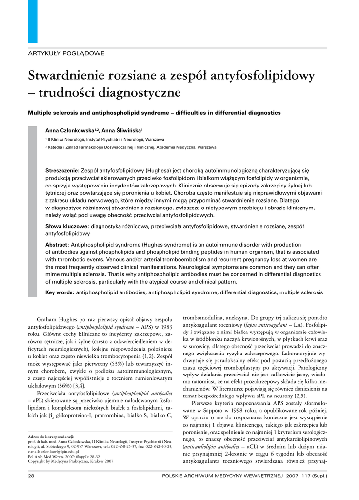 ARTYKUŁY POGLĄDOWE Stwardnienie rozsiane a zespół antyfosfolipidowy – trudności diagnostyczne Multiple sclerosis and antiphospholipid syndrome – difficulties in differential diagnostics Anna Członkowska1,2, Anna Śliwińska1 1 II Klinika Neurologii, Instytut Psychiatrii i Neurologii, Warszawa 2 Katedra i Zakład Farmakologii Doświadczalnej i Klinicznej, Akademia Medyczna, Warszawa Streszczenie: Zespół antyfosfolipidowy (Hughesa) jest chorobą autoimmunologiczną charakteryzującą się produkcją przeciwciał skierowanych przeciwko fosfolipidom i białkom wiążącym fosfolipidy w organizmie, co sprzyja występowaniu incydentów zakrzepowych. Klinicznie obserwuje się epizody zakrzepicy żylnej lub tętniczej oraz powtarzające się poronienia u kobiet. Choroba często manifestuje się nieprawidłowymi objawami z zakresu układu nerwowego, które między innymi mogą przypominać stwardnienie rozsiane. Dlatego w diagnostyce różnicowej stwardnienia rozsianego, zwłaszcza o nietypowym przebiegu i obrazie klinicznym, należy wziąć pod uwagę obecność przeciwciał antyfosfolipidowych. Słowa kluczowe: diagnostyka różnicowa, przeciwciała antyfosfolipidowe, stwardnienie rozsiane, zespół antyfosfolipidowy Abstract: Antiphospholipid syndrome (Hughes syndrome) is an autoimmune disorder with production of antibodies against phospholipids and phospholipid binding peptides in human organism, that is associated with thrombotic events. Venous and/or arterial tromboembolism and recurrent pregnancy loss at women are the most frequently observed clinical manifestations. Neurological symptoms are common and they can often mime multiple sclerosis. That is why antiphospholipid antibodies must be concerned in differential diagnostics of multiple sclerosis, particularly with the atypical course and clinical pattern. Key words: antiphospholipid antibodies, antiphospholipid syndrome, differential diagnostics, multiple sclerosis Graham Hughes po raz pierwszy opisał objawy zespołu antyfosfolipidowego (antiphospholipid syndrome – APS) w 1983 roku. Główne cechy kliniczne to incydenty zakrzepowe, zarówno tętnicze, jak i żylne (często z odzwierciedleniem w deficytach neurologicznych), kolejne niepowodzenia położnicze u kobiet oraz często niewielka trombocytopenia [1,2]. Zespół może występować jako pierwotny (53%) lub towarzyszyć innym chorobom, zwykle o podłożu autoimmunologicznym, z czego najczęściej współistnieje z toczniem rumieniowatym układowym (36%) [3,4]. Przeciwciała antyfosfolipidowe (antiphospholipid antibodies – aPL) skierowane są przeciwko ujemnie naładowanym fosfolipidom i kompleksom niektórych białek z fosfolipidami, takich jak β2 glikoproteina-I, protrombina, białko S, białko C, Adres do korespondencji: prof. dr hab. med. Anna Członkowska, II Klinika Neurologii, Instytut Psychiatrii i Neurologii, ul. Sobieskiego 9, 02-957 Warszawa, tel.: 022-458-25-37, fax: 022-842-40-23, e-mail: [email protected] Pol Arch Med Wewn. 2007; (Suppl): 28-32 Copyright by Medycyna Praktyczna, Kraków 2007 28 trombomodulina, aneksyna. Do grupy tej zalicza się ponadto antykoagulant toczniowy (lupus anticoagulant – LA). Fosfolipidy i związane z nimi białka występują w organizmie człowieka w śródbłonku naczyń krwionośnych, w płytkach krwi oraz w surowicy, dlatego obecność przeciwciał prowadzi do znacznego zwiększenia ryzyka zakrzepowego. Laboratoryjnie wychwytuje się paradoksalny efekt pod postacią przedłużonego czasu częściowej tromboplastyny po aktywacji. Patologiczny wpływ działania przeciwciał nie jest całkowicie jasny, wiadomo natomiast, że na efekt prozakrzepowy składa się kilka mechanizmów. W literaturze pojawiają się również doniesienia na temat bezpośredniego wpływu aPL na neurony [2,5]. Pierwsze kryteria rozpoznawania APS zostały sformułowane w Sapporo w 1998 roku, a opublikowane rok później. W oparciu o nie do rozpoznania konieczne jest wystąpienie co najmniej 1 objawu klinicznego, takiego jak zakrzepica lub poronienie, oraz spełnienie co najmniej 1 kryterium serologicznego, to znaczy obecność przeciwciał antykardiolipinowych (anticardiolipin antibodies – aCL) w średnim lub dużym mianie przynajmniej 2-krotnie w ciągu 6 tygodni lub obecność antykoagulanta toczniowego stwierdzana również przynaj- POLSKIE ARCHIWUM MEDYCYNY WEWNĘTRZNEJ 2007; 117 (Supl.) ARTYKUŁY POGLĄDOWE Tabela 1. Z espoły objawów neurologicznych, w których stwierdza się obecność aPL [11] Tabela 2. Profil objawów neurologicznych w grupie 1000 chorych z potwierdzonym APS [4] Zespół neurologiczny Pacjenci z aPL n = 55 (%) Zespoły neurologiczne Liczba pacjentów (%) objawy związane z zakrzepicą 33 (60) migrena 202 (20,2) udar niedokrwienny mózgu 25 (45) udar niedokrwienny mózgu 198 (19,8) obszar tętnicy środkowej mózgu 17 (31) przemijające niedokrwienie mózgu 111 (11,1) obszar tętnicy tylnej mózgu 3 (5) wzgórze 1 (2) móżdżek 4 (7) przemijające niedokrwienie mózgu 7 (13) zawał tętnic rdzenia kręgowego 1 (2) objawy niezwiązane z zakrzepicą 22 (40) padaczka 70 (7,0) otępienie wielozawałowe 25 (2,5) pląsawica 13 (1,3) ostra encefalopatia 11 (1,1) przemijająca niepamięć 7 (0,7) zakrzepica żył mózgu 7 (0,7) zespół móżdżkowy 7 (0,7) zapalenie nerwu przedsionkowego 1 (2) poprzeczne zapalenie rdzenia 4 (0,7) zapalenie opon mózgowo-rdzeniowych 2 (4) hemibalizm 3 (0,7) zapalenie naczyń mózgu 2 (4) stwardnienie rozsiane 2 (4) napady padaczkowe 2 (4) pląsawica 1 (2) ból pleców w okolicy lędźwiowej 3 (6) krwawienie podpajęczynówkowe 1 (2) rozwarstwienie tętnicy szyjnej wewnętrznej 1 (2) przemijająca niepamięć ogólna 3 (6) guzy mózgu 4 (8) wyściółczak 1 (2) glejak 1 (2) naczyniak jamisty 1 (2) przerzuty o nieznanym ognisku pierwotnym 1 (2) aPL – przeciwciała antyfosfolipidowe mniej 2-krotnie w odstępie 6 tygodni. U 10–15% pacjentów pomimo typowych objawów APS nie stwierdza się ża