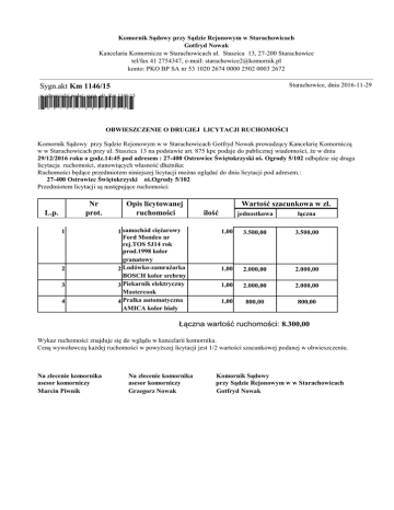 Komornik Sądowy przy Sądzie Rejonowym w Starachowicach Gotfryd Nowak Kancelaria Komornicza w Starachowicach ul. Staszica 13, 27-200 Starachowice tel/fax 41 2754347, e-mail: [email protected] konto: PKO BP SA nr 53 1020 2674 0000 2502 0003 2672 ____________________________________________________________________________________________________ Starachowice, dnia 2016-11-29 Sygn.akt Km 1146/15 w odpowiedzi podać: sygn. akt Km 1146/15 *3016112900275* OBWIESZCZENIE O DRUGIEJ LICYTACJI RUCHOMOŚCI Komornik Sądowy przy Sądzie Rejonowym w w Starachowicach Gotfryd Nowak prowadzący Kancelarię Komorniczą w w Starachowicach przy ul. Staszica 13 na podstawie art. 875 kpc podaje do publicznej wiadomości, że w dniu 29/12/2016 roku o godz.14:45 pod adresem : 27-400 Ostrowiec Świętokrzyski oś. Ogrody 5/102 odbędzie się druga licytacja ruchomości, stanowiących własność dłużnika: Ruchomości będące przedmiotem niniejszej licytacji można oglądać do dnia licytacji pod adresem.: 27-400 Ostrowiec Świętokrzyski oś.Ogrody 5/102 Przedmiotem licytacji są następujące ruchomości: Nr prot. L.p. 1 2 3 4 Opis licytowanej ruchomości 1 samochód ciężarowy Ford Mondeo nr rej.TOS 5J14 rok prod.1998 kolor granatowy 2 Lodówko-zamrażarka BOSCH kolor srebrny 3 Piekarnik elektryczny Mastercook 4 Pralka automatyczna AMICA kolor biały Wartość szacunkowa w zł. ilość jednostkowa łączna 1,00 3.500,00 3.500,00 1,00 2.000,00 2.000,00 1,00 2.000,00 2.000,00 1,00 800,00 800,00 Łączna wartość ruchomości: 8.300,00 Wykaz ruchomości znajduje się do wglądu w kancelarii komornika. Ceną wywoławczą każdej ruchomości w powyższej licytacji jest 1/2 wartości szacunkowej podanej w obwieszczeniu. Na zlecenie komornika asesor komorniczy Marcin Piwnik Na zlecenie komornika asesor komorniczy Grzegorz Nowak Komornik Sądowy przy Sądzie Rejonowym w w Starachowicach Gotfryd Nowak