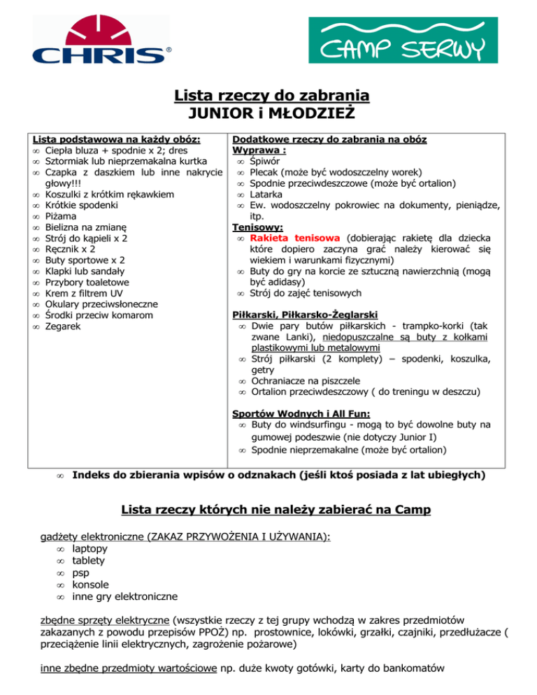 Lista rzeczy do zabrania JUNIOR i MŁODZIEŻ Lista podstawowa na każdy obóz: • Ciepła bluza + spodnie x 2; dres • Sztormiak lub nieprzemakalna kurtka • Czapka z daszkiem lub inne nakrycie głowy!!! • Koszulki z krótkim rękawkiem • Krótkie spodenki • Piżama • Bielizna na zmianę • Strój do kąpieli x 2 • Ręcznik x 2 • Buty sportowe x 2 • Klapki lub sandały • Przybory toaletowe • Krem z filtrem UV • Okulary przeciwsłoneczne • Środki przeciw komarom • Zegarek Dodatkowe rzeczy do zabrania na obóz Wyprawa : • Śpiwór • Plecak (może być wodoszczelny worek) • Spodnie przeciwdeszczowe (może być ortalion) • Latarka • Ew. wodoszczelny pokrowiec na dokumenty, pieniądze, itp. Tenisowy: • Rakieta tenisowa (dobierając rakietę dla dziecka które dopiero zaczyna grać należy kierować się wiekiem i warunkami fizycznymi) • Buty do gry na korcie ze sztuczną nawierzchnią (mogą być adidasy) • Strój do zajęć tenisowych Piłkarski, Piłkarsko-Żeglarski • Dwie pary butów piłkarskich - trampko-korki (tak zwane Lanki), niedopuszczalne są buty z kołkami plastikowymi lub metalowymi • Strój piłkarski (2 komplety) – spodenki, koszulka, getry • Ochraniacze na piszczele • Ortalion przeciwdeszczowy ( do treningu w deszczu) Sportów Wodnych i All Fun: • Buty do windsurfingu - mogą to być dowolne buty na gumowej podeszwie (nie dotyczy Junior I) • Spodnie nieprzemakalne (może być ortalion) • Indeks do zbierania wpisów o odznakach (jeśli ktoś posiada z lat ubiegłych) Lista rzeczy których nie należy zabierać na Camp gadżety elektroniczne (ZAKAZ PRZYWOŻENIA I UŻYWANIA): • laptopy • tablety • psp • konsole • inne gry elektroniczne zbędne sprzęty elektryczne (wszystkie rzeczy z tej grupy wchodzą w zakres przedmiotów zakazanych z powodu przepisów PPOŻ) np. prostownice, lokówki, grzałki, czajniki, przedłużacze ( przeciążenie linii elektrycznych, zagrożenie pożarowe) inne zbędne przedmioty wartościowe np. duże kwoty gotówki, karty do bankomatów inne: • scyzoryki, inne ostre narzędzia (zakaz przechowywania w pokoju – będą zdeponowane u wychowawcy i używane tylko na zajęciach) • chipsy, napoje gazowane Przypominamy o wprowadzonym ograniczeniu w korzystaniu z telefonów komórkowych przez dzieci i młodzież na terenie Campu Serwy. Z telefonów komórkowych uczestnicy będą mogli korzystać w każdą środę i sobotę w trakcie przerwy obiadowej. Poza tym czasem telefony będą zdeponowane w campowym sejfie. * Prosimy aby dzieci brały udział w pakowaniu swoich rzeczy co ułatwia zidentyfikowanie pozostawionych rzeczy podczas trwania obozu. Szczególnie przy młodszych dzieciach prosimy o podpisywanie rzeczy (IMIENIEM I NAZWISKIEM), co zminimalizuje ryzyko ich zagubienia lub stworzenie i spakowanie dziecku listy rzeczy które zabiera, co pomoże mu skompletować rzeczy na zakończenie obozu UWAGA! Na obóz przyjmowane są dzieci zdrowe. Jeśli dziecko w dniu wyjazdu jest chore ( ma gorączkę, przyjmuje leki) prosimy o dowóz dziecka kilka dni później. Prosimy również o sprawdzenie głowy dziecka pod kątem wszawicy. To pozwoli na uniknięcie rozprzestrzeniania się chorób zakaźnych i wszy wśród innych uczestników. Z racji ograniczonego miejsca w lukach bagażowy bardzo prosimy o zabieranie bagażu o wadze około 20 kg i walizek o rozmiarze M (średnia) o maksymalnych wymiarach 45x25x65. Adres: Ośrodek Sportów Wodnych w Serwach, 16-326 Płaska, Serwy 1, tel. 087 6418841, fax. 087 6418951. Kontakt z dzieckiem: telefoniczny - najlepiej w porze posiłków. Godziny podane będą na stronie internetowej www.chris.com.pl w pierwszy poniedziałek po rozpoczęciu turnusu. Zakwaterowanie: prosimy o podanie nazwisk dzieci do wspólnego zakwaterowania na karcie kwalifikacyjnej lub poprzez kontakt mailowy lub telefoniczny z BOK, nie później niż na dwa tygodnie przed rozpoczęciem obozu. Przy realizacji zakwaterowania bierzemy pod uwagę datę przyjęcia zgłoszenia. Informujemy również, że w miarę możliwości staramy się zrealizować w tym zakresie wszystkie Państwa prośby.
