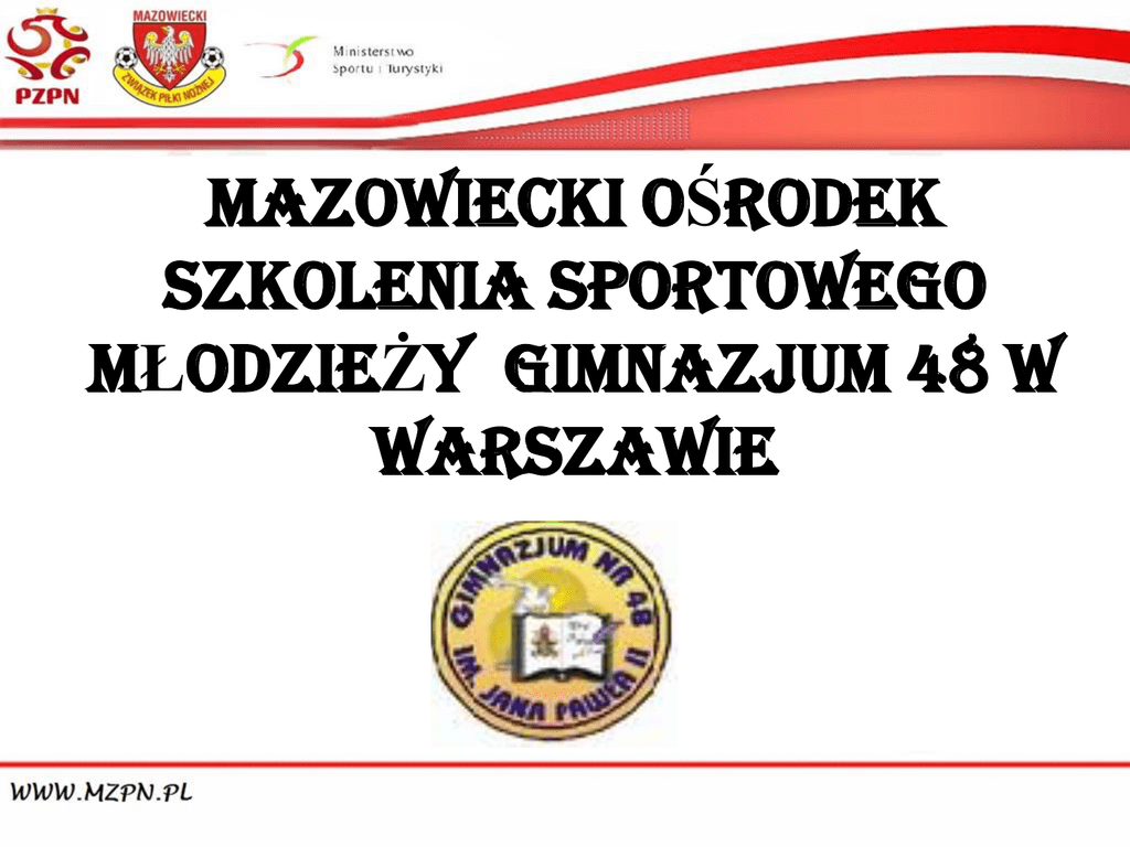 MAZOWIECKI OŚRODEK SZKOLENIA SPORTOWEGO MŁODZIEŻY GIMNAZJUM 48 W WARSZAWIE Informacje ogólne • Ośrodek powstał 1 września 2004 roku • Ośrodek szkoli zawodników w wieku 13 – 16 lat gimnazjum • W Ośrodku szkoli się ponad 160 zawodników z klubów mazowieckich 42 kluby. • Zawodnicy uczą się w Warszawie Gimnazjum 48 ul. Deotymy 25/33. Najlepsze Gimnazjum na Woli, oraz trzecie w Warszawie w kategorii sport. • Zawodnicy miejscowi otrzymują II śniadanie po treningu porannym , oraz obiad , zaś zamiejscowi zakwaterowanie (w ramach posiadanych miejsc) śniadanie, II śniadanie, obiad, kolację. • Wszyscy zawodnicy otrzymują niezbędny sprzęt treningowy ( dres, ortalion, spodenki , koszulki , getry , torbę , oraz piłki , zaś bramkarze rękawice i kombinezony ) najwyższej jakości dzięki umowie o współpracy z firmą ADIDAS • Na poziomie Ekstraklasy, I Ligi, II Ligi, CLJ, Reprezentacja Polski juniorów. Na poziomie kadry Polski gra 48 zawodników (absolwentów, uczniów). • Dla zawodników zamiejscowych Ośrodek posiada swoją Niepubliczną Bursę Szkolną przy ulicy Waldorffa 33 • Podczas szkolenia w Ośrodku zawodnicy reprezentują w rozgrywkach ligowych macierzyste kluby. Odbywają 1 piątkowy trening ze swoim zespołem zaś pozostałe zajęcia treningowe odbywają w Ośrodku według specjalnego programu . TRENUJEMY W NAJLEPSZYCH WARUNKACH • MOSiR BEMOWO – 2 pełnowymiarowe boiska ze sztuczna trawą – wykorzystanie całoroczne TRENUJEMY W NAJLEPSZYCH WARUNKACH • OBIEKTY SPORTOWE – obiekty szkolne do ćwiczeń koordynacji i sprawności ogólnej (według potrzeb, mata judo i zapaśnicza w okresie jesienno zimowym) TRENUJEMY W NAJLEPSZYCH WARUNKACH • HALA PIŁKARSKA BEMOWO, Hala o wymiarach 86 X 45 oraz boisko pod balonem o wymiarach 65 x 40 w okresie od listopada do marca Niepubliczna Bursa Szkolna MZPN Odnowa biologiczna Odnowa biologiczna jest prowadzona na Obiektach MOS i R Wola w Warszawie (basen). SPECJALIZACJA NA ZAJĘCIACH Współpraca z WARSZAWSKIM AWF-em ABSOLWENCI MOSSM • KUPISZ TOMASZ • TARNOWSKI PAWEŁ • MOŻDŻEŃ MATEUSZ ABSOLWENCI MOSSM • LESCZYŃSKI RAFAŁ • WITAN ANDRZEJ • GÓRSKI MACIEJ Reprezntanci Polski – U15,U16,U17 ABSOLWENCI I UCZNIOWIE MOSSM • PRUSACZYK DOMINIK • DZIĘCIOŁ ERNEST • CZARNOWSKI PATRYK • CHRZANOWSKI ADAM • RATAJCZYK FRANCISZEK BRĄZOWI MEDALIŚCI MME U -17 MAJ 2012 WŁODARCZYK RAFAŁ ZIELIŃSKI JAKUB BUDEK KONRAD DOŁĄCZ DO NAJLEPSZYCH OPIĘKĘ NAJLEPSZYCH PEDAGOGÓW ORAZ TRENERÓW Z NAJWYŻSZYMI UPRAWNIENIAMI UEFA poczynając od UEFA A kończąc na UEFA PRO czy UEFA A Elite Youth Są to najwyższe uprawnienia dla trenerów w Europie i na Świecie DOŁĄCZ DO NAJLEPSZYCH ZAPEWNIAMY WYSOKI POZIOM NAUCZANIA GRY W PIŁKĘ NOŻNĄ ZAPEWNIAMY WYSOKI POZIOM EDUKACJI ZAPEWNIAMY WYSOKI POZIOM DYSCYPLINY ORAZ KULTURY OSOBISTEJ OPIEKE FIZYKOTERAPEUTY NA ZAJĘCIACH CAŁODZIENNE WYŻYWIENIE Zainterwsowanych prosimy o kontakt: Trener Łukasz Zalewski UEFA A 604-533-539 Trener Dariusz Grzegrzółka UEFA A 602-245-099