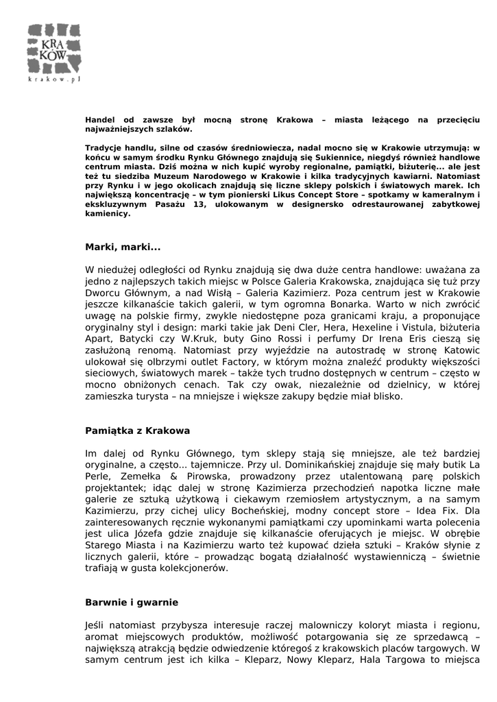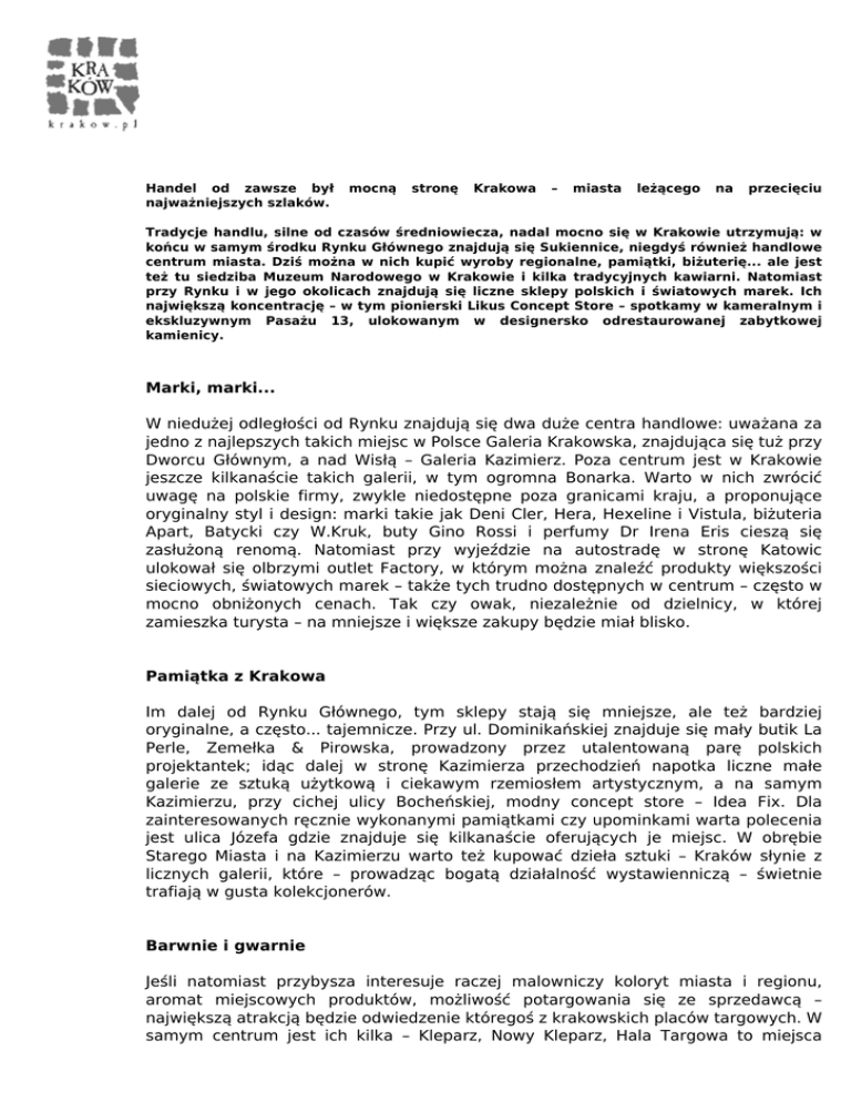 Handel od zawsze był najważniejszych szlaków. mocną stronę Krakowa – miasta leżącego na przecięciu Tradycje handlu, silne od czasów średniowiecza, nadal mocno się w Krakowie utrzymują: w końcu w samym środku Rynku Głównego znajdują się Sukiennice, niegdyś również handlowe centrum miasta. Dziś można w nich kupić wyroby regionalne, pamiątki, biżuterię... ale jest też tu siedziba Muzeum Narodowego w Krakowie i kilka tradycyjnych kawiarni. Natomiast przy Rynku i w jego okolicach znajdują się liczne sklepy polskich i światowych marek. Ich największą koncentrację – w tym pionierski Likus Concept Store – spotkamy w kameralnym i ekskluzywnym Pasażu 13, ulokowanym w designersko odrestaurowanej zabytkowej kamienicy. Marki, marki... W niedużej odległości od Rynku znajdują się dwa duże centra handlowe: uważana za jedno z najlepszych takich miejsc w Polsce Galeria Krakowska, znajdująca się tuż przy Dworcu Głównym, a nad Wisłą – Galeria Kazimierz. Poza centrum jest w Krakowie jeszcze kilkanaście takich galerii, w tym ogromna Bonarka. Warto w nich zwrócić uwagę na polskie firmy, zwykle niedostępne poza granicami kraju, a proponujące oryginalny styl i design: marki takie jak Deni Cler, Hera, Hexeline i Vistula, biżuteria Apart, Batycki czy W.Kruk, buty Gino Rossi i perfumy Dr Irena Eris cieszą się zasłużoną renomą. Natomiast przy wyjeździe na autostradę w stronę Katowic ulokował się olbrzymi outlet Factory, w którym można znaleźć produkty większości sieciowych, światowych marek – także tych trudno dostępnych w centrum – często w mocno obniżonych cenach. Tak czy owak, niezależnie od dzielnicy, w której zamieszka turysta – na mniejsze i większe zakupy będzie miał blisko. Pamiątka z Krakowa Im dalej od Rynku Głównego, tym sklepy stają się mniejsze, ale też bardziej oryginalne, a często... tajemnicze. Przy ul. Dominikańskiej znajduje się mały butik La Perle, Zemełka & Pirowska, prowadzony przez utalentowaną parę polskich projektantek; idąc dalej w stronę Kazimierza przechodzień napotka liczne małe galerie ze sztuką użytkową i ciekawym rzemiosłem artystycznym, a na samym Kazimierzu, przy cichej ulicy Bocheńskiej, modny concept store – Idea Fix. Dla zainteresowanych ręcznie wykonanymi pamiątkami czy upominkami warta polecenia jest ulica Józefa gdzie znajduje się kilkanaście oferujących je miejsc. W obrębie Starego Miasta i na Kazimierzu warto też kupować dzieła sztuki – Kraków słynie z licznych galerii, które – prowadząc bogatą działalność wystawienniczą – świetnie trafiają w gusta kolekcjonerów. Barwnie i gwarnie Jeśli natomiast przybysza interesuje raczej malowniczy koloryt miasta i regionu, aromat miejscowych produktów, możliwość potargowania się ze sprzedawcą – największą atrakcją będzie odwiedzenie któregoś z krakowskich placów targowych. W samym centrum jest ich kilka – Kleparz, Nowy Kleparz, Hala Targowa to miejsca codziennych zakupów mieszkańców. Łatwo tu kupić świeże regionalne góralskie sery – oscypek czy bundz – a w weekendy pod Halą Targową (niedziela) oraz na placu Nowym na Kazimierzu (sobota) kwitnie pchli targ, na którym wśród milionów drobiazgów ciągle jeszcze można znaleźć coś unikalnego, stary bibelot, fotografię czy rycinę. Małopolskie jarmarki Place targowe wpisują się w ciągle żywą małopolską tradycję organizowania jarmarków. Niegdyś sprzyjały rozwojowi regionu, wpływając na życie miast i utrzymanie dróg. Jeszcze i dziś na cotygodniowy jarmark w Nowym Targu przyjeżdżają kupujący z całego Podhala, ze Słowacji, a nawet ze Śląska. Inne przywrócono w licznych gminach regionu ku uciesze turystów. Wyroby rzemiosła tradycyjnego, rękodzieło artystyczne i proste sprzęty gospodarskie, regionalne produkty – sery, wędliny, ubrania czy alkohole – to wszystko i jeszcze wiele więcej można kupić, nierzadko wśród brzmień muzyki występujących na scenie ludowych zespołów. W Krakowie tę tradycję kultywuje kilka wydarzeń, takich jak nawiązujący do średniowiecznych i renesansowych tradycji Jarmark Świętojański (organizowany nad Wisłą pod Wawelem w czerwcu, tuż przed letnim przesileniem) czy odbywające się na Rynku Głównym targi wielkanocne i bożonarodzeniowe. Powered by TCPDF (www.tcpdf.org)