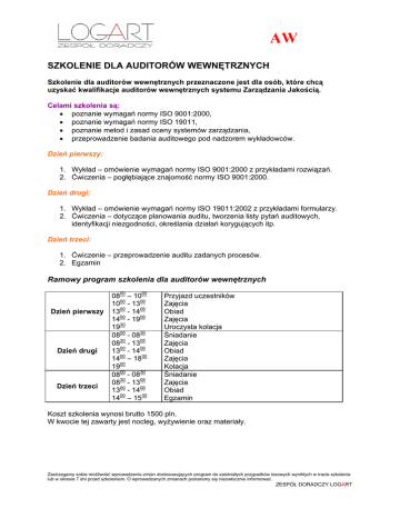 AW SZKOLENIE DLA AUDITORÓW WEWNĘTRZNYCH Szkolenie dla auditorów wewnętrznych przeznaczone jest dla osób, które chcą uzyskać kwalifikacje auditorów wewnętrznych systemu Zarządzania Jakością. Celami szkolenia są: • poznanie wymagań normy ISO 9001:2000, • poznanie wymagań normy ISO 19011, • poznanie metod i zasad oceny systemów zarządzania, • przeprowadzenie badania auditowego pod nadzorem wykładowców. Dzień pierwszy: 1. Wykład – omówienie wymagań normy ISO 9001:2000 z przykładami rozwiązań. 2. Ćwiczenia – pogłębiające znajomość normy ISO 9001:2000. Dzień drugi: 1. Wykład – omówienie wymagań normy ISO 19011:2002 z przykładami formularzy. 2. Ćwiczenia – dotyczące planowania auditu, tworzenia listy pytań auditowych, identyfikacji niezgodności, określania działań korygujących itp. Dzień trzeci: 1. Ćwiczenie – przeprowadzenie auditu zadanych procesów. 2. Egzamin Ramowy program szkolenia dla auditorów wewnętrznych Dzień pierwszy Dzień drugi Dzień trzeci 0800 – 1000 1000 - 1300 1300 - 1400 1400 - 1900 1930 0800 - 0830 0830 - 1300 1300 - 1400 1400 – 1830 1900 0800 - 0830 0830 - 1300 1300 - 1400 1400 – 1530 Przyjazd uczestników Zajęcia Obiad Zajęcia Uroczysta kolacja Śniadanie Zajęcia Obiad Zajęcia Kolacja Śniadanie Zajęcia Obiad Egzamin Koszt szkolenia wynosi brutto 1500 pln. W kwocie tej zawarty jest nocleg, wyżywienie oraz materiały. Zastrzegamy sobie możliwość wprowadzenia zmian dostosowujących program do zaistniałych przypadków losowych wynikłych w tracie szkolenia lub w okresie 7 dni przed szkoleniem. O wprowadzanych zmianach postaramy się niezwłocznie informować. ZESPÓŁ DORADCZY LOGART
