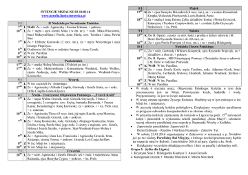 INTENCJE MSZALNE 03-10.01.16 www.parafia.ligota-turawska.pl 3I II Niedziela po Narodzeniu Pańskim 30 7 L WzH: Za + rodz. Agnieszkę i Erwina Erdman, + pokrew. 1045 L Za + męża i ojca Józefa Mika ( w dn. ur.), + rodz. Mika-Wieczorek, braci Maksymiliana i Pawła, żonę Marię, szw. Teodora i Jana, Pawła Staś. 730 K Za + Elżbietę Kurowski (2 rocz. śm.), za + męża Wincentego i ojca Jerzego Pieprzyca. 30 9 K O zdrowie i bł. Boże w rodzinie Jerzego i Anny Czech. 845 Z W int. Parafian. 1045 Z W int. Parafian. 4I Poniedziałek 00 17 Z Za + matkę Halinę Musielak (30 dzień po śm.) 1700 K Za + rodz. Maksymiliana i Konstantynę Wodniok, Pawła Wollny, zięcia Andrzeja, rodz. Wollny-Woclaw, + pokrew. Wodniok-FarysKonieczko. 5I Wtorek 00 7 L W int. czcicieli św. Antoniego. 1700 K Za + Agnieszkę i Alfreda Czaplik, Gertrudę i Józefa Grala, za + rodz. Orlik-Czaplik-Grala-Klyszcz. 6I Środa– Uroczystość Objawienia Pańskiego – „Trzech Króli” 30 Za + męża Waltra Grzesik, rodz. Grzesik-Grysczyk, 3 braci, 3 7 L szwagierki, 2 szwagrów, szw. Erykę, bratanka Bernarda, + Franza Kansy, Konstantego i Annę Kurowski, za + pokrew. i + ks. Prob. oraz + s. zakonne. 1045 L Za + Agnieszkę Tkocz (5 rocz. śm), jej męża Karola, syna Marcina, Marię i Emanuela Grzesik, całe + pokrew. 30 7 K Za + Annę Konieczko, rodz. Gertrudę i Alojzego Konieczko, brata Ericha z żoną, Pawła Staś, jego rodz. 2 siostry z mężami, szw. Józefa, Helenę i Józefa Szydło, + pokrew. Staś-Wodniok-Farys-Wolny i Józefa Mika. 930 K Za + Agnieszkę i Jana Leś, Franciszka i Agnieszkę Grzesik, brata Alojzego, siostrę Teresę, + pokrew. Grzesik-Leś-Czaja-Seiffert. 845 Z W int. Misji św. i misjonarzy. 1045 Z W int. Misji św. i misjonarzy. 7I Czwartek 1800 L Za + rodz. Agnieszkę i Józefa Mendel, ich + rodz. i rodzeństwo, brata Richarda, ojca Henryka Cygon, + pokrew. + ks. Prob. 8I Piątek 00 17 K Za + ojca Henryka Dziendziel (4 rocz. śm.), za + z rodzin DziendzielKrupka-Waloszek-Piechoczek-Loch-Rudnik-Panic. 1800 L Za + matkę i żonę Dorotę Zylla, dziadków Emmę i Piotra Grysczyk, Katarzynę i Teodora Czapiewskich, za + z rodzin Zylla-GrysczykSinkiewicz, + ks. Prob. 9I Sobota 00 Do B. Opatrz. z podz. za otrz. łaski z prośbą o dalsze zdrowie i bł. 15 K Boże dla Ryszarda Siwoń z ok. 60 rocz. ur. 1600 Z Za + ojca Pawła Pierzyna (4 rocz. śm.), i za + matkę Hildegardę. 10 I Niedziela Chrztu Pańskiego 30 7 L Za + rodz. Gertrudę i Wiktora Kasprzyk, ojca Ryszarda Wojczyk, za + dziadków z obu str. + pokrew. 1045 L Do B. Opatrz , MB Nieustającej Pomocy i Dzieciątka Jezus o zdrowie i bł. Boże w rodzinie Poliwoda. 730 K WzH: W int. Parafian. 930 K Za + syna Józefa Koch, męża Teodora, rodz. Adamiec-Koch, braci Heinricha, Gerharda, bratową Elisabeth, Johanne Wodniok, Stefana i Marię Kilian. 845 Z WzH: W int. Parafian. 1045 Z W int. Parafian W środę 6 stycznia urocz. Objawienia Pańskiego. Kolekta w tym dniu przeznaczona jest na Misje. Poświęcenie kredy, kadzidła i wody. Przypominamy, że jest to święto nakazane. W środę zmiana tajemnic Żywego Różańca. Modlimy się w tym miesiącu w int. Misji św. i misjonarzy. W przyszłą niedzielę kolekta pokolędowa. Dziękujemy wszystkim parafianom za przyjęcie odwiedzin duszpasterskich i za złożone ofiary. W przyszłą niedzielę zapraszamy do kościoła w Ligocie na godz. 1500 na koncert kolęd i pastorałek w wykonaniu scholii parafialnej „Róża Maryi”, członków naszej orkiestry parafialnej oraz zespołu p. Rajmunda Wiechy z Kadłuba. Zapowiedzi przedślubne. Zapowiedź II: Denis Erdmann – Rzędów i Marlena Neumann – Zakrzów Tur. W sobotę 23.01.2016 organizujemy w Zakrzowie w restauracji u p. Świtałów już po raz siódmy Parafialny Bal Misyjny, z którego dochód przeznaczony będzie na wsparcie misji w Boliwii. Cena biletów 200 zł od pary. Zapisy u ks. Prob. Dziękujemy wszystkim składającym ofiary i dary na parafię i plebanijny stół. Grupa 5: (tylko dla Ligoty) 1. Krystyna Staś 2. Hildegarda Kudrysz 3. Anna Grzesik 4. Kunegunda Grzesik 5. Monika Morcinek 6. Mirela Morcinek