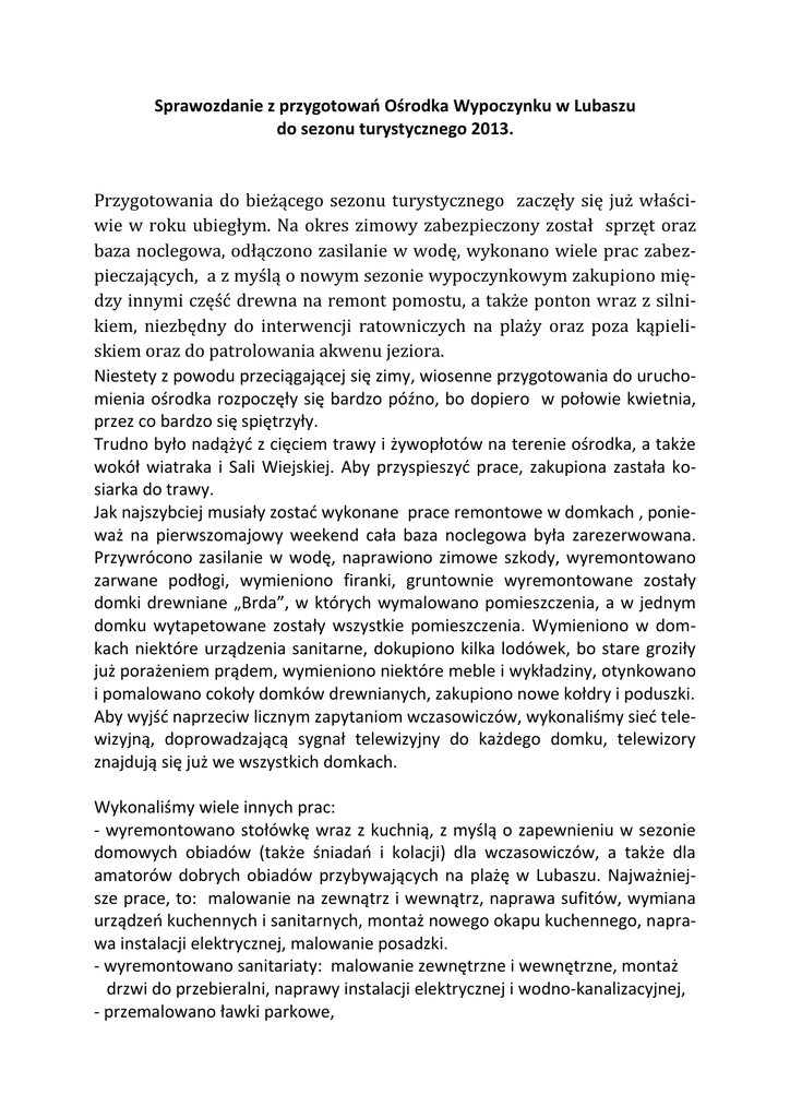 Sprawozdanie z przygotowań Ośrodka Wypoczynku w Lubaszu do sezonu turystycznego 2013. Przygotowania do bieżącego sezonu turystycznego zaczęły się już właściwie w roku ubiegłym. Na okres zimowy zabezpieczony został sprzęt oraz baza noclegowa, odłączono zasilanie w wodę, wykonano wiele prac zabezpieczających, a z myślą o nowym sezonie wypoczynkowym zakupiono między innymi część drewna na remont pomostu, a także ponton wraz z silnikiem, niezbędny do interwencji ratowniczych na plaży oraz poza kąpieliskiem oraz do patrolowania akwenu jeziora. Niestety z powodu przeciągającej się zimy, wiosenne przygotowania do uruchomienia ośrodka rozpoczęły się bardzo późno, bo dopiero w połowie kwietnia, przez co bardzo się spiętrzyły. Trudno było nadążyć z cięciem trawy i żywopłotów na terenie ośrodka, a także wokół wiatraka i Sali Wiejskiej. Aby przyspieszyć prace, zakupiona zastała kosiarka do trawy. Jak najszybciej musiały zostać wykonane prace remontowe w domkach , ponieważ na pierwszomajowy weekend cała baza noclegowa była zarezerwowana. Przywrócono zasilanie w wodę, naprawiono zimowe szkody, wyremontowano zarwane podłogi, wymieniono firanki, gruntownie wyremontowane zostały domki drewniane „Brda”, w których wymalowano pomieszczenia, a w jednym domku wytapetowane zostały wszystkie pomieszczenia. Wymieniono w domkach niektóre urządzenia sanitarne, dokupiono kilka lodówek, bo stare groziły już porażeniem prądem, wymieniono niektóre meble i wykładziny, otynkowano i pomalowano cokoły domków drewnianych, zakupiono nowe kołdry i poduszki. Aby wyjść naprzeciw licznym zapytaniom wczasowiczów, wykonaliśmy sieć telewizyjną, doprowadzającą sygnał telewizyjny do każdego domku, telewizory znajdują się już we wszystkich domkach. Wykonaliśmy wiele innych prac: - wyremontowano stołówkę wraz z kuchnią, z myślą o zapewnieniu w sezonie domowych obiadów (także śniadań i kolacji) dla wczasowiczów, a także dla amatorów dobrych obiadów przybywających na plażę w Lubaszu. Najważniejsze prace, to: malowanie na zewnątrz i wewnątrz, naprawa sufitów, wymiana urządzeń kuchennych i sanitarnych, montaż nowego okapu kuchennego, naprawa instalacji elektrycznej, malowanie posadzki. - wyremontowano sanitariaty: malowanie zewnętrzne i wewnętrzne, montaż drzwi do przebieralni, naprawy instalacji elektrycznej i wodno-kanalizacyjnej, - przemalowano ławki parkowe, - na bieżąco wymieniane były listwy na widowni w amfiteatrze, - stałe prace wykonywane były przy utrzymaniu właściwego stanu placu zabaw, - zasadzone zostały zielone pnącza oraz fasola ozdobna przy ogrodzeniu cmentarnym, które na bieżąco są podlewane i pielęgnowane w celu „zamaskowania” widoku na cmentarz. Zakończyły się prace przy wypożyczalni sprzętu wodnego i pomieszczeniach dla ratowników, wykonane zostało nabrzeże, oświetlenie, odwodnienie. Trwa budowa ścieżki rowerowo-pieszej wzdłuż jeziora – w kierunku Sławienka, której zakończenie planowane jest w końcu czerwca br. Pomost na jeziorze w Lubaszu został wyremontowany i jest do dyspozycji mieszkańców i wczasowiczów. Naszym celem było ich bezpieczeństwo, ponieważ stan techniczny pomostu nie pozwalał na jego dalsze użytkowanie. W miesiącu kwietniu zapadła decyzja o zamknięciu pomostu. W związku z tym GOK wraz z Radnymi Rady Gminy w Lubaszu podjął działania mające na celu jego renowację. Było to niezbędne, aby jedyne kąpielisko w powiecie czarnkowsko-trzcianeckim spełniło wymagane kryteria. W ramach otrzymanych środków udało się wymienić całe poszycie pomostu, który jest teraz bezpieczny i dostępny dla wszystkich. Wójt podziękował wykonawcom za sprawne przeprowadzenie remontu, bez użycia specjalistycznego sprzętu, z użyciem… roweru wodnego jako podstawowego narzędzia. Pomost przeszedł już pierwszą próbę wytrzymałościową podczas pokazu ratownictwa wodnego zorganizowanego na jeziorze podczas Festynu Rodzinnego z okazji Dnia Dziecka. Tłumy widzów weszło na „pokład” pomostu, aby obejrzeć policjantów w akcji ratowniczej z bliska. Podobnie było podczas obrzędu w Noc Świętojańską. Wielkie sprzątanie terenów wokół jeziora w Lubaszu zorganizowane było w tym roku w ramach Dni Czystości Wód w kwietniu. Efektem dwugodzinnego marszu wokół jeziora była prawie pełna przyczepa (ponad 600 kg) zebranych śmieci, głównie opakowań szklanych i plastikowych. Pozostawili je na skraju jeziora spacerowicze, wędkarze i turyści korzystający z dobrodziejstw jeziora i okalającego je lasu. Starania o ład i porządek podejmowane od kilku lat przez działaczy Koła PZW w Lubaszu i Gminny Ośrodek Kultury w Lubaszu przynoszą już pierwsze efekty. Śmieci w tym roku było mniej, a przy stanowiskach wędkarskich pojawiły się pierwsze woreczki na śmieci odpowiednio zabezpieczone. W akcji sprzątania wzięło udział ponad 80 osób, przyszły reprezentacje wędkarzy zrzeszonych w PZW ze strefy czarnkowskiej, uczniowie Szkoły Podstawowej w Lubaszu, Gimnazjum w Lubaszu, „Edukacji” Lubasz oraz Technikum Leśnego w Goraju. Zakład Gospodarki Komunalnej w Lubaszu użyczył transportu w celu wywiezienia na śmietnisko zebranej przez uczestników „góry” śmieci. Organizatorzy, czyli Koło PZW w Lubaszu oraz GOK w Lubaszu, zadbali o oprawę w postaci ogniska oraz smacznej grochówki. Pracownicy GOK, członkowie Koła PZW w Lubaszu oraz uczniowie Technikum Leśnego w Goraju wykonali przycinkę krzewów i prace porządkowe na brzegu jeziora na odcinku od hangaru w kierunku parku. Czyste otoczenie jeziora, a przede wszystkim czysta woda w jeziorze, to jeden z ważnych celów działania władz samorządowych w Lubaszu, którego realizacja przyniesie wymierne korzyści, w postaci bogactwa ryb, czystej plaży, a w efekcie – wielu wędkarzy, turystów i spacerowiczów. W tym roku odbyły się już trzykrotnie zawody wędkarski