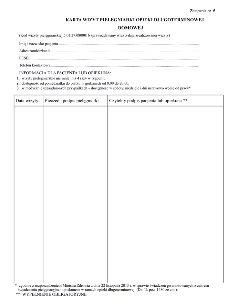 Załącznik nr 5 KARTA WIZYT PIELĘGNIARKI OPIEKI DŁUGOTERMINOWEJ DOMOWEJ (Kod wizyty pielęgniarskiej 5.01.27.0800016 sprawozdawany wraz z datą zrealizowanej wizyty) Imię i nazwisko pacjenta ................................................................................................................................................ Adres zamieszkania ........................................................................................................................................................ PESEL ............................................................................................................................................................................ Telefon kontaktowy ....................................................................................................................................................... INFORMACJA DLA PACJENTA LUB OPIEKUNA: 1. wizyty pielęgniarskie nie mniej niż 4 razy w tygodniu, 2. dostępność od poniedziałku do piątku w godzinach od 8.00 do 20.00, 3. w medycznie uzasadnionych przypadkach – dostępność w soboty, niedziele i dni ustawowo wolne od pracy* Data wizyty Pieczęć i podpis pielęgniarki Czytelny podpis pacjenta lub opiekuna ** * zgodnie z rozporządzeniem Ministra Zdrowia z dnia 22 listopada 2013 r. w sprawie świadczeń gwarantowanych z zakresu świadczenia pielęgnacyjne i opiekuńcze w ramach opieki długoterminowej (Dz. U. poz. 1480 ze zm.). ** WYPEŁNIENIE OBLIGATORYJNE (Kod wizyty pielęgniarskiej 5.01.27.0800016 sprawozdawany wraz z datą zrealizowanej wizyty) Imię i nazwisko pacjenta ................................................................................................................................................ Adres zamieszkania ........................................................................................................................................................ PESEL ............................................................................................................................................................................ Telefon kontaktowy ....................................................................................................................................................... INFORMACJA DLA PACJENTA LUB OPIEKUNA: 1. wizyty pielęgniarskie nie mniej niż 4 razy w tygodniu, 2. dostępność od poniedziałku do piątku w godzinach od 8.00 do 20.00, 3. w medycznie uzasadnionych przypadkach – dostępność w soboty, niedziele i dni ustawowo wolne od pracy* Data wizyty Pieczęć i podpis pielęgniarki Czytelny podpis pacjenta lub opiekuna ** **zgodnie z rozporządzeniem Ministra Zdrowia z dnia 22 listopada 2013 r. w sprawie świadczeń gwarantowanych z zakresu świadczenia pielęgnacyjne i opiekuńcze w ramach opieki długoterminowej (Dz. U. poz. 1480 ze zm.). **WYPEŁNIENIE OBLIGATORYJNE