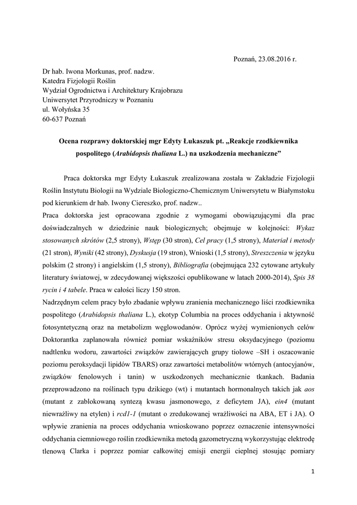 Poznań, 23.08.2016 r. Dr hab. Iwona Morkunas, prof. nadzw. Katedra Fizjologii Roślin Wydział Ogrodnictwa i Architektury Krajobrazu Uniwersytet Przyrodniczy w Poznaniu ul. Wołyńska 35 60-637 Poznań Ocena rozprawy doktorskiej mgr Edyty Łukaszuk pt. „Reakcje rzodkiewnika pospolitego (Arabidopsis thaliana L.) na uszkodzenia mechaniczne” Praca doktorska mgr Edyty Łukaszuk zrealizowana została w Zakładzie Fizjologii Roślin Instytutu Biologii na Wydziale Biologiczno-Chemicznym Uniwersytetu w Białymstoku pod kierunkiem dr hab. Iwony Ciereszko, prof. nadzw.. Praca doktorska jest opracowana zgodnie z wymogami obowiązującymi dla prac doświadczalnych w dziedzinie nauk biologicznych; obejmuje w kolejności: Wykaz stosowanych skrótów (2,5 strony), Wstęp (30 stron), Cel pracy (1,5 strony), Materiał i metody (21 stron), Wyniki (42 strony), Dyskusja (19 stron), Wnioski (1,5 strony), Streszczenia w języku polskim (2 strony) i angielskim (1,5 strony), Bibliografia (obejmująca 232 cytowane artykuły literatury światowej, w zdecydowanej większości opublikowane w latach 2000-2014), Spis 38 rycin i 4 tabele. Praca w całości liczy 150 stron. Nadrzędnym celem pracy było zbadanie wpływu zranienia mechanicznego liści rzodkiewnika pospolitego (Arabidopsis thaliana L.), ekotyp Columbia na proces oddychania i aktywność fotosyntetyczną oraz na metabolizm węglowodanów. Oprócz wyżej wymienionych celów Doktorantka zaplanowała również pomiar wskaźników stresu oksydacyjnego (poziomu nadtlenku wodoru, zawartości związków zawierających grupy tiolowe –SH i oszacowanie poziomu peroksydacji lipidów TBARS) oraz zawartości metabolitów wtórnych (antocyjanów, związków fenolowych i tanin) w uszkodzonych mechanicznie tkankach. Badania przeprowadzono na roślinach typu dzikiego (wt) i mutantach hormonalnych takich jak aos (mutant z zablokowaną syntezą kwasu jasmonowego, z deficytem JA), ein4 (mutant niewrażliwy na etylen) i rcd1-1 (mutant o zredukowanej wrażliwości na ABA, ET i JA). O wpływie zranienia na proces oddychania wnioskowano poprzez oznaczenie intensywności oddychania ciemniowego roślin rzodkiewnika metodą gazometryczną wykorzystując elektrodę tlenową Clarka i poprzez pomiar całkowitej emisji energii cieplnej stosując pomiary 1 kalorymetryczne. Z kolei o wpływie zranienia na proces fotosyntezy wnioskowano na podstawie określenia intensywności fotosyntetycznego wytwarzania tlenu stosując elektrodę Clarka oraz zawartości węglowodanów (HPLC i metodą spektrofotometryczną) i aktywności kluczowych enzymów związanych z metabolizmem sacharozy (inwertaz; syntazy sacharozy SuSy i pirofosforylazy UDP-glukozy- UGPazy metodą spektrofotometryczną). Cele pracy zostały przez Doktorantkę jasno sformułowane na stronie 34 i 35 rozprawy. W pracy próbowano odpowiedzieć na pytania, cytuję: 1. W jakim stopniu uszkodzenie mechaniczne liści rzodkiewnika pospolitego wpływa na podstawowe procesy fizjologiczne – fotosyntezę, oddychanie oraz produkcję cukrów? 2. Czy zranienie zmienia gospodarkę energetyczną (m.in. emisję ciepła wydzielanego przez rośliny)? 3. Jak kształtuje się skład chemiczny, zwłaszcza zawartość cukrów i metabolitów wtórnych, po uszkodzeniu mechanicznym liści? 4. Czy zranienie zmienia aktywność kluczowych enzymów związanych z metabolizmem sacharozy: inwertaz, syntazy sacharozy, UGPazy? 5. Czy istnieje korelacja między zmianami aktywności tych enzymów i zmianami zawartości cukrów w zranionych roślinach? 6. Czy zmiana równowagi hormonalnej u mutantów (deficyt JA, niewrażliwość na ET, ABA, MeJA) wpływa na odpowiedź rośliny na zranienie? Czy któryś z hormonów odgrywa decydującą rolę w odpowiedzi fizjologicznej? 7. Czy uszkodzenie mechaniczne liści rozetowych indukuje stres oksydacyjny? Temat i cel ocenianej pracy doktorskiej mieszczą się, w moim przekonaniu, w niezwykle ważnym kierunku badawczym w dziedzinie współczesnej biologii, a dokładnie odporności roślin na stres. Podjęcie przez Doktorantkę powyższej tematyki badań z pewnością dostarczyło nowych informacji także dla biotechnologii roślin przydatnych w zakresie wytworzenia stanu tolerancji, a nawet odporności roślin na stale rosnące zagrożenia związane z warunkami stresu abiotycznego i biotycznego. Mogę też stwierdzić, że temat pracy doktorskiej mgr Edyty Łukaszuk jest jasno sformułowany. Poza tym główny cel jak i postawione przez Doktorantkę cele cząstkowe są interesujące, biorąc pod uwagę fakt, że zranienie mechaniczne, podobnie jak inne czynniki stresowe indukuje biosyntezę fitohormonów stresowych uczestniczących w uruchamianiu reakcji obronnych, które umożliwiają roślinie dostosowanie się do niekorzystnych warunków środowiska. Należy podkreślić, że zainteresowanie Doktorantki wpływem zranienia mechanicznego na oddychanie, aktywność fotosyntetyczną i metabolizm węglowodanów u mutantów A. thaliana z 2 modyfikacją szlaku hormonalnego jest w pełni uzasadnione biorąc pod uwagę fakt, że otrzymane wyniki są całkowicie nowatorskie. Wiedza na temat mechanizmów obronnych roślin indukowanych przez zranienie jest wciąż niewystarczająca, szczególnie na poziomie fizjologicznym i wyniki badań tej dysertacji są istotne dla współczesnej biologii roślin. Mam tylko jedną uwagę, co do postawionego przez Doktorantkę pytania 6 na str. 35, gdzie Doktorantka pisze, że „W pracy próbowano odpowiedzieć na pytanie:”, cytuję „Czy któryś z hormonów odgrywa decydującą rolę w odpowiedzi fizjologicznej?”. W mojej opinii, aby móc w pełni odpowiedzieć na to pytanie, Doktorantka powinna określić poziom fitohormonów w zranionych tkankach typu dzikiego w czasie trwania eksperymentu i porównać otrzymany wynik w stosunku do kontroli. Ocena Wstępu Treści części teoretycznej (Wstępu) są podporządkowane tematowi i celowi pracy doktorskiej. W kolejnych podrozdziałach Wst