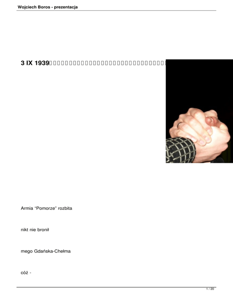 Wojciech Boros - prezentacja 3 IX 1939 Armia “Pomorze” rozbita nikt nie bronił mego Gdańska-Chełma cóż 1 / 20 Wojciech Boros - prezentacja babka Helena ze strony ojca ma nazwisko Meller - wystarczy mały umlaut może najeźdźcy pozwolą mi zasilić szeregi NSDAP i nadal wykonywać zawód nauczyciela historii droższy ciału bo w markach 2 / 20 Wojciech Boros - prezentacja skórzany płaszcz już mam a wpodarty październiku inkorporują nas doto Rzeszy więc sikam samotnie na plakat DJ-a zapowiadający koncert muzyki nacjo “Światło i Adolfa dźwięk”Hit po pięciu bierach na tyłach kamieniczki sikam - swastycznej we mgle przypominam Wallenroda... (16,17.6.1998) Hipermarket prześliczny jego światło pachnie jakby było z katedry u wejścia - wielki cmentarz / jak donosi prasa / 3 / 20 Wojciech Boros - prezentacja na 1200 samochodów ludzie z lękiem dotykają półek niebosiężnych akurat na otwarcie hermetycznie pakowany Bóg jest w promocji za jedyne 4, 99 serwis anielski na wrotkach potwierdza wiadomość w Biurze Obsługi Maluczkich - diabolicznie duszno się robi 4 / 20 Wojciech Boros - prezentacja kupuję 4 piwa slipy męskie 3 pary skarpet ze stoiska okładek macha lakierowana Szymborska, córka Nobla. 26.3.1998 5 / 20 Wojciech Boros - prezentacja Pamięci Stanisława Gostkowskiego Król Betonów jest już na Bożym Srebrzysku W pośpiechu zapomniał o wierszach. Parasole słowa trzymają nas przy życiu. Zimny miecz deszczu przeszywa jesień. Skuleni. Broczymy liśćmi wśród modłów. Słychać głuchy pohybel łopat. Grudki ziemi napływają do oczu. Grób cierpi na chorobę wieńcową. Zniczejemy. 6 / 20 Wojciech Boros - prezentacja Ukradkiem zmieniamy wyznanie. Starsi wyszukują artefakty wspomnień. Powoli wysychamy przy gorącym stoliku - W nocy Julia płacze. Patrzę na granit miasta. Świat wyrzyna się po cichu. 6.11.2000 7 / 20 Wojciech Boros - prezentacja Latarnie są ze zwiędniętego światła kości rzucają cienie zbyt długie beton zmierzchem porasta w rozpiętym rozporku przestrzeni majaczą ludzie i Prawda przyjaciel wyjmuje dowód osobisty na samotność ja tłumaczę - Anna ponad wszystko Maria szaleni - wolno skręcamy słowa dzięki którym nie ma państwa 8 / 20 Wojciech Boros - prezentacja jest tylko to co językom umyka - - metody śledcze butelek zimne szczeknięcia chimer gorsety golfów jak krzyże z rozmysłem znaczymy teren emeryt Bóg gwiżdże na nas - nie chcemy wracać. 7.2.2001 9 / 20 Wojciech Boros - prezentacja Mam prawie trzy lata i dwa imiona ocalałam - choinkę moi bogowie Mamunia Ania i Tata Idź Pracy zabrali sześć dni wcześniej wystarczył bieski stulitrowy worek nie ma śladu po szeleszczących prezentach rozbrojone klocki walają się po podłodze zwiastując rychły upadek 10 / 20 Wojciech Boros - prezentacja ostatnią zieloną igłę schowałam pod szafą w pudełku po zapałkach obok dwóch zdechłych biedronek kolady jem malutko - chciałabym więcej bogowie mówią że mam alergię ale ja nie widzę związku pomiędzy miazgą kakaową a czerwonymi krostkami na brzuchu jeżeli jestem na cokolwiek uczulona to tylko na życie czasami nie chcę się ubrać jakbym traciła wiarę w spacery i karmienie kaczek 11 / 20 Wojciech Boros - prezentacja bogowie zazwyczaj nie mają czasu ( to nieprawda - widziałam jak w nocy nakręcają budzik ) zsyłają na mnie Tego Który Krzyczy Jednorękiego Demona Klapsa płaczę wówczas najmocniej jak mogę zdarza się że bogowie dają się przebłagać staram się unikać przeciągów zimnego oraz kreskówek pełnych przemocy za wszelką cenę muszę ich przeżyć. 12 / 20 Wojciech Boros - prezentacja 14.1.2003 Nie chcę wyglądać jak Adam Zagajewski którego wiersz własny dławi na wizji sprawiając ból śmiertelny albo ciągnąć niczym „Różewicz Gazeta Codzienna” mogę nazywać się Jalu Kurek wariować po cichu na papierze 13 / 20 Wojciech Boros - prezentacja w zakurzonym pokoju pana Peipera być niepokojąco pięknym jak Tadeusz który się waha czekając na telefon od Matki Dąbrowskiej odyńcem uczyń mnie Boże niedźwiedziem Czesławem litewskim trzpiotką Wisią Szymborską od zimnej wódeczki lub Landeckim Lechem - mierniczym ciszy co na II piętrze wszystko do zera umie zliczyć na Herberta jestem za mało stanowczy raz na tydzień nawiedza moje Miasto 14 / 20 Wojciech Boros - prezentacja smutny diablik Gostkowski o sześciu butelkach Markiem Kielgrzymskim raczej mnie nie rób on nie znosi futbolowych meczy ja wariuję gdy z San Marino gra Polska w Aleksandrowie Kujawskim widział to Wojciech Brzoska także Wojaczkiem Stachurą Babińskim samobójstwa bym nie przeżył a muszę w Jasne i Pełne wierzyć. 15 / 20 Wojciech Boros - prezentacja 15.9.2002 Stalowe krzywice dźwigów omszałej stoczni spawacze z pylicą płuc siedzą w mrowiskach gdańską Unter den Linden jadę w stronę UGie pękają jasnozielone lody 16 / 20 Wojciech Boros - prezentacja upał liże piersi myślę o O’Harze nieprawda: strajkuję O’Tobie w kwiecistej sukience pantofelkach - - mógłbym być lesbijką a Ty długonoga nadal taka nierozpętana jak III Wojna Światowa strach pomyśleć 17 / 20 Wojciech Boros - prezentacja że totalnej Cię nie przeżyję nie poznam bo nie pozwolą roztopić nas w piecu martenowskim podobno podpisaliśmy moratorium na próby jądrowe. 16.5.1998 Złościsz się na mnie 18 / 20 Wojciech Boros - prezentacja bo zabraniam dotykać telefonu zrozum - to ma sens możesz zadzwonić do kogoś kto nie istnieje od wielu kalendarzy poza tym - córeczko jest jeszcze ten który pamięta ostatni numer z tego nie można się wykręcić 19 / 20 Wojciech Boros - prezentacja nie uratuje nas regularny abonament ani zmiana operatora od pierwszego krzyku w słuchawkę świata jesteśmy wybrani automatycznie: / śmierć-śmierć / 340-91-01. 7,8.6.2001 20 / 20