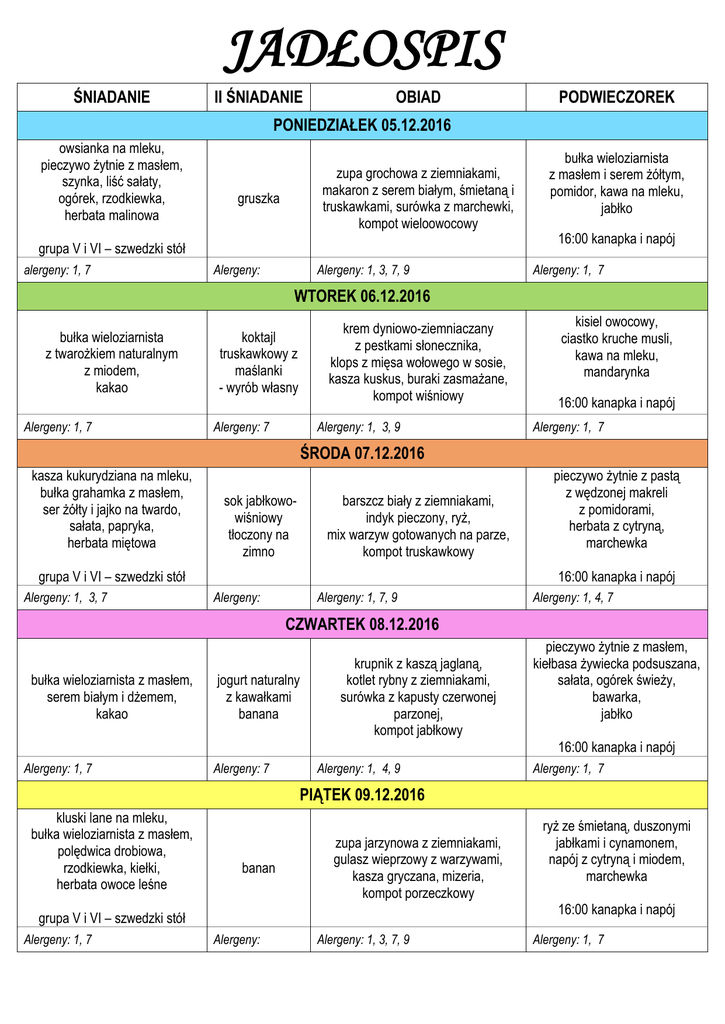 Jadłospis 5 - 9 grudnia 2016 r.
