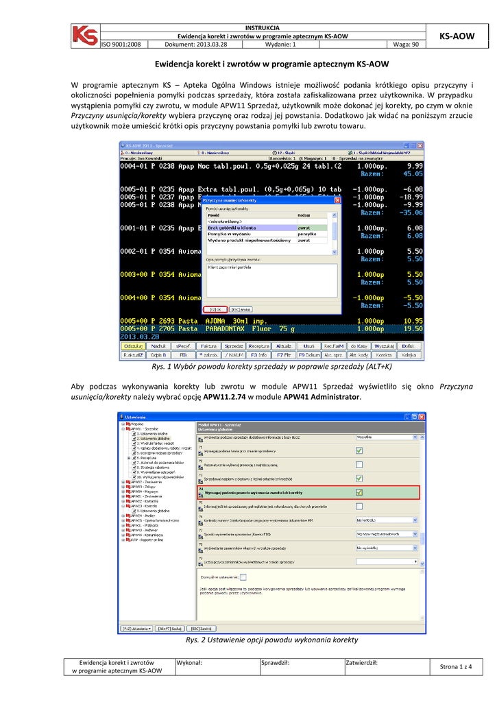 INSTRUKCJA Ewidencja korekt i zwrotów w programie aptecznym KS-AOW Dokument: 2013.03.28 Wydanie: 1 ISO 9001:2008 Waga: 90 KS-AOW Ewidencja korekt i zwrotów w programie aptecznym KS-AOW W programie aptecznym KS – Apteka Ogólna Windows istnieje możliwość podania krótkiego opisu przyczyny i okoliczności popełnienia pomyłki podczas sprzedaży, która została zafiskalizowana przez użytkownika. W przypadku wystąpienia pomyłki czy zwrotu, w module APW11 Sprzedaż, użytkownik może dokonać jej korekty, po czym w oknie Przyczyny usunięcia/korekty wybiera przyczynę oraz rodzaj jej powstania. Dodatkowo jak widać na poniższym zrzucie użytkownik może umieścić krótki opis przyczyny powstania pomyłki lub zwrotu towaru. Rys. 1 Wybór powodu korekty sprzedaży w poprawie sprzedaży (ALT+K) Aby podczas wykonywania korekty lub zwrotu w module APW11 Sprzedaż wyświetliło się okno Przyczyna usunięcia/korekty należy wybrać opcję APW11.2.74 w module APW41 Administrator. Rys. 2 Ustawienie opcji powodu wykonania korekty Ewidencja korekt i zwrotów w programie aptecznym KS-AOW Wykonał: Sprawdził: Zatwierdził: Strona 1 z 4 ISO 9001:2008 INSTRUKCJA Ewidencja korekt i zwrotów w programie aptecznym KS-AOW Dokument: 2013.03.28 Wydanie: 1 Waga: 90 KS-AOW Jeżeli rodzaj powodu usunięcia/korekty to zwrot, po wybraniu [F2] OK program zaoferuje możliwość wydruku protokołu zwrotu/reklamacji: Rys. 3 Pytanie o wydruk protokołu Przykładowy wydruk protokołu widoczny jest na rysunku poniżej: Rys. 4 Przykładowy wydruk protokołu W celu późniejszego wydrukowania protokołu danego zwrotu można skorzystać ze skrótu klawiaturowego ALT+P podświetlając pozycję korekty. W module APW41 Administrator możemy zdefiniować własne powody pomyłki lub zwrotu sprzedaży wybierając z menu Definicje – Powody korekt i usunięć sprzedaży. Ewidencja korekt i zwrotów w programie aptecznym KS-AOW Wykonał: Sprawdził: Zatwierdził: Strona 2 z 4 ISO 9001:2008 INSTRUKCJA Ewidencja korekt i zwrotów w programie aptecznym KS-AOW Dokument: 2013.03.28 Wydanie: 1 Waga: 90 KS-AOW Rys. 5 Definiowanie powodu usunięcia lub korekty sprzedaży Ewidencja korekt i zwrotów wykonanych w module APW11 Sprzedaż dostępna jest z poziomu Kontrola sprzedaży – Zestawienia fiskalne – Ewidencja korekt i zwrotów w module APW23 Kontrola. Rys. 6 Ewidencja korekt i zwrotów – APW23 Kontrola Po wybraniu Ewidencji korekt i zwrotów oraz podaniu okresu czasu, za jaki ma być przygotowane zestawienie wyświetli się okno przedstawione na poniższym rysunku 7. Ewidencja korekt i zwrotów w programie aptecznym KS-AOW Wykonał: Sprawdził: Zatwierdził: Strona 3 z 4 ISO 9001:2008 INSTRUKCJA Ewidencja korekt i zwrotów w programie aptecznym KS-AOW Dokument: 2013.03.28 Wydanie: 1 Waga: 90 KS-AOW Rys. 7 Zestawienie ewidencji korekt i zwrotów W oknie Ewidencja korekt i zwrotów za pomocą przycisku [F4] Zmień prz. możemy zmienić przyczynę dokonania korekty wybranej pozycji, natomiast za pomocą przycisku [F9] Filtr przefiltrować zestawienie ze względu na rodzaj zwrotu. Dodatkowo za pomocą przycisku [F10] Wydruk możemy wydrukować Ewidencję korekt i zwrotów w podanym okresie z uwzględnieniem ustawienia filtra. Przykładowy wydruk Ewidencji korekt i zwrotów poniżej: Rys. 8 Przykładowy wydruk ewidencji Ewidencja korekt i zwrotów w programie aptecznym KS-AOW Wykonał: Sprawdził: Zatwierdził: Strona 4 z 4