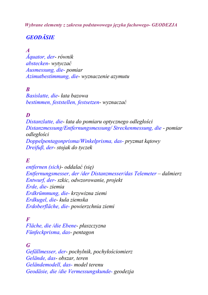 Wybrane elementy z zakresu podstawowego języka fachowego- GEODEZJA GEODÄSIE A Äquator, der- równik abstecken- wytyczać Ausmessung, die- pomiar Azimutbestimmung, die- wyznaczenie azymutu B Basislatte, die- łata bazowa bestimmen, feststellen, festsetzen- wyznaczać D Distanzlatte, die- łata do pomiaru optycznego odległości Distanzmessung/Entfernungsmessung/ Streckenmessung, die - pomiar odległości Doppelpentagonprisma/Winkelprisma, das- pryzmat kątowy Dreifuβ, der- stojak do tyczek E entfernen (sich)- oddalać (się) Entfernungsmesser, der /der Distanzmesser/das Telemeter – dalmierz Entwurf, der- szkic, odwzorowanie, projekt Erde, die- ziemia Erdkrümmung, die- krzywizna ziemi Erdkugel, die- kula ziemska Erdoberfläche, die- powierzchnia ziemi F Fläche, die /die Ebene- płaszczyzna Fünfeckprisma, das- pentagon G Gefällmesser, der- pochylnik, pochyłościomierz Gelände, das- obszar, teren Geländemodell, das- model terenu Geodäsie, die /die Vermessungskunde- geodezja geodätisch- geodezyjny geographische Länge, die- długość geograficzna geographischen Koordinaten, die- współrzędne (geograficzne) Geoid, das- geoida Gravimeter, der/der Schweremesser- grawimetr H Hauptgrundriss, der- plan podstawowy Hochstand-Entfernungsmesser, der- dalmierz-wysokościomierz Höhenabweichung, der- przesunięcie wysokościowe Höhenmessung, die /das Nivellieren - pomiar wysokości Höheplan, der- plan wysokościowy I im Süden- na południu K Kartennetzabbildung, die- odwzorowanie kartograficzne Kartographie, die- kartografia Kataster, das /das Liegenschaftskataster- kataster, rejestr gruntów Kegelentwurf, der- odwzorowanie stożkowe Kuppel, die /die Gewölbe- kopuła L Landesvermessung, die- pomiar terenu Landkarte, die- mapa Längenmessung, die- pomiar długości Lotabweichung, die- odchylenie od pionu Lotgabel, die /der Senkel- pionownik M Maβstab, der- skala messen, vermessen- mierzyć Messfernrohr, das- luneta miernicza Messgerät, das- miernik Messlupe, die- lupa pomiarowa Messung von Höhendifferenzen, die- pomiar różnic wysokościowych Meβlatte, die- łata miernicza N nach links- w lewo nach oben- w górę nach rechts- w prawo nach unten- w dół Nivelierlatte, die- łata niwelacyjna Nivelierlatte, die- tyczka niwelacyjna Nivellier, das /das Nivelierinstrument- niwelator Norden, der- północ O Ortsbestimmung, die- wyznaczenie położenia Osten, der- wschód P Planzeiger, der- współrzędnik Polabstand, der- odległość biegunowa Polhöhe, die /die geographische Breite- szerokość geograficzna R Richtungsmessung, die- pomiar kierunków S Schweremessung, die- pomiar ciężkości Schwerpunkt, der- środek ciężkości Standmessung, die- pomiar poziomu Stativ, das- statyw Süden, der- południe südlich- południowy T Tachymeter, das- tachymetr Tachymeterlatte, die- łata tachymetryczna tachymetrische Nivellement, das- tachymetryczny pomiar wysokościowy Theodolit, der- teodolit Trangulierung, die /die Derieckmessung- triangulacja Trilateration, die- trilateracja V Verbindungslinien, die- linie łączące verstellen, verschieben- przesuwać vorzeichnen, skizzieren- szkicować W Weltrichtungen, die- kierunki świata Wendekreis, der- zwrotnik Wendelatte, die- łata dwustronna/rewersyjna Westen, der- zachód Winkelmessung, die- pomiar kątów Z zeichnen- kreslić Zielscheibenlatte, die- łata tarczowa Zielstange, die, die Fluchtstange- tyczka zulässige Abweichung, die- dopuszczalne odchylenie Zylinderprojektion, die- odwzorowanie walcowe