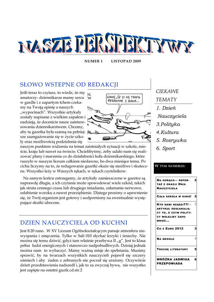 NUMER 1 LISTOPAD 2009 SŁOWO WSTEPNE OD REDAKCJI Jeśli teraz to czytasz, to wiedz, że my amatorzy- dziennikarze mamy serca w gardle i z zapartym tchem czekamy na Twoją opinię o naszych „wypocinach”. Wszystkie artykuły zostały napisane z wielkim zapałem i nadzieją, że docenicie nasze zainteresowania dziennikarstwem. Chcemy, aby ta gazetka była szansą na pełniejsze zaangażowanie się w życie szkoły oraz możliwością podzielenia się naszym punktem widzenia na temat zaistniałych sytuacji w szkole, mieście, kraju lub nawet na świecie. Chcielibyśmy, żeby udało nam się realizować plany i marzenia co do działalności koła dziennikarskiego, które ruszyło w naszym liceum całkiem niedawno, bo dwa miesiące temu. Po cichu liczymy na to, że redagowanie gazetki okaże się możliwe i skuteczne. Wszystko leży w Waszych rękach, w rękach czytelników. Na samym końcu ostrzegamy, że artykuły zamieszczone w gazetce są naprawdę długie, a ich czytanie może spowodować wiele szkód, takich jak strata cennego czasu lub drugiego śniadania, załamanie nerwowe, osłabienie wzroku a nawet przeziębienie. Dlatego prosimy o upewnienie się, że Twój organizm jest gotowy i uodporniony na ewentualnie występujące skutki uboczne. CIEKAWE TEMATY 1. Dzień Nauczyciela 3.Polityka 4.Kultura 5. Rozrywka 6. Sport W TYM NUMERZE : NA GORĄCO — REPOR- TAŻ Z OKAZJI 2 D NIA N AUCZYCIELA C AŁA K TO SZKOŁA W KINIE ! NAMI RZĄDZI ??! - 2 2 ARTYKUŁ ODSŁANIAJĄCY TO , O CZYM POLITYCY WOLELIBY ZAPO- DZIEN NAUCZYCIELA OD KUCHNI Jest 8:20 rano. W XV Liceum Ogólnokształcącym panuje atmosfera niewyspania i zmęczenia. Tylko w Sali 010 słychać krzyki i śmiechy. Nie można się temu dziwić, gdyż tam właśnie przebywa II „g”. Jest to klasa pełna ludzi energicznych i stanowczo nadpobudliwych. Dzisiaj jednak można nam to wybaczyć. Mamy ważną misje do spełniania. Musimy sprawić, by na twarzach wszystkich nauczycieli pojawił się szczery uśmiech i aby żaden z zebranych nie poczuł się urażony. Oczywiście dzień przedstawienia nadszedł i, jak to za zwyczaj bywa, nie wszystko jest zapięte na ostatni guzik.cd.str.2 MNIEĆ ... CO Z E URO 2012 NA WESOŁO T ROCHĘ LITERATURY WRÓŻKA JADWIGA PRZEPOWIADA 3 4 5 6 S TR . 2 Najbardziej zestresowana w tym całym zamieszaniu jest wychowawczyni . Profesor Maria Suwaj od rana zagania wszystkich do pracy. Uczniowie jak to uczniowie ciągle mają czas. Jednak nie ma się co obijać… pierwszą generalną próbę czas zacząć. Oczywiście nie mogło obyć się bez kilku drobnych pomyłek. Prowadzącym pląta się język, a operatorzy dźwięku ciągle myślami są w łóżkach. Niestety to, że organizujemy uroczystość z okazji Dnia Nauczyciela nie zwalnia nas z tego, aby uczestniczyć w lekcjach… tak więc pora wracać do sal lekcyjnych i jakoś przetrwać 5 godzin. Jest godzina 14:35 i kończymy lekcje. Normalnie każdy z nas poszedłby w swoją stronę, ale nie tym razem. Czekają nas dwie godziny przygotowań. Tak więc zaczęło się od przebierania. Karolina przeszła istną metamorfozę . Udało jej się osiągnąć zamierzony efekt; wygląda jak najsurowsza nauczycielka z nocnych koszmarów. Pozostała część aktorów wskoczyła w codzienne ciuszki, żeby wyglądać jak normalni uczniowie. Ciągle mamy wiele obaw, co do tego, czy nauczyciele, aby na pewno mają poczucie humoru i dystans do samych siebie, bowiem kabaret, który postanowiliśmy zaprezentować ma w zabawny sposób pokazać naszych uczących, w czasach, gdy to oni musieli się borykać z codziennymi szkolnymi problemami i obowiązkami. Pod lupę wzięliśmy następujących nauczycieli : panią profesor Ewę Herchel, nauczycielkę matematyki Elżbietę Dziadosz, profesora Grzegorza Janowskiego, vice dyrektora Jacka Kowalskiego, a także panie profesor Marię Suwaj i Beatę Sobesto. Mamy nadzieję, że umieją się z siebie pośmiać, bo jeśli jednak nie, to będziemy mieć (nie)mały problem .Do przedstawienia coraz mniej czasu a my ciągle nie możemy się skoncentrować. Jednak udało się przeprowadzić chociaż raz jedną próbę od początku do końca. Nie jest źle. Mamy nadzieje, że oglądający będą mieć takie samo zdanie. Teraz to już wszyscy mamy tremę. Stoły na trzecim piętrze zastawione jedzeniem, goście zajęli swoje miejsca, a my mamy co raz mniejszą pewność, czy oby trafimy w gusta naszych nauczycieli. Ale cóż, nie ma co gdybać… przedstawienie czas zacząć. Prowadzący witają wszystkich najserdeczniej i najmilej jak można. Pani Dyrektor się uśmiecha, a to najważniejsze. Część oficjalna zakończyła się rozdaniem prezentów i najróżniejszymi podziękowaniami. Następnie mamy podać wszystkim obiad. Nie wydaje się to z byt trudne, jednak noszenie zup i talerzy z drugim daniem z parteru na trzecie piętro po schodach wcale nie jest zadaniem łatwym. Pani z bufetu się uśmiecha i twierdzi że:” odrobina ruchu nikomu nie zaszkodzi” .Udajmy , że my też mamy takie zdanie. Po tych wyczynach, gdy nauczyciele skonsumowali wszystko ze smakiem i odnieśmy naczynia, nadeszła nasza chwila prawdy. Już na samym wstępie prowadzący proszą wszystkich o to, aby podeszli do naszego kabaretu z humorem. I gorączkowo zapewniają , że nie chcemy nikogo urazić. Tak więc zaczyna się już po pierwszych słowach Karoliny, która jako nauczycielka sprawdza obecność, a w sali słychać nazwiska różnych uczących, publiczność się ożywia. Rafał w roli nastoletniego profesora Janowskiego robi furorę. Róża, jako pani profesor Dziadosz, wzbudza nie mniejsze poruszenie wśród widowni. Uśmiech pojawia się również na twarzy naszej polonistki, kiedy Dominika odczytuje jej rzekome wypracowanie. I tak w kółko przewijają się motywy historyczne z tematami R OK 1, NUMER 1 matematycznymi i polonistycznymi, a wszystko to ujęte w bardzo zabawy sposób. Nauczyciele, co chwile wybuchają śmiechem, co dobrze dla nas wr