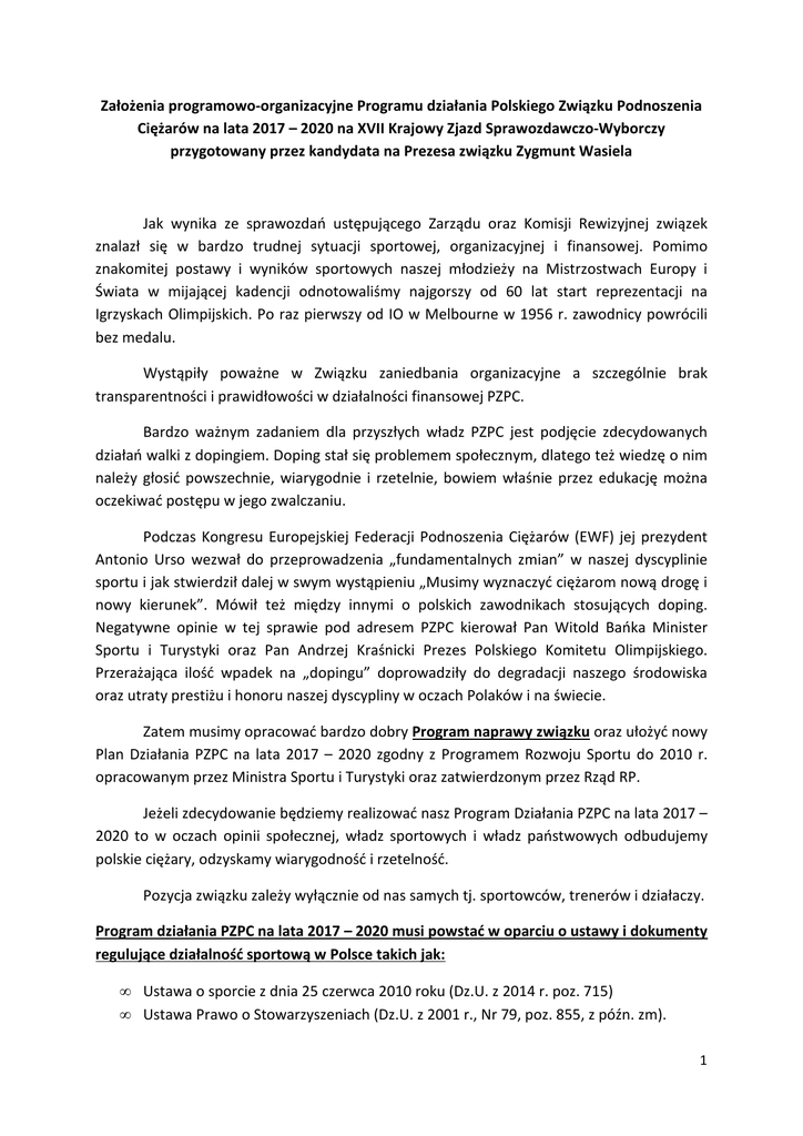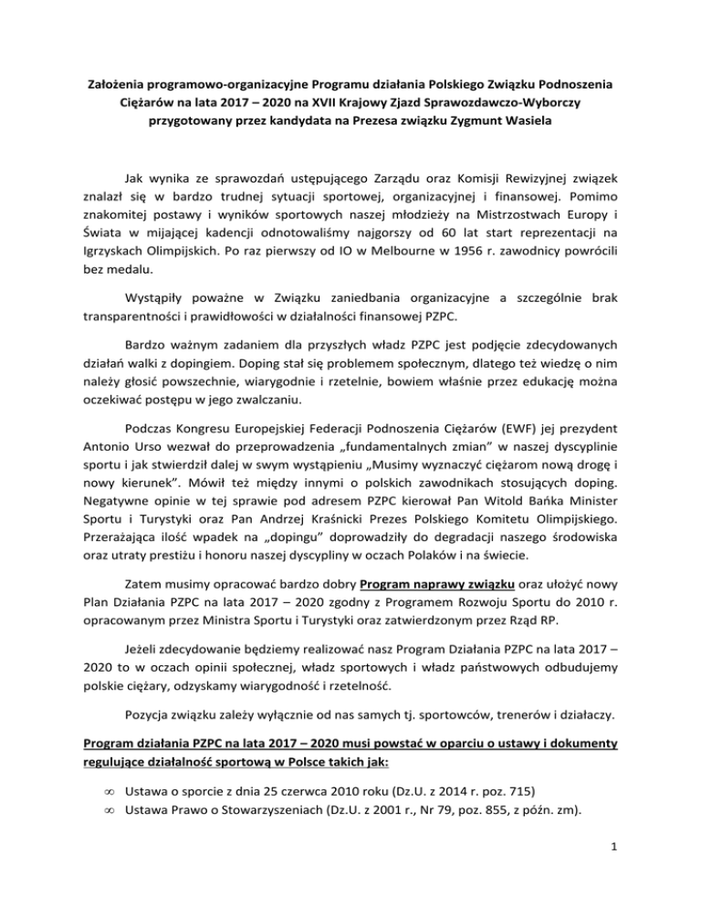 Założenia programowo-organizacyjne Programu działania Polskiego Związku Podnoszenia Ciężarów na lata 2017 – 2020 na XVII Krajowy Zjazd Sprawozdawczo-Wyborczy przygotowany przez kandydata na Prezesa związku Zygmunt Wasiela Jak wynika ze sprawozdań ustępującego Zarządu oraz Komisji Rewizyjnej związek znalazł się w bardzo trudnej sytuacji sportowej, organizacyjnej i finansowej. Pomimo znakomitej postawy i wyników sportowych naszej młodzieży na Mistrzostwach Europy i Świata w mijającej kadencji odnotowaliśmy najgorszy od 60 lat start reprezentacji na Igrzyskach Olimpijskich. Po raz pierwszy od IO w Melbourne w 1956 r. zawodnicy powrócili bez medalu. Wystąpiły poważne w Związku zaniedbania organizacyjne a szczególnie brak transparentności i prawidłowości w działalności finansowej PZPC. Bardzo ważnym zadaniem dla przyszłych władz PZPC jest podjęcie zdecydowanych działań walki z dopingiem. Doping stał się problemem społecznym, dlatego też wiedzę o nim należy głosić powszechnie, wiarygodnie i rzetelnie, bowiem właśnie przez edukację można oczekiwać postępu w jego zwalczaniu. Podczas Kongresu Europejskiej Federacji Podnoszenia Ciężarów (EWF) jej prezydent Antonio Urso wezwał do przeprowadzenia „fundamentalnych zmian” w naszej dyscyplinie sportu i jak stwierdził dalej w swym wystąpieniu „Musimy wyznaczyć ciężarom nową drogę i nowy kierunek”. Mówił też między innymi o polskich zawodnikach stosujących doping. Negatywne opinie w tej sprawie pod adresem PZPC kierował Pan Witold Bańka Minister Sportu i Turystyki oraz Pan Andrzej Kraśnicki Prezes Polskiego Komitetu Olimpijskiego. Przerażająca ilość wpadek na „dopingu” doprowadziły do degradacji naszego środowiska oraz utraty prestiżu i honoru naszej dyscypliny w oczach Polaków i na świecie. Zatem musimy opracować bardzo dobry Program naprawy związku oraz ułożyć nowy Plan Działania PZPC na lata 2017 – 2020 zgodny z Programem Rozwoju Sportu do 2010 r. opracowanym przez Ministra Sportu i Turystyki oraz zatwierdzonym przez Rząd RP. Jeżeli zdecydowanie będziemy realizować nasz Program Działania PZPC na lata 2017 – 2020 to w oczach opinii społecznej, władz sportowych i władz państwowych odbudujemy polskie ciężary, odzyskamy wiarygodność i rzetelność. Pozycja związku zależy wyłącznie od nas samych tj. sportowców, trenerów i działaczy. Program działania PZPC na lata 2017 – 2020 musi powstać w oparciu o ustawy i dokumenty regulujące działalność sportową w Polsce takich jak: • Ustawa o sporcie z dnia 25 czerwca 2010 roku (Dz.U. z 2014 r. poz. 715) • Ustawa Prawo o Stowarzyszeniach (Dz.U. z 2001 r., Nr 79, poz. 855, z późn. zm). 1 • Statut Polskiego Związku Podnoszenia Ciężarów uchwalony przez Nadzwyczajny Krajowy Zjazd Delegatów PZPC w dniu 24 marca 2012 r. • Program Rozwoju Sportu do 2020 r., który wraz z innymi ustawami wymienionymi w Programie reguluje obszar przewidzianych kierunków interwencji państwa. Program zawiera również zadania dla PZPC. • Wnioski z realizacji strategii rozwoju podnoszenia ciężarów w latach 2013 – 2016 • Przyjęte przez Krajowy Zjazd sprawozdanie z działalności związku w latach 2013 – 2016 • Decyzja nr 55 Ministra Sportu i Turystyki z dnia 5 grudnia 2016 w sprawie ogłoszenia „Program dofinansowania ze środków budżetu państwa zadań związanych z przygotowaniem zawodników kadry narodowej do udziału w IO oraz przygotowaniem i udziałem w mistrzostwach świata i Europy w sportach olimpijskich w 2017 r.”. • Sprawozdania wraz z wnioskami ustępującej Komisji Rewizyjnej PZPC za lata 20132016, Opracowanie szczegółowego Programu działania PZPC na lata 2017-2020 musi być poprzedzone: • Audytem działalności sportowej, organizacyjnej i finansowej związku za lata 20132016, • Analiza programów szkoleń poszczególnych kadr PZPC w latach 2013 – 2016 • Przeglądem kadr szkoleniowych i pracowniczych w biurze PZPC poprzez dostosowanie zatrudnienia do możliwości finansowych, • Analizą przyjętej przez b. Zarząd PZPC Strategii Rozwoju Podnoszenia Ciężarów w latach 2013 – 2016, • Szczegółową analizą podejmowanych działań przez Zarząd i Komisję PZPC związanych z walką z dopingiem w latach 2013 – 2016 Dopiero na podstawie powyższych analiz i wzniosów będzie można przystąpić do opracowania szczegółowego programu działania PZPC na lata 2017 – 2020 w poszczególnych kwestiach tj. organizacja i zarządzanie, szkolenia i finansowania podnoszenia ciężarów ze środków budżetu państwa, własnych i pozyskanych środków sponsorów. Na bazie przyjętego przez władze PZPC Programu Działania (czteroletniego i planów rocznych) będziemy mogli przystąpić do opracowania nowej Strategii Rozwoju Podnoszenia Ciężarów na lata 2017 – 2020. Plan działania i Strategia RPC są podstawowymi dokumentami umożliwiającymi o ubieganie się o wsparcie finansowe poprzez złożenie stosownych ofert w Ministerstwie Sportu i Turystyki z budżetu i Funduszu Rozwoju Kultury Fizycznej. W ramach przedstawionych powyżej dokumentów i opracowań należy: 2 Koncepcję szkoleń kadr PZPC w cyklu olimpijskim 2017 – 2020 określają: • Perspektywę dalszego rozwoju wyników sportowych w podnoszeniu ciężarów kobiet i mężczyzn, • Wdrożenie nowej sportowej koncepcji szkolenia, • Naborów i selekcja do reprezentacji w oparciu o zawodników młodych, uwzględniając takie czynniki jak budowa ciała, psychikę, specjalną sprawność fizyczną i techniczną, • Wspomaganie i odnowa – ta część planu zostanie opracowana razem z lekarzem kadry narodowej, ściśle współpracując z (reaktywowaną) Komisją Lekarską PZPC, Centralnym Ośrodkiem Medycyny Sportowej (COMS) i Instytutem Sportu (IS), • Dokumentacja i kontrola procesu szkolenia jako istotny element oceny efektów pracy treningowej celem wypracowania optymalnego modelu dla pos