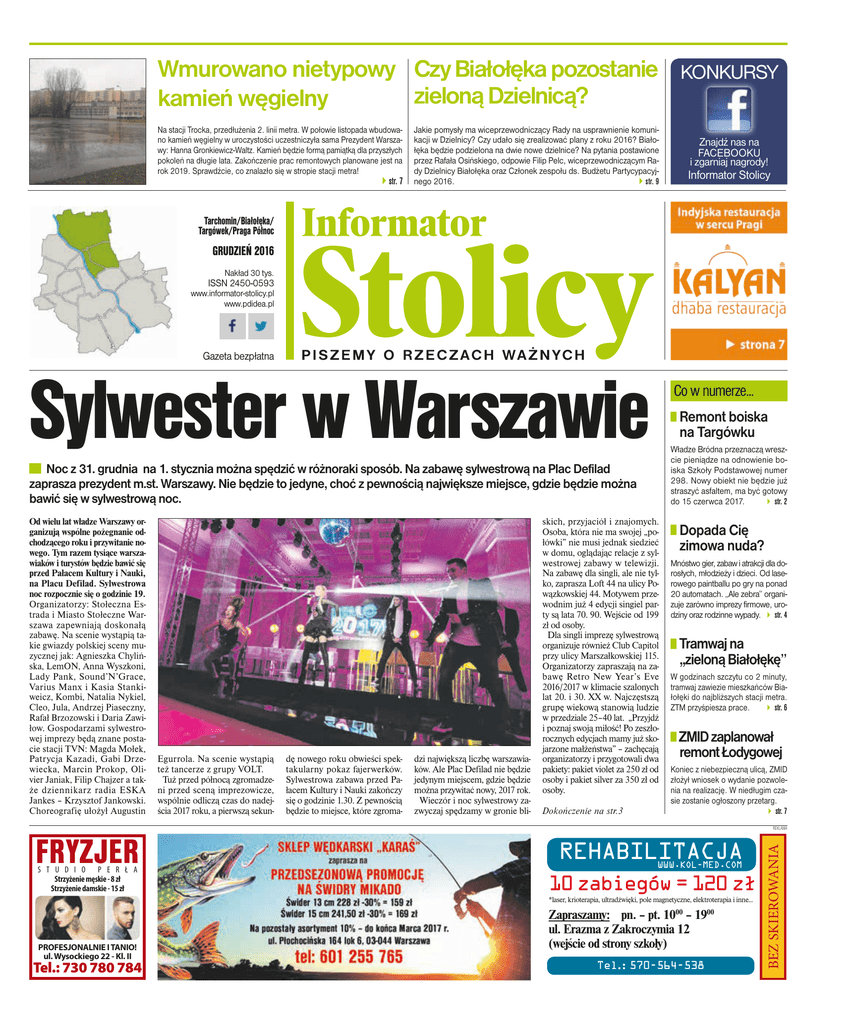 Wmurowano nietypowy Czy Białołęka pozostanie KONKURSY zieloną Dzielnicą? kamień węgielny Na stacji Trocka, przedłużenia 2. linii metra. W połowie listopada wbudowano kamień węgielny w uroczystości uczestniczyła sama Prezydent Warszawy: Hanna Gronkiewicz-Waltz. Kamień będzie formą pamiątką dla przyszłych pokoleń na długie lata. Zakończenie prac remontowych planowane jest na rok 2019. Sprawdźcie, co znalazło się w stropie stacji metra! } str. 7 Jakie pomysły ma wiceprzewodniczący Rady na usprawnienie komunikacji w Dzielnicy? Czy udało się zrealizować plany z roku 2016? Białołęka będzie podzielona na dwie nowe dzielnice? Na pytania postawione przez Rafała Osińskiego, odpowie Filip Pelc, wiceprzewodniczącym Rady Dzielnicy Białołęka oraz Członek zespołu ds. Budżetu Partycypacyjnego 2016. } str. 9 Znajdź nas na FACEBOOKU i zgarniaj nagrody! Informator Stolicy Tarchomin/Białołęka/ Targówek/Praga Północ GRUDZIEŃ 2016 Nakład 30 tys. ISSN 2450-0593 www.informator-stolicy.pl www.pdidea.pl Gazeta bezpłatna Sylwester w Warszawie Co w numerze... Remont boiska na Targówku Władze Bródna przeznaczą wreszcie pieniądze na odnowienie boiska Szkoły Podstawowej numer 298. Nowy obiekt nie będzie już straszyć asfaltem, ma być gotowy do 15 czerwca 2017. str. 2 Noc z 31. grudnia na 1. stycznia można spędzić w różnoraki sposób. Na zabawę sylwestrową na Plac Defilad zaprasza prezydent m.st. Warszawy. Nie będzie to jedyne, choć z pewnością największe miejsce, gdzie będzie można bawić się w sylwestrową noc. RUMPEL FRYZJER S T U D I O P E R Ł A Strzyżenie męskie - 8 zł Strzyżenie damskie - 15 zł Egurrola. Na scenie wystąpią też tancerze z grupy VOLT. Tuż przed północą zgromadzeni przed sceną imprezowicze, wspólnie odliczą czas do nadejścia 2017 roku, a pierwszą sekun- dę nowego roku obwieści spektakularny pokaz fajerwerków. Sylwestrowa zabawa przed Pałacem Kultury i Nauki zakończy się o godzinie 1.30. Z pewnością będzie to miejsce, które zgroma- dzi największą liczbę warszawiaków. Ale Plac Defilad nie będzie jedynym miejscem, gdzie będzie można przywitać nowy, 2017 rok. Wieczór i noc sylwestrowy zazwyczaj spędzamy w gronie bli- skich, przyjaciół i znajomych. Osoba, która nie ma swojej „połówki” nie musi jednak siedzieć w domu, oglądając relacje z sylwestrowej zabawy w telewizji. Na zabawę dla singli, ale nie tylko, zaprasza Loft 44 na ulicy Powązkowskiej 44. Motywem przewodnim już 4 edycji singiel party są lata 70. 90. Wejście od 199 zł od osoby. Dla singli imprezę sylwestrową organizuje również Club Capitol przy ulicy Marszałkowskiej 115. Organizatorzy zapraszają na zabawę Retro New Year’s Eve 2016/2017 w klimacie szalonych lat 20. i 30. XX w. Najczęstszą grupę wiekową stanowią ludzie w przedziale 25–40 lat. „Przyjdź i poznaj swoją miłość! Po zeszłorocznych edycjach mamy już skojarzone małżeństwa” – zachęcają organizatorzy i przygotowali dwa pakiety: pakiet violet za 250 zł od osoby i pakiet silver za 350 zł od osoby. Dokończenie na str.3 Dopada Cię zimowa nuda? Mnóstwo gier, zabaw i atrakcji dla dorosłych, młodzieży i dzieci. Od laserowego paintballu po gry na ponad 20 automatach. „Ale zebra” organizuje zarówno imprezy firmowe, urodziny oraz rodzinne wypady. str. 4 Tramwaj na ,,zieloną Białołękę’’ W godzinach szczytu co 2 minuty, tramwaj zawiezie mieszkańców Białołęki do najbliższych stacji metra. ZTM przyśpiesza prace. str. 6 ZMID zaplanował remont Łodygowej Koniec z niebezpieczną ulicą, ZMID złożył wniosek o wydanie pozwolenia na realizację. W niedługim czasie zostanie ogłoszony przetarg. str. 7 REKLAMA REHABILITACJA WWW.KOL-MED.COM 10 zabiegów = 120 zł *laser, krioterapia, ultradźwięki, pole magnetyczne, elektroterapia i inne... PROFESJONALNIE I TANIO! ul. Wysockiego 22 - Kl. II Tel.: 730 780 784 Zapraszamy: pn. – pt. 1000 – 1900 ul. Erazma z Zakroczymia 12 (wejście od strony szkoły) Tel.: 570-564-538 BEZ SKIEROWANIA Od wielu lat władze Warszawy organizują wspólne pożegnanie odchodzącego roku i przywitanie nowego. Tym razem tysiące warszawiaków i turystów będzie bawić się przed Pałacem Kultury i Nauki, na Placu Defilad. Sylwestrowa noc rozpocznie się o godzinie 19. Organizatorzy: Stołeczna Estrada i Miasto Stołeczne Warszawa zapewniają doskonałą zabawę. Na scenie wystąpią takie gwiazdy polskiej sceny muzycznej jak: Agnieszka Chylińska, LemON, Anna Wyszkoni, Lady Pank, Sound’N’Grace, Varius Manx i Kasia Stankiweicz, Kombi, Natalia Nykiel, Cleo, Jula, Andrzej Piaseczny, Rafał Brzozowski i Daria Zawiłow. Gospodarzami sylwestrowej imprezy będą znane postacie stacji TVN: Magda Mołek, Patrycja Kazadi, Gabi Drzewiecka, Marcin Prokop, Olivier Janiak, Filip Chajzer a także dziennikarz radia ESKA Jankes – Krzysztof Jankowski. Choreografię ułożył Augustin 2 | Sport i motoryzacja TARCHOMIN/BIAŁOŁĘKA/PRAGA PÓŁNOC/TARGÓWEK | GRUDZIEŃ 2016 | www.informator-stolicy.pl I edycja Nocnego Biegu Praskiego W sobotę 10. grudnia odbył się pierwszy w historii Nocny Bieg Praski, w którym, by przebiec po zmroku ulicami Pragi, wzięło udział niemal 1000 osób D o udziału w biegu po Pradze zapraszał Urząd dzielnicy, i chociaż pogoda nie dopisała, na miejscu pojawiło się wiele osób, by uczestniczyć w wydarzeniu. Organizatorzy obawiali się, że pogoda zniechęci wiele osób, które się uprzednio zgłosiło. Jednak dla biegaczy deszcz nie okazał się przeszkodą: – Jak ktoś biega, to taki deszcz to nie problem, biega się zawsze bez względu na pogodę – komentował jeden z uczestników biegu, pan Marek. Na miejscu pojawiło się niemal, tysiąc biegaczy, a wielu z nich przyszło w grupach razem ze znajomymi, inni choć biegli w pojedynkę, wspierani byli przez towarzyszy, którzy oczekiwali na nich na mecie. Przed biegiem wszyscy się rozgrzewali i pozytywnie 