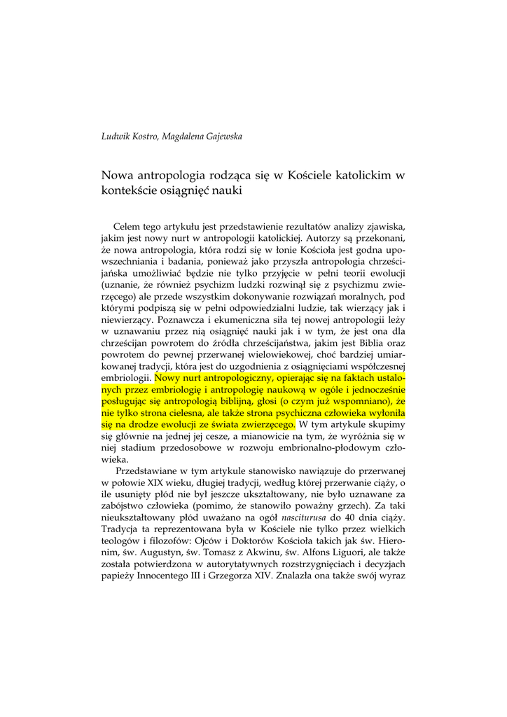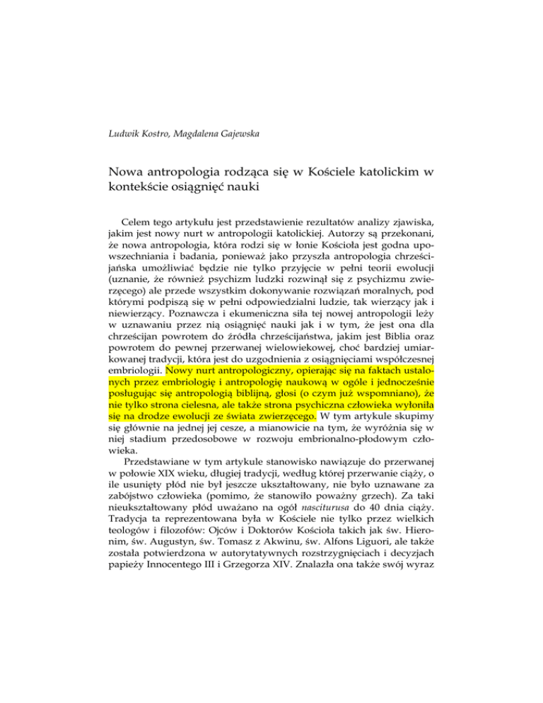 Ludwik Kostro, Magdalena Gajewska Nowa antropologia rodząca się w Kościele katolickim w kontekście osiągnięć nauki Celem tego artykułu jest przedstawienie rezultatów analizy zjawiska, jakim jest nowy nurt w antropologii katolickiej. Autorzy są przekonani, że nowa antropologia, która rodzi się w łonie Kościoła jest godna upowszechniania i badania, ponieważ jako przyszła antropologia chrześcijańska umożliwiać będzie nie tylko przyjęcie w pełni teorii ewolucji (uznanie, że również psychizm ludzki rozwinął się z psychizmu zwierzęcego) ale przede wszystkim dokonywanie rozwiązań moralnych, pod którymi podpiszą się w pełni odpowiedzialni ludzie, tak wierzący jak i niewierzący. Poznawcza i ekumeniczna siła tej nowej antropologii leży w uznawaniu przez nią osiągnięć nauki jak i w tym, że jest ona dla chrześcijan powrotem do źródła chrześcijaństwa, jakim jest Biblia oraz powrotem do pewnej przerwanej wielowiekowej, choć bardziej umiarkowanej tradycji, która jest do uzgodnienia z osiągnięciami współczesnej embriologii. Nowy nurt antropologiczny, opierając się na faktach ustalonych przez embriologię i antropologię naukową w ogóle i jednocześnie posługując się antropologią biblijną, głosi (o czym już wspomniano), że nie tylko strona cielesna, ale także strona psychiczna człowieka wyłoniła się na drodze ewolucji ze świata zwierzęcego. W tym artykule skupimy się głównie na jednej jej cesze, a mianowicie na tym, że wyróżnia się w niej stadium przedosobowe w rozwoju embrionalno-płodowym człowieka. Przedstawiane w tym artykule stanowisko nawiązuje do przerwanej w połowie XIX wieku, długiej tradycji, według której przerwanie ciąży, o ile usunięty płód nie był jeszcze ukształtowany, nie było uznawane za zabójstwo człowieka (pomimo, że stanowiło poważny grzech). Za taki nieukształtowany płód uważano na ogół nasciturusa do 40 dnia ciąży. Tradycja ta reprezentowana była w Kościele nie tylko przez wielkich teologów i filozofów: Ojców i Doktorów Kościoła takich jak św. Hieronim, św. Augustyn, św. Tomasz z Akwinu, św. Alfons Liguori, ale także została potwierdzona w autorytatywnych rozstrzygnięciach i decyzjach papieży Innocentego III i Grzegorza XIV. Znalazła ona także swój wyraz w nie zmienianym przez wiele wieków kanonie 20 „Sicut ex” tworzącego się wówczas prawa kanonicznego (po łacinie Corpus Iuris Canonici). Jednak, aby nurt filozoficzno-teologiczny, który tu zostanie przedstawiony mógł być dobrze odczytany i zrozumiany należy najpierw w kilku słowach przedstawić antropologie, które w takim czy innym okresie, wysuwały się na plan pierwszy w historii Kościoła. (1) W Kościele w pierwszych trzech wiekach ery chrześcijańskiej duże znaczenie przypisywano antropologii biblijnej tj. hebrajska1. Była ona wyrażona w obrazowym i symbolicznym języku człowieka biblijnego, któremu brakowało jeszcze wielu abstrakcyjnych pojęć do wyrażenia głębokich prawd. Według tej antropologii człowiek to istota ukształtowana z prochu ziemi (adama = ziemia, adamach = ten z prochu ziemi) i ożywiona tchnieniem życia „oddechem życia” („I ulepił Bóg Jahwe człowieka, proch ziemi i tchnął w jego nozdrza „oddech życia” i stał się człowiek duszą żyjącą”” Ks. Rodz. 2, 7-8). Terminy „ciało” (ukształtowane z prochu ziemi) i „dusza żyjąca” (co znaczyło właściwie „istota oddychającą”) stanowiły w Biblii synonimy2. Oznaczały one, każdy z osobna, całego człowieka (A Słowo ciałem się stało = stało się człowiekiem, Jan 1, 14). Terminy te stosowane były także często do określania zwierząt. Zwane one były także „ciałami” i „duszami żyjącymi”. Bo także powstały z prochu ziemi i oddychały. Różnica pomiędzy człowiekiem a zwierzęciem polegała na tym, że został on „stworzony na obraz i podobieństwo Boże” tzn. stanowi on istotę rozumną. Człowiek podobnie jak zwierzęta jest istotą śmiertelną („Prochem jesteś i w proch się obrócisz” Ks. Rodz. 3,19). Biblia hebrajska nie znała pojęcia nieśmiertelnej z natury duszy, mogącej trwać nawet po śmierci bez ciała3. Pojęcie nieśmiertelnej duszy jest pochodzenia helleńskiego. Wywodzi się ono z religii orfickiej i poprzez pitagoreizm, platonizm i neoplatonizm przeniknęło do chrześcijaństwa, dopiero w III i IV wieku nowej ery tj. gdy chrześcijaństwo ogarnęło świat helleński i imperium rzymskie. Wpływ helleński na religię judaistyczną zauważyć można już w okresie przedchrześcijańskim4. _____________ 1 R.T. Francoeur, Horyzonty ewolucji, Instytut Wydawniczy PAX, Warszawa 1969, s. 218. J. Ratzinger, Wprowadzenie w chrześcijaństwo, Znak, Kraków 2006, s. 368. J. Ratzinger, Śmierć i życie wieczne, ADAM i PAX, Warszawa 2000, s. 102–103. 4 Wyrażony jest on w Księdze Mądrości napisanej po grecku i dopiero z opóźnieniem włączonej przez Kościół do kanonu ksiąg świętych. To opóźnienie powoduje, że stanowi ona nie protokanoniczną ale deuterokanoniczną księgę Pism św. Starego Testamentu nie uznawaną przez judaizm i później przez protestantów. Por. R.T Francoeur, dz. cyt., s. 218. 2 3 2 (2) Wraz ze wzrostem znaczenia nowej religii w Imperium Rzymskim, antropologia hebrajska została wyparta przez antropologię, która korzeniami swymi, co już wspomniano, tkwi w religii orfickiej, a szczególniej w antropologii platońskiej i neoplatońskiej. Pierwotne chrześcijaństwo dokonało połączenia prawdy wiary o człowieku z antropologią Platona i Plotyna. Według tej antropologii dusza i ciało to dwie substancje mogące istnieć niezależnie od siebie5. (3) Antropologią, która pojawiła się w średniowieczu i która przetrwała z pewnymi zmianami do dnia dzisiejszego, jest antropologia arystotelesowsko-tomistyczna. Kościół zawdzięcza ją głównie św. Tomaszowi z Akwinu. Według Arystotele