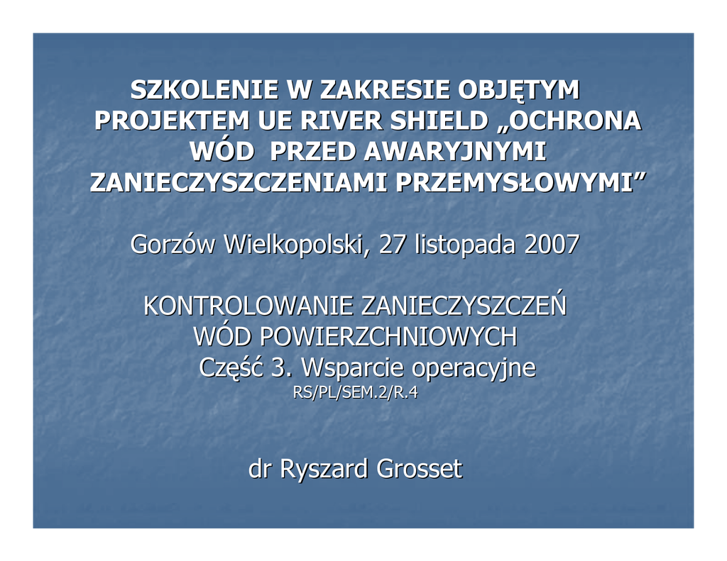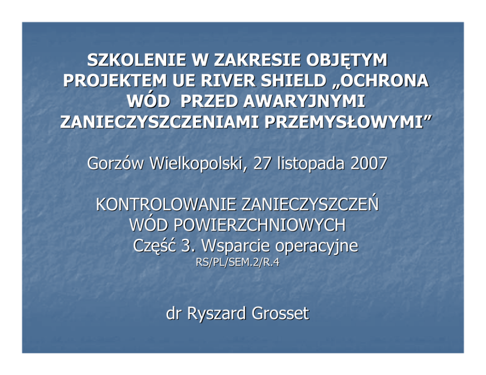 SZKOLENIE W ZAKRESIE OBJĘTYM PROJEKTEM UE RIVER SHIELD „OCHRONA WÓD PRZED AWARYJNYMI ZANIECZYSZCZENIAMI PRZEMYSŁOWYMI” Gorzów Wielkopolski, 27 listopada 2007 KONTROLOWANIE ZANIECZYSZCZEŃ WÓD POWIERZCHNIOWYCH Część 3. Wsparcie operacyjne RS/PL/SEM.2/R.4 dr Ryszard Grosset TYMCZASOWE MAGAZYNOWANIE ODPADÓW Wybór lokalizacji obszaru do tymczasowego magazynowania zależy od ukształtowania terenu, od możliwości dostępu środków transportu, a także od statusu obszaru ze względu na wymagania ochrony środowiska. n Tymczasowe osadniki gnilne, duże plastikowe worki, beczki lub samochody ciężarowe mogą być wykorzystane do potrzeb tymczasowego magazynowania odpadów poawaryjnych. n W przypadku, gdy wyciek substancji ropopochodnych zanieczyszcza odbiornik wodny lub gdy zbierany materiał musi być transportowany drogami wodnymi, zaleca się użycie jednostek pływających. Typowe jednostki pływające wykorzystywane do tymczasowego magazynowania to małe łodzie o pojemności około 2 m3. Dobrze jeśli wyposażone są one w plastikowe pokrywy lub plandeki. GOSPODAROWANIE ODPADAMI POAWARYJNYMI W celu ograniczenia ilości odpadów powstających w trakcie reagowania na awarię przemysłową, należy wziąć pod uwagę co następuje: n użycie środków reagowania powinno być wyważone i ostrożne, n sprzęt i środki zwalczania wycieków powinny być odpowiednio dostosowane do rodzaju zdarzenia z możliwością ich wielokrotnego użycia, n zastosowanie nieodzyskiwalnych materiałów i detergentów powinno być uzasadnione, n zaleca się unieszkodliwianie odpadów in-situ. GOSPODAROWANIE ODPADAMI POAWARYJNYMI n n n n n W przypadku odpadów stałych zaleca się przestrzeganie następujących zasad: nie mieszać odpadów olejowych z innymi, obszar, na którym są unieszkodliwiane lub są przechowywane odpady ropopochodnych musi być chroniony przez zastosowanie plastikowych pokryć, w przypadku, gdy gromadzona jest zanieczyszczona gleba, to zbierane w tym samym czasie ilości substancji zanieczyszczającej powinny być tak małe, jak to możliwe, konieczne jest zidentyfikowanie źródła odpadów, przed ich ostatecznym unieszkodliwieniem. GOSPODAROWANIE ODPADAMI POAWARYJNYMI W przypadku odpadów ciekłych zaleca się: n unieszkodliwienie całkowitej ilość substancji chemicznej zmagazynowanej na jednostkach pływających, n zabezpieczenie całej jednostki pływającej w celu uniknięcia akumulacji wody deszczowej, n preferowanie biodegradowalnych detergentów chemicznych, n racjonalne korzystanie z wody do mycia zanieczyszczonych materiałów, n trzymanie bliżej nieokreślonych odpadów oddzielnie, aż do momentu ich zidentyfikowania. SZKOLENIA W ZAKRESIE REAGOWANIA Podstawowe zagadnienia programu edukacyjnego są następujące: n techniki natychmiastowego reagowania i techniki ratownicze, n zdrowie i bezpieczeństwo, n użytkowanie i konserwacja sprzętu ratowniczego. Techniki natychmiastowego reagowania i techniki ratownicze Podstawowy program obejmuje: n wstępne reagowanie i mobilizację struktury reagowania, n schemat organizacji na wypadek zagrożenia i odpowiedzialność każdej z jednostek, n zapewnienie łączności między jednostkami biorącymi udział w działaniach ratowniczych, n systemy pracy, środki i metody komunikowania/łączności,. n dane o substancjach niebezpiecznych i techniki ratownicze, n wizję lokalną i ocenę awarii, n podstawowe techniki ograniczania i izolacji wycieku. Zdrowie i bezpieczeństwo Zespół bezpośredniego reagowania: jego edukacja powinna obejmować następujące zagadnienia: n wiedza na temat właściwości fizykochemicznych zanieczyszczeń oraz zagrożeń z nimi związanych, n ocena in-situ sytuacji niebezpiecznych, która uwzględnia geomorfologię terenu i warunki pogodowe, n zapewnienie bezpieczeństwa na zanieczyszczonym obszarze, n stosowanie środków ochrony indywidualnej, n bezpieczne użytkowanie sprzętu i środków chemicznych, n przewidywanie możliwości rozprzestrzeniania się wycieku, determinującego zagrożenie gruntu, wód powierzchniowych i podziemnych oraz skupisk ludzkich, n ocena potrzeby użycia dodatkowych środków reagowania, n kontrola zanieczyszczonego obszaru, n uwzględnianie niebezpieczeństw związanych z technikami ograniczania skutków i przywracania środowiska do stanu poprzedniego, n właściwe stosowanie środków łączności, n oczyszczanie i dekontaminacja personelu i sprzętu, n zagospodarowanie wytworzonych odpadów. Zdrowie i bezpieczeństwo Szkolenie zespołu ratowniczego powinno obejmować następujące zagadnienia: n wiedza na temat zagrożeń wynikających ze stosowania technik ratowniczych, n planowanie i podejmowanie odpowiednich działań zapewniających bezpieczeństwo z uwzględnieniem dostępnych środków i istniejących warunków, n identyfikacja i pomiary substancji niebezpiecznych (łatwopalnych, toksycznych) na miejscu awarii z użyciem odpowiednich przyrządów, n ocena postępu prac i potwierdzenie adekwatności działań zapewniających bezpieczeństwo, n możliwości oszacowania zakresu skutków awarii i ponowne dopasowanie działań zapewniających bezpieczeństwo w zależności od uwarunkowań, n działania specjalne, np. w sytuacjach takich jak: pojawienie się ognia, n wiedza na temat potencjalnego ryzyka związanego ze stosowaniem sprzętu ochrony osobistej (respiratory itp.), n oczyszczanie i dekontaminacja personelu i sprzętu, n bezpieczne magazynowanie, transport i unieszkodliwianie zanieczyszczonych odpadów, n wiedza na temat podstawowych danych o substancjach niebezpiecznych i stosowanych technikach reagowania, n środki pierwszej pomocy Ogólne instrukcje bezpieczeństwa: n n n n każdy, kto jest zaangażowany w działania ratownicze, musi być odpowiednio przeszkolony w zakresie prawidłowego stosowania środków ochrony osobistej, procesów oczyszczania (dekontaminacji), systemów łączności i udzielania pierwszej pomocy, nieuzasadnione przebywanie l