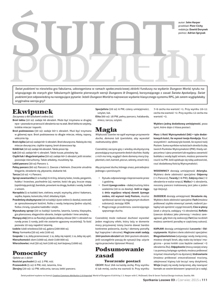 ŚWIAT autor: John Harper przekład: Piotr Cichy redakcja: Dawid Dorynek pomoc: Adrian Sprysak PODZIEMI Świat podziemi to niewielka gra fabularna, udostępniona w ramach społecznościowej zbiórki funduszy na wydanie Dungeon World, tytułu nawiązującego do starych gier fabularnych (głównie pierwszych wersji Dungeons & Dragons), korzystającego z zasad Świata Apokalipsy. Świat podziemi jest odpowiedzią na następujące pytanie: Jeżeli Dungeon World to najnowsze wydanie klasycznego systemu RPG, jak zatem wyglądałaby oryginalna wersja gry? Ekwipunek Zaczynasz z 60 sztukami srebra (ss). Broń lekka (10 ss): zadaje k6 obrażeń. Może być trzymana w drugiej Specjalista (20 ss): 6 PW, cztery umiejętności, sztylet, łuk. cecha ma wartość +2. Przy wyniku 12 cecha ma Elita (60 ss): 18 PW, pełny pancerz, halabarda, Broń podstawowa (30 ss): zadaje k6+1 obrażeń. Musi być trzymana w głównej ręce. Broń podstawowa to długie miecze, młoty, topory, włócznie itp. Broń ciężka (40 ss): zadaje k6+2 obrażeń. Broń dwuręczna. Należą do niej wartość +3. miecz, tarcza, sztylet. Wybierz jedną dodatkową umiejętność, poza ręce – pozwala to przerzucić obrażenia raz na atak. Broń lekka to sztylety, krótkie miecze i toporki. 7–9 cecha ma wartość +1. Przy wyniku 10–11 Magia tymi, które daje ci klasa postaci. Większość czarów na ogół wymaga przyzwania Masz 1 Kość Wytrzymałości (k6) + tyle dodat- ducha, demona lub żywiołaka, aby wywołał kowych kości, ile wynosi twoja Kondycja. Rzuć nadnaturalny efekt. wszystkimi i zachowaj tyle kostek, ile wynosi twój miecze dwuręczne, ciężkie topory, broń drzewcowa itp. Poziom. Suma wyników na kościach określa liczbę Krótki łuk (10 ss): zadaje k6 obrażeń. Także proce itp. Czarodziej zaczyna grę z wiedzą okultystyczną twoich Punktów Wytrzymałości (PW). Kiedy od- Łuk (30 ss): zadaje k6+1 obrażeń. Także kusze, pistolety itp. pozwalającą na przyzwanie dwóch duchów. Każdy poczniesz i zjesz prowiant lub wypijesz zawartość Ciężki łuk / długa broń palna (50 ss): zadaje k6+2 obrażeń, jeśli strzelec z nich ma imię, wygląd i dwie domeny mocy (np. bukłaka z wodą bądź winem, możesz ponownie płomień, cień, kamień, piorun, sekrety, strach itd.). rzucić na PW. Jeśli opiekuje się tobą uzdrowiciel, pozostaje nieruchomy. Także arbalety, muszkiety itp. Lekki pancerz (30 ss): Pancerz 1. Pełny pancerz (60 ss): Pancerz 2. Zawsze z hełmem. Znacznie utrudnia bieganie, skradanie się, pływanie, skakanie itd. rzuć dodatkową Kością Wytrzymałości. Aby przyzwać ducha, którego znasz, potrzebujesz WOJOWNICY dostają umiejętność Atletyka. jednego z poniższych: Tarcza (10 ss): +1 Pancerz. Sprzęt awanturnika (2 ss każdy): 6 m liny, żelazny kolec, kreda, pergamin, hubka i krzesiwo, pochodnie (4), namiot, kości do gry, krucze stopy (opóźniają pościg), bandaże, prowiant na drogę, bukłak z wodą, bukłak z winem. Narzędzia (5 ss każde): łom, siekiera, wnyki, wytrychy, pióro i kałamarz, wędka, łopata, kotwiczka, kilof, składany kijek. Przedmioty okultystyczne (10 ss każdy): żywe srebro (1 dawka), woreczek ze sproszkowanymi kośćmi, fiolka z wodą święconą (jedno użycie), fiolka z krwią, rytualne kadzidło i olejki. Wyszukany sprzęt (20 ss każdy): lusterko, latarnia, luneta, klepsydra, Wybierz dwie zdolności specjalne: Odporny • Rytuału odprawianego nieprzerwanie przez (+1 Pancerz), Twardy (+6 PW), Zabjczy cios (+2 obrażenia w walce wręcz), Walka (+1 obrażenia, 1 godzinę. • Dawki żywego srebra – słabej trucizny, która uzależnia (10 ss za dawkę). Jeśli w ciągu noszony pancerz traktowany jest jako o jeden typ lżejszy). 1 dnia wypijesz więcej dawek żywego srebra, niż wynosi twój Poziom, musisz ZŁODZIEJE dostają umiejętność Skradanie się. spróbować oprzeć się negatywnym skutkom Wybierz dwie zdolności specjalne: Fach (możesz substancji, testując KON. próbować szybko otworzyć zamek, rozbroić pu- • Magicznego przedmiotu zawierającego łapkę lub opróżnić czyjąś kieszeń), Cios w plecy (atak z ukrycia, zadający +3 obrażenia), Refleks spętanego ducha. gra planszowa, eleganckie ubranie, święte symbole i inne amulety. (zawsze działasz jako pierwszy i możesz zare- Płonący olej (20 ss za flaszkę): podpala oblany obszar (k6+1 obrażeń na Czarodziej może rozkazać duchowi wywołać agować, gdy ktoś cię zaskoczy), Fart (raz na dzień rundę przez 3 rundy, jeśli nie zostanie ugaszony wcześniej). Ta ilość jeden magiczny efekt, który leży w domenie możesz zamienić porażkę w częściowy sukces). pozwala 10 razy napełnić latarnię. mocy przyzwanej istoty (warto dawać bardzo Łodzie: Łódź wiosłowa (50 ss), galera (200 000 ss). konkretne polecenia, duchy i demony potrafią KAPŁANI dostają umiejętności Leczenie i Od- Wozy: furmanka (30 ss), wóz (100 ss). być kapryśne i okrutne). Magiczne ataki zadają czytywanie. Wybierz dwie zdolności specjalne: Gospoda: 1 ss, żeby przenocować; 1 ss, żeby się najeść; 1 ss, żeby się upić. 2k6+poziom obrażeń lub 3k6+poziom obrażeń, Błogosławieństwo (używając wody święconej, Nieruchomości: dom (1000 ss), dwór (100 000 ss). jeśli szczególnie pasują do sytuacji (np. użycie możesz skropić broń, aby stała się święta i ma- Wierzchowiec: muł (30 ss), koń (100 ss), koń bojowy (1000 ss). ognia przeciwko Upiorowi Mrozu). giczna – przez krótki czas będzie zadawać +3 obrażenia Złu), Odpędzanie (mocą swojej wiary Pomocnicy Podsumowanie zasad Opłata za 1 dzień Nosiciel pochodni (2 ss): 3 PW, nóż. Tworzenie postaci i za pomocą świętego symbolu możesz próbować trzymać nieumarłych na dystans), Uzdrawianie (możesz próbować zneutralizować trucizny, zdejmować klątwy lub leczyć rany dotykiem), Przewodnik (5 ss): 6 PW, nóż, latarnia, lina. CECHY: Rzuć 2k6 na każdą cechę. Przy wyniku Wizje (napij się wody święc