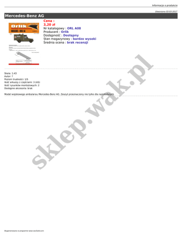 Informacje o produkcie Utworzono 03-03-2017 Mercedes-Benz AG Cena : 3,20 zł pl Nr katalogowy : ORL A08 Producent : Orlik Dostępność : Dostępny Stan magazynowy : bardzo wysoki Średnia ocena : brak recenzji w ak . Skala: 1:43 Autor: ? Poziom trudności: 1/5 Ilość arkuszy z częściami: 3 (A5) Ilość rysunków montażowych: 2 Dostępne akcesoria: brak sk le p. Model wojskowego ambulansu Mercedes-Benz AG. Zeszyt przeznaczony nie tylko dla najmłodszych. Wygenerowano w programie www.oscGold.com