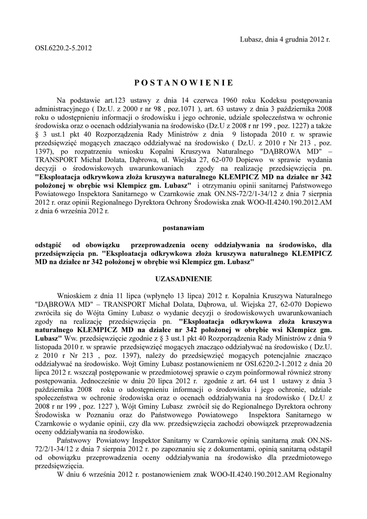 Lubasz, dnia 4 grudnia 2012 r. OSI.6220.2-5.2012 PO S TAN OW I E N I E Na podstawie art.123 ustawy z dnia 14 czerwca 1960 roku Kodeksu postępowania administracyjnego ( Dz.U. z 2000 r nr 98 , poz.1071 ), art. 63 ustawy z dnia 3 października 2008 roku o udostępnieniu informacji o środowisku i jego ochronie, udziale społeczeństwa w ochronie środowiska oraz o ocenach oddziaływania na środowisko (Dz.U z 2008 r nr 199 , poz. 1227) a także § 3 ust.1 pkt 40 Rozporządzenia Rady Ministrów z dnia 9 listopada 2010 r. w sprawie przedsięwzięć mogących znacząco oddziaływać na środowisko ( Dz.U. z 2010 r Nr 213 , poz. 1397), po rozpatrzeniu wniosku Kopalni Kruszywa Naturalnego "DĄBROWA MD" – TRANSPORT Michał Dolata, Dąbrowa, ul. Wiejska 27, 62-070 Dopiewo w sprawie wydania decyzji o środowiskowych uwarunkowaniach zgody na realizację przedsięwzięcia pn. "Eksploatacja odkrywkowa złoża kruszywa naturalnego KLEMPICZ MD na działce nr 342 położonej w obrębie wsi Klempicz gm. Lubasz" i otrzymaniu opinii sanitarnej Państwowego Powiatowego Inspektora Sanitarnego w Czarnkowie znak ON.NS-72/2/1-34/12 z dnia 7 sierpnia 2012 r. oraz opinii Regionalnego Dyrektora Ochrony Środowiska znak WOO-II.4240.190.2012.AM z dnia 6 września 2012 r. postanawiam odstąpić od obowiązku przeprowadzenia oceny oddziaływania na środowisko, dla przedsięwzięcia pn. "Eksploatacja odkrywkowa złoża kruszywa naturalnego KLEMPICZ MD na działce nr 342 położonej w obrębie wsi Klempicz gm. Lubasz" UZASADNIENIE Wnioskiem z dnia 11 lipca (wpłynęło 13 lipca) 2012 r. Kopalnia Kruszywa Naturalnego "DĄBROWA MD" – TRANSPORT Michał Dolata, Dąbrowa, ul. Wiejska 27, 62-070 Dopiewo zwróciła się do Wójta Gminy Lubasz o wydanie decyzji o środowiskowych uwarunkowaniach zgody na realizację przedsięwzięcia pn. "Eksploatacja odkrywkowa złoża kruszywa naturalnego KLEMPICZ MD na działce nr 342 położonej w obrębie wsi Klempicz gm. Lubasz" Ww. przedsięwzięcie zgodnie z § 3 ust.1 pkt 40 Rozporządzenia Rady Ministrów z dnia 9 listopada 2010 r. w sprawie przedsięwzięć mogących znacząco oddziaływać na środowisko ( Dz.U. z 2010 r Nr 213 , poz. 1397), należy do przedsięwzięć mogących potencjalnie znacząco oddziaływać na środowisko. Wojt Gminy Lubasz postanowieniem nr OSI.6220.2-1.2012 z dnia 20 lipca 2012 r. wszczął postępowanie w przedmiotowej sprawie o czym poinformował również strony postępowania. Jednocześnie w dniu 20 lipca 2012 r. zgodnie z art. 64 ust 1 ustawy z dnia 3 października 2008 roku o udostępnieniu informacji o środowisku i jego ochronie, udziale społeczeństwa w ochronie środowiska oraz o ocenach oddziaływania na środowisko ( Dz.U z 2008 r nr 199 , poz. 1227 ), Wójt Gminy Lubasz zwrócił się do Regionalnego Dyrektora ochrony Środowiska w Poznaniu oraz do Państwowego Powiatowego Inspektora Sanitarnego w Czarnkowie o wydanie opinii, czy dla ww. przedsięwzięcia zachodzi obowiązek przeprowadzenia oceny oddziaływania na środowisko. Państwowy Powiatowy Inspektor Sanitarny w Czarnkowie opinią sanitarną znak ON.NS72/2/1-34/12 z dnia 7 sierpnia 2012 r. po zapoznaniu się z dokumentami, opinią sanitarną odstąpił od obowiązku przeprowadzenia oceny oddziaływania na środowisko dla przedmiotowego przedsięwzięcia. W dniu 6 września 2012 r. postanowieniem znak WOO-II.4240.190.2012.AM Regionalny Dyrektor Ochrony Środowiska w Poznaniu, wyraził opinię, że w przypadku ww. przedsięwzięcia nie istnieje konieczność przeprowadzenia oceny oddziaływania na środowisko. Biorąc pod uwagę szczegółowe uwarunkowania związane z kwalifikowaniem przedsięwzięcia mogącego potencjalnie znacząco oddziaływać na środowisko do przeprowadzenia oceny oddziaływania przedsięwzięcia na środowisko, a w szczególności rodzaj i charakter przedsięwzięcia, z uwzględnieniem skali przedsięwzięcia i wielkości zajmowanego terenu oraz rodzaj i skalę możliwego oddziaływania przedsięwzięcia na środowisko, a także stanowiska wyrażone w opinii Państwowego Powiatowego Inspektora Sanitarnego w Czarnkowie i postanowieniu Regionalnego Dyrektora Ochrony Środowiska, postanowiono odstąpić od obowiązku przeprowadzenia oceny oddziaływania przedsięwzięcia na środowisko dla przedmiotowej inwestycji. Pouczenie Zgodnie z art. 65 ust. 2 cytowanej wyżej ustawy na postanowienie w sprawie stwierdzenia obowiązku przeprowadzenia oceny oddziaływania przedsięwzięcia na środowisko i określenia zakres raportu o oddziaływaniu przedsięwzięcia na środowisko przysługuje stronom zażalenie do Samorządowego Kolegium Odwoławczego w Pile za pośrednictwem Wójta Gminy Lubasz w terminie 7 dni od daty doręczenia postanowienia. Wójt Gminy Lubasz Zbigniew Jahns