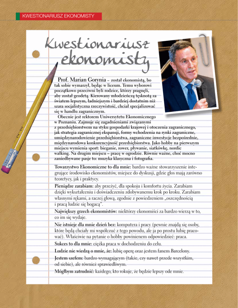 KWESTIONARIUSZ EKONOMISTY Prof. Marian Gorynia – został ekonomistą, bo tak sobie wymarzył, będąc w liceum. Temu wyborowi początkowo przeciwni byli rodzice, którzy pragnęli, aby został geodetą. Kierowany młodzieńczą tęsknotą za światem lepszym, ładniejszym i bardziej dostatnim niż szara socjalistyczna rzeczywistość, chciał specjalizować się w handlu zagranicznym. Obecnie jest rektorem Uniwersytetu Ekonomicznego w Poznaniu. Zajmuje się zagadnieniami związanymi z przedsiębiorstwem na styku gospodarki krajowej i otoczenia zagranicznego, jak strategia zagranicznej ekspansji, formy wchodzenia na rynki zagraniczne, umiędzynarodowienie przedsiębiorstwa, zagraniczne inwestycje bezpośrednie, międzynarodowa konkurencyjność przedsiębiorstwa. Jako hobby na pierwszym miejscu wymienia sport: bieganie, rower, pływanie, siatkówkę, nordic walking. Na drugim miejscu – pracę w ogrodzie. Równie ważne, choć mocno zaniedbywane pasje to: muzyka klasyczna i fotografia. Towarzystwo Ekonomiczne to dla mnie: bardzo ważne stowarzyszenie integrujące środowisko ekonomistów, miejsce do dyskusji, gdzie głos mają zarówno teoretycy, jak i praktycy. Pieniądze zarabiam: aby przeżyć, dla spokoju i komfortu życia. Zarabiam dzięki wykształceniu i doświadczeniu zdobywanemu krok po kroku. Zarabiam własnymi rękami, a raczej głową, zgodnie z powiedzeniem „oszczędnością i pracą ludzie się bogacą”. Największy grzech ekonomistów: niektórzy ekonomiści za bardzo wierzą w to, co im się wydaje. Nie istnieje dla mnie dzień bez: komputera i pracy (pewnie znajdą się osoby, które będą chciały mi współczuć z tego powodu, ale ja po prostu lubię pracować). Właściwie na pytanie o hobby powinienem odpowiedzieć: praca. Sukces to dla mnie: ciężka praca w dochodzeniu do celu. Ludzie nie wiedzą o mnie, że: lubię operę oraz jestem fanem Barcelony. Jestem szefem: bardzo wymagającym (także, czy nawet przede wszystkim, od siebie), ale również sprawiedliwym. Mógłbym zatrudnić: każdego, kto rokuje, że będzie lepszy ode mnie. 48 I Biuletyn PTE nr 4 (71)/2015 Polskie Towarzystwo Ekonomiczne Nie przyjąłbym do pracy: lenia i spóźnialskiego. Konkurencja: jest zdrowa i potrzebna, słusznie nazywa się ją motorem postępu. Wakacje spędzam: czasami z rodziną, czasami z przyjaciółmi, ale zawsze aktywnie i na sportowo. Uwielbiam wakacje z żoną i wnuczkami (mamy trzy). Irytuje mnie: malkontenctwo pomieszane z brakiem zaangażowania i pracowitości. Do szału może mnie doprowadzić: nie pozwalam sobie na wybuchy szału. Nigdy sobie nie odmawiam: lodów. Internet jest: narzędziem pracy, źródłem informacji, ale także dostarcza rozrywki (np. Spotify). Czytam: głównie prasę, książki naukowe, ale lubię też literaturę piękną (klasykę). Oglądam: (w telewizji) sport i czasem wiadomości. Uwielbiam kanał Mezzo – z muzyką poważną. A tak w ogóle to wydaje mi się, że oglądam otaczający mnie świat ze zrozumieniem. Ulubiony gadżet: smartfon i smartwatch. Gdybym nie był tym, kim jestem, mógłbym być: przedsiębiorcą (tego zawodu już spróbowałem jako współwłaściciel firmy konsultingowej około 25 lat temu); druga możliwość to zaawansowane uprawianie sportu, a w późniejszym wieku działacz sportowy (w dobrym tego słowa znaczeniu). Gdyby to ode mnie zależało: po szerokich konsultacjach społecznych wprowadziłbym kilka poprawek do otaczającego świata: niższe ceny, niższe podatki, wyższe zasiłki, krótszy tydzień pracy, niższy wiek emerytalny, dłuższe urlopy… Konieczne byłoby tylko spełnienie warunku: najpierw nasza wydajność pracy musi wzrosnąć dwukrotnie. Najdziwniejsza rzecz, jaką mam, to: warzywnik – wydzielona część ogrodu, gdzie samodzielnie uprawiam warzywa. Kosztuje mnie to dużo wysiłku, ale satysfakcja gwarantowana. Biuletyn PTE nr 4 (71)/2015 I 49