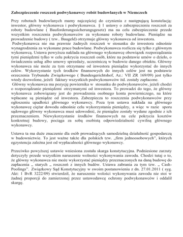 Zabezpieczenie roszczeń podwykonawcy robót budowlanych w Niemczech Przy robotach budowlanych mamy najczęściej do czynienia z następującą konstelacją: inwestor, główny wykonawca i podwykonawca. § 1 ustawy o zabezpieczeniu roszczeń za roboty budowlane ( Bauforderungssicherungsgesetz) ma na celu zabezpieczenie przede wszystkim roszczenia podwykonawców za wykonane roboty budowlane. Pieniądze na prowadzenie budowy ( tzw.. Baugeld) otrzymuje główny wykonawca od inwestora. Podwykonawca nie ma prawnie żadnych roszczeń w stosunku do inwestora odnośnie wynagrodzenia za wykonane prace budowlane. Podwykonawca rozlicza się tylko z głównym wykonawcą. Ustawa powyższa nakłada na głównego wykonawcę obowiązek rozporządzania tymi pieniędzmi tylko w celu pokrycia roszczeń osób, które na podstawie umów o dzieło, o świadczeniu usług albo umowy sprzedaży, uczestniczą w budowie danego obiektu. Główny wykonawca nie może za tym otrzymane od inwestora pieniądze wykorzystać do innych celów. Wykorzystanie tych środków finansowych do innych celów jest na podstawie orzeczenia Trybunału Związkowego ( Bundesgerichtshof, Az.: VII ZR 169/09) jest tylko wtedy dozwolone, jeżeli faktury wszystkich podwykonawców itd. zostały zapłacone. Główny wykonawca ma pozycję powiernika w stosunku do podwykonawców, jeżeli chodzi o rozporządzanie pieniędzmi otrzymanymi od inwestora. To prowadzi do tego, że główny wykonawca zobowiązany jest do prowadzenia osobnego konta powierniczego, na które wpłacane są pieniądze od inwestora. Zabezpiecza to roszczenia podwykonawców przy ogłoszeniu upadłości głównego wykonawcy. Poza tym ustawa nakłada na głównego wykonawcę ciężar dowodu odnośnie celu wykorzystania pieniędzy, a więc w razie sporu sądowego główny wykonawca musi udowodnić, że pieniądze zostały wydane zgodnie z ich przeznaczeniem. Niewykorzystanie środków finansowych na cele pokrycia kosztów konkretnej budowy, pociąga za sobą osobistą odpowiedzialność cywilną głównego wykonawcy. Ustawa ta ma duże znaczenie dla osób prowadzących samodzielną działalność gospodarczą w budownictwie. To jest ważne także dla polskich tzw. „firm jednoosobowych”, których egzystencja zależna jest od wypłacalności głównego wykonawcy. Przeciwko powyższej ustawie wniesiona została skarga konstytucyjna. Podniesione zarzuty dotyczyły przede wszystkim naruszenie wolności wykonywania zawodu. Chodzi tutaj o to, że główny wykonawca nie może wykorzystać pieniędzy przeznaczonych na daną budowę do zapłacenia „ starych „ roszczeń z innych budów. Ustawa zabrania za tym tzw. „ CashPoolings”. Związkowy Sąd Konstytucyjny w swoim postanowieniu z dn. 27.01.2011 ( syg. Akt: 1 BvR 3222/09) stwierdził, że naruszenie wolości wykonywania zawodu nie stoi w żadnej proporcji do zamierzonej przez ustawodawcę ochrony podwykonawców i oddalił skargę.