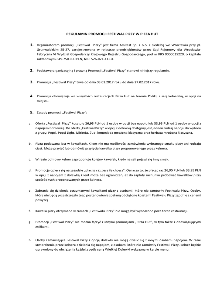 REGULAMIN PROMOCJI FESTIWAL PIZZY W PIZZA HUT 1. Organizatorem promocji „Festiwal Pizzy” jest firma AmRest Sp. z o.o. z siedzibą we Wrocławiu przy pl. Grunwaldzkim 25-27, zarejestrowana w rejestrze przedsiębiorców przez Sąd Rejonowy dla WrocławiaFabryczna VI Wydział Gospodarczy Krajowego Rejestru Gospodarczego, pod nr KRS 0000025220, o kapitale zakładowym 649.750.000 PLN, NIP: 526-021-11-04. 2. Podstawę organizacyjną i prawną Promocji „Festiwal Pizzy” stanowi niniejszy regulamin. 3. Promocja „Festiwal Pizzy” trwa od dnia 03.01.2017 roku do dnia 27.02.2017 roku. 4. Promocja obowiązuje we wszystkich restauracjach Pizza Hut na terenie Polski, z salą kelnerską, w opcji na miejscu. 5. Zasady promocji „Festiwal Pizzy”: a. Oferta „Festiwal Pizzy” kosztuje 26,95 PLN od 1 osoby w opcji bez napoju lub 33,95 PLN od 1 osoby w opcji z napojem z dolewką. Do oferty „Festiwal Pizzy” w opcji z dolewką dostępny jest jednen rodzaj napoju do wyboru z grupy: Pepsi, Pepsi Light, Mirinda, 7up, lemoniada mrożona klasyczna oraz herbata mrożona klasyczna. b. Pizza podawana jest w kawałkach. Klient nie ma możliwości zamówienia wybranego smaku pizzy ani rodzaju ciast. Może przyjąć lub odmówić przyjęcia kawałka pizzy proponowanego przez kelnera. c. W razie odmowy kelner zaproponuje kolejny kawałek, kiedy na sali pojawi się inny smak. d. Promocja opiera się na zasadzie „płacisz raz, jesz ile chcesz”. Oznacza to, że płacąc raz 26,95 PLN lub 33,95 PLN w opcji z napojem z dolewką klient może bez ograniczeń, aż do zapłaty rachunku próbować kawałków pizzy spośród tych proponowanych przez kelnera. e. Zabrania się dzielenia otrzymanymi kawałkami pizzy z osobami, które nie zamówiły Festiwalu Pizzy. Osoby, które nie będą przestrzegały tego postanowienia zostaną obciążone kosztami Festiwalu Pizzy zgodnie z cenami powyżej. f. Kawałki pizzy otrzymane w ramach „Festiwalu Pizzy” nie mogą być wynoszone poza teren restauracji. g. Promocji „Festiwal Pizzy” nie można łączyć z innymi promocjami „Pizza Hut”, w tym także z obowiązującymi zniżkami. h. Osoby zamawiające Festiwal Pizzy z opcję dolewki nie mogą dzielić się z innymi osobami napojem. W razie stwierdzenia przez kelnera dzielenia się napojem, z osobami które nie zamówiły Festiwali Pizzy, kelner będzie uprawniony do obciążenia każdej z osób ceną Wielkiej Dolewki wskazaną w karcie menu. 6. W ramach Festiwalu Pizzy dostępna jest oferta specjalna polegająca na możliwości otrzymania przez grupę minimum czterech osób, spośród których każda zamówi Festiwal Pizzy, napoju 0.3 L gratis od poniedziałku do czwartku. Warunkiem skorzystania z oferty specjalnej jest okazanie kelnerowi kodu wygenerowanego wcześniej w ramach konkursu na stronie www.festiwalpizzy.pl. Kod można pokazać na urządzeniu mobilnym, w formie drukowanej lub każdej innej, warunkiem jest, by wszystkie symbole kodu były czytelne dla kelnera. Napoje do wyboru w ramach oferty to: Pepsi, Pepsi Light, Mirinda, 7up, lemoniada mrożona klasyczna oraz herbata mrożona klasyczna. 7. Regulamin promocji jest dostępny u Kierowników restauracji Pizza Hut w całej Polsce oraz w siedzibie organizatora.