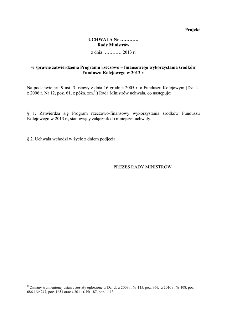 Projekt UCHWAŁA Nr ………… Rady Ministrów z dnia ………… 2013 r. w sprawie zatwierdzenia Programu rzeczowo – finansowego wykorzystania środków Funduszu Kolejowego w 2013 r. Na podstawie art. 9 ust. 3 ustawy z dnia 16 grudnia 2005 r. o Funduszu Kolejowym (Dz. U. z 2006 r. Nr 12, poz. 61, z późn. zm.1)) Rada Ministrów uchwala, co następuje: § 1. Zatwierdza się Program rzeczowo-finansowy wykorzystania środków Funduszu Kolejowego w 2013 r., stanowiący załącznik do niniejszej uchwały. § 2. Uchwała wchodzi w życie z dniem podjęcia. PREZES RADY MINISTRÓW 1) Zmiany wymienionej ustawy zostały ogłoszone w Dz. U. z 2009 r. Nr 115, poz. 966, z 2010 r. Nr 108, poz. 686 i Nr 247, poz. 1651 oraz z 2011 r. Nr 187, poz. 1113. UZASADNIENIE Projekt uchwały Rady Ministrów stanowi wykonanie upoważnienia zawartego w art. 9 ust. 3 ustawy z dnia 16 grudnia 2005 r. o Funduszu Kolejowym (Dz. U. z 2006 r. Nr 12, poz. 61, z późn. zm.). Celem uchwały jest zatwierdzenie Programu rzeczowo –finansowego wykorzystania środków Funduszu Kolejowego w 2013 roku, w którym określono zadania przewidziane do finansowania z Funduszu. Fundusz Kolejowy został utworzony na podstawie ustawy z dnia 16 grudnia 2005 r. o Funduszu Kolejowym (Dz. U. z 2006 r. Nr 12, poz. 61, z późn. zm.) i działa jako wyodrębniony rachunek bankowy prowadzony przez Bank Gospodarstwa Krajowego. Kwestie opracowania, zawartości oraz sposobu przyjmowania Programu rzeczowofinansowego wykorzystania środków Funduszu Kolejowego, zwanego dalej „Programem”, określa art. 9 ustawy z dnia 16 grudnia 2005 r. o Funduszu Kolejowym. Głównym źródłem zasilania Funduszu są środki pochodzące z 20% wpływów z opłaty paliwowej pobieranej od wprowadzanych na rynek krajowy paliw silnikowych oraz gazu. Bank Gospodarstwa Krajowego jest depozytariuszem środków zgromadzonych na rachunku Funduszu, a ponadto może zaciągać kredyty i pożyczki na rzecz Funduszu, które mogą być poręczone lub gwarantowane przez Skarb Państwa. Podstawowym zadaniem Funduszu Kolejowego jest gromadzenie środków finansowych na przygotowanie i realizację budowy i przebudowy linii kolejowych, remonty i utrzymanie linii kolejowych oraz likwidację zbędnych linii kolejowych. Ponadto środki Funduszu mogą być przeznaczane na: - finansowanie lub współfinansowanie przez samorządy województw w latach 2009-2015 zadań z zakresu zakupu, modernizacji oraz napraw pojazdów kolejowych przeznaczonych do przewozów pasażerskich wykonywanych na podstawie umowy o świadczenie usług publicznych, finansowanie nabycia od PKP S.A. przez Skarb Państwa akcji PKP PLK S.A., wydatki bieżące PKP PLK S.A. związane z działalnością polegającą na zarządzaniu infrastrukturą kolejową Według prognoz Banku Gospodarstwa Krajowego wpływy z opłaty paliwowej w części stanowiącej środki Funduszu Kolejowego (zgodnie z art. 5 ust. 1 pkt 1 i 3 ustawy o Funduszu Kolejowym 20% wpływów z opłaty paliwowej powiększone o 100 mln zł) wyniosą 1 020,00 mln zł. W 2012 roku Minister Transportu, Budownictwa i Gospodarki Morskiej zaproponował zmianę uchwały nr 236/2011 Rady Ministrów w sprawie zatwierdzenia Programu rzeczowofinansowego wykorzystania środków Funduszu Kolejowego w roku 2012 z uwagi na: uaktualnienie szacunków BGK co do kwoty dostępnych w 2012 roku środków Funduszu, konieczność modyfikacji harmonogramów robót; oszczędności osiągnięte w trakcie przeprowadzonych postępowań przetargowych. W projekcie powyższej uchwały Minister Transportu, Budownictwa i Gospodarki Morskiej zaproponował m.in. zwiększenie środków Funduszu Kolejowego o kwotę 117 000 000,00 zł z podziałem na: 1 dodatkowe środki w kwocie 115 000 000,00 zł dla PKP PLK S.A. w części B Programu; dodatkowe środki w kwocie 2 000 000,00 zł dla PKP SKM w Trójmieście Sp. z o.o. w części A Programu. Zwiększenie środków Funduszu Kolejowego o kwotę 117 000 000,00 zł związane było z saldem na początku 2012 r. Na etapie opracowania projektu Programu na 2012 r. zakładano, że ten stan będzie niższy. Rada Ministrów w listopadzie 2012 roku odrzuciła jednak projekt przedłożony przez Ministra Transportu, Budownictwa i Gospodarki Morskiej, co uniemożliwia rozliczenie w 2012 roku zadań, które zostały zgłoszone do nowelizacji Programu na 2012 roku lub zwiększono ich zakres rzeczowy. Środki przewidziane na ich realizację zostały przesunięte na rok 2013. Proponowany podział środków Funduszu w 2013 r. jest następujący: 265 278 600,00 zł – przygotowanie oraz realizacja budowy i przebudowy linii kolejowych przez PKP PLK S.A.; 12 000 000,00 zł – przygotowanie oraz realizacja budowy i przebudowy linii kolejowych przez PKP SKM w Trójmieście Sp. z o. o. .; 257 947 170,00 zł – zadania w zakresie remontów i utrzymania linii kolejowych realizowane przez PKP PLK S.A.; 136 561 009,92 zł – finansowanie lub współfinansowanie przez samorządy województw zadań w zakresie zakupu, modernizacji oraz napraw pojazdów kolejowych przeznaczonych do przewozów pasażerskich wykonywanych na podstawie umowy o świadczenie usług publicznych; 500 000 000,00 zł – sfinansowanie nabycia od PKP S.A. przez Skarb Państwa akcji PKP PLK S.A.; 60 000 000,00 zł – wydatki bieżące PKP PLK S.A. związane z działalnością polegającą na zarządzaniu infrastrukturą kolejową. Ostrożnie szacując na zadania ujęte w Programie rzeczowo-finansowym wykorzystania środków Funduszu Kolejowego proponuje się przeznaczyć w roku 2013 kwotę około 1 231,79 mln zł, z czego na zadania ujęte w części A i B Programu możliwe będzie przeznaczenie z Funduszu kwoty około 535,2 mln zł W części A dla spółki PKP PLK S.A. limit środków na zadania ujęte w Programie rzeczowofinansowym wykorzystania środków Funduszu Kolejowego na 2012 r., zgodnie z przyjętą Uchwałą nr 236/2011 Rady Ministrów, wynosi 267 000 000,00 zł. PKP PLK S.A. w ramach ob