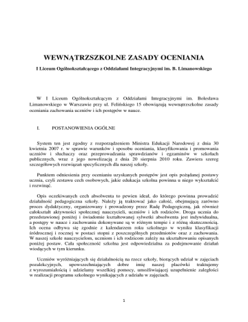WEWNĄTRZSZKOLNE ZASADY OCENIANIA I Liceum Ogólnokształcącego z Oddziałami Integracyjnymi im. B. Limanowskiego W I Liceum Ogólnokształcącym z Oddziałami Integracyjnymi im. Bolesława Limanowskiego w Warszawie przy ul. Felińskiego 15 obowiązują wewnątrzszkolne zasady oceniania zachowania uczniów i ich postępów w nauce. I. POSTANOWIENIA OGÓLNE System ten jest zgodny z rozporządzeniem Ministra Edukacji Narodowej z dnia 30 kwietnia 2007 r. w sprawie warunków i sposobu oceniania, klasyfikowania i promowania uczniów i słuchaczy oraz przeprowadzania sprawdzianów i egzaminów w szkołach publicznych, wraz z jego nowelizacją z dnia 20 sierpnia 2010 roku. Zawiera szereg szczegółowych rozwiązań specyficznych dla naszej szkoły. Punktem odniesienia przy ocenianiu uzyskanych postępów jest opis pożądanej postawy ucznia, czyli zestawu cech osobowych, jakie edukacja szkolna powinna u niego wykształcić i rozwinąć. Opis oczekiwanych cech absolwenta to pewien ideał, do którego powinna prowadzić działalność pedagogiczna szkoły. Należy ją traktować jako całość, obejmującą zarówno proces dydaktyczny, organizowany i prowadzony przez Radę Pedagogiczną, jak również całokształt aktywności społecznej nauczycieli, uczniów i ich rodziców. Droga ucznia do przedstawionej poniżej i świadomie kształtowanej sylwetki absolwenta jest indywidualna, a postępy w nauce i zachowaniu dokonywane są w różnym tempie i z różną skutecznością. Ich ocena odbywa się zgodnie z kalendarzem roku szkolnego w wyniku klasyfikacji śródrocznej i rocznej w postaci stopni z poszczególnych przedmiotów oraz z zachowania. W naszej szkole nauczycielom, uczniom i ich rodzicom zależy na ukształtowaniu opisanych poniżej postaw. Cała społeczność szkolna jest odpowiedzialna za podejmowanie działań wiodących w tym kierunku. Uczniów wyróżniających się działalnością na rzecz szkoły, biorących udział w zajęciach pozalekcyjnych, upowszechniających dobre imię naszej placówki traktujemy z wyrozumiałością i udzielamy wszelkiej pomocy, umożliwiającej uzupełnienie zaległości w realizacji programu szkolnego wynikających z udziału w zajęciach. 1 II. SYLWETKA ABSOLWENTA LICEUM 1. Absolwent liceum jest: odpowiedzialny, obowiązkowy, solidny, co oznacza, że: świadomie podejmuje decyzje i liczy się z ewentualnymi ich konsekwencjami, potrafi dokonać obiektywnej oceny swojego zachowania, wywiązuje się z nałożonych obowiązków, wytrwale realizuje podjęte zadania; samodzielny, zaradny, otwarty, co oznacza, że: jest ciekawy świata i korzysta z różnych źródeł wiedzy, poszukuje nowych obszarów dla swej aktywności, podejmuje nowe wyzwania, potrafi dzięki swej kreatywności samodzielnie rozwiązywać problemy, które stają mu na drodze, potrafi ocenić szanse realizacji własnych oraz cudzych pomysłów i podjąć właściwą decyzję, jest otwarty na współpracę z innymi na rzecz wspólnego dobra; uczciwy, prawy i prawdomówny, co oznacza, że: w pełni docenia znaczenie zaufania w kontaktach między ludźmi i stara się na nie zasłużyć, rozumie złożoność zasad lojalności wobec różnych osób i grup, z którymi jest związany, w sytuacjach konfliktowych wybiera drogę prawdomówności i szczerości, trafnie rozróżnia osoby godne i niegodne zaufania; kulturalny, taktowny, szanujący innych, co oznacza, że: w relacjach z innymi prezentuje wysoką kulturę osobistą i takt, prezentuje postawę szacunku i uznania wobec odmienności religijnej, etnicznej, narodowej i kulturowej, jest świadomy różnic występujących między ludźmi i z szacunkiem traktuje wszystkich, niedozwolone są wszelkie formy rasizmu, dyskryminacji, mobbingu; podczas dyskusji nie narzuca własnego zdania i szanuje opinię innych, potrafi dokonywać trafnych wyborów w trudnych sytuacjach, potrafi właściwie korzystać z dóbr kultury, szanuje tradycje narodowe kraju własnego i innych oraz odnosi się z odpowiednim poszanowaniem do symboli narodowych czy też religijnych; krytyczny wobec siebie i innych, co oznacza, że: jest świadom, iż istnieją różne systemy wartości i respektuje je, cudze opinie rozpatruje w kontekście ogólnie przyjętych zasad moralnych, nie jest podatny na manipulację, 2 posiada umiejętność obiektywnej oceny postawy własnej i innych. 2. Wizerunek ucznia I LO: Ubranie ucznia powinno być czyste, estetyczne, nienaruszające dobrego smaku. Szkolnym strojem jest ubiór zakrywający pępek, pośladki, uda, piersi. Bielizna powinna być skryta pod ubraniem. Dopuszczalny jest delikatny makijaż. 3. Strój galowy: Męskim strojem może być ciemny garnitur lub długie ciemne spodnie (nie dżinsy) w połączeniu z białą koszulą, buty wizytowe, obowiązkowo krawat. Dopuszczalny jest ciemny sweter. Damski strój może stanowić spódnica do kolan (maksymalnie 5 cm przed kolana) lub ciemne spodnie i biała koszula, żakiet, krawat. Obowiązują buty wizytowe, wykluczone są szpilki. Dopuszczalny jest ciemny sweter. Możliwy jest delikatny makijaż. III. PRAWA I OBOWIĄZKI UCZNIA 1. Każdy uczeń I Liceum Ogólnokształcącego z Oddziałami Integracyjnymi im. Bolesława Limanowskiego w Warszawie ma prawo do: a) korzystania z oferty szkoły w zakresie kształcenia i rozwoju osobowości na miarę swoich możliwości i potrzeb, b) korzystania bez ograniczeń z zajęć organizowanych przez szkołę, c) korzystania ze wszystkich pomieszczeń szkoły zgodnie z ich przeznaczeniem, d) korzystania z pomocy w zakresie kształcenia e) korzystania z pomocy materialnej na wniosek własny, rodziców lub wychowawcy klasy, na zasadach określonych w statucie szkoły, f) poprawiania uzyskanych ocen bieżących i podnoszenia proponowanej oceny rocznej (semestralnej), g) przekazywania władzom samorządu uczniowskiego, wychowawcy klasy, dyrekcji szkoły uwag dotyczących wszystkich aspektów funkcjonowania szkoły. 2. Każdy uczeń I Liceum Ogólnokształc
