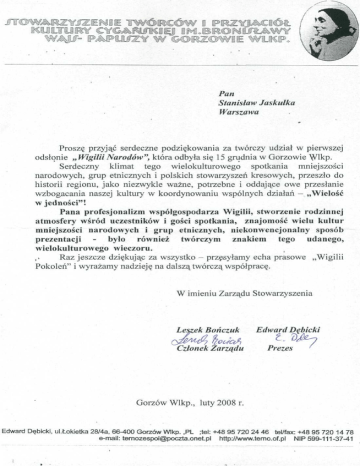 Stanisław Jaskulka Warszawa Proszę przyjąć serdeczne podziękowania za twórczy udział w pierwszej odsłonie „ Wigilii Narodów", która odbyła się 15 grudnia w Gorzowie Wlkp. Serdeczny klimat tego wielokulturowego spotkania mniejszości narodowych, grup etnicznych i polskich stowarzyszeń kresowych, przeszło do historii regionu, jako niezwykle ważne, potrzebne i oddające owe przesłanie wzbogacania naszej kultury w koordynowaniu wspólnych działań - „Wielość w jedności"! Pana profesjonalizm współgospodarza Wigilii, stworzenie rodzinnej atmosfery wśród uczestników i gości spotkania, znajomość wielu kultur mniejszości narodowych i grup etnicznych, niekonwencjonalny sposób prezentacji - było również twórczym znakiem tego udanego, wielokulturowego wieczoru. ,* Raz jeszcze dziękując za wszystko - przesyłamy echa prasowe „Wigilii Pokoleń" i wyrażamy nadzieję na dalszą twórczą współpracę. W imieniu Zarządu Stowarzyszenia Leszek Bończuk Czlonek Zarządu Edward Dębicki Prezes Gorzów Wlkp., luty 2008 r. Edward Dębicki, ul.Łokietka 28/4a, 66-400 Gorzów Wlkp. ,PL ;tel: +48 95 720 24 46 tel/fax: +48 95 720 14 78 e-mail: [email protected] http://www.temo.of.pl NIP 599-111-37-41