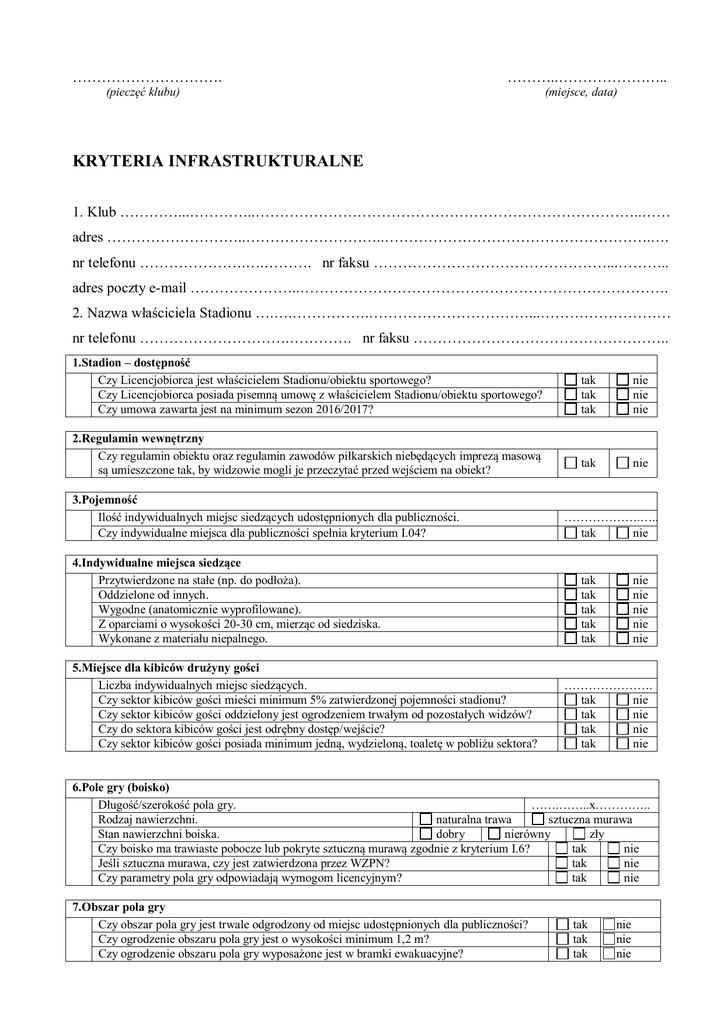 …………………………. ………..………………….. (pieczęć klubu) (miejsce, data) KRYTERIA INFRASTRUKTURALNE 1. Klub …………...…………..……………………………………………………………………..…… adres ………………………..………………………..……………………………………………….…. nr telefonu ………………….….………. nr faksu …………………………………………...……….. adres poczty e-mail …………………..…………………………………………………………………. 2. Nazwa właściciela Stadionu ….….…………….……………………………...……………………… nr telefonu ………………………….…………. nr faksu …………………………………………….. 1.Stadion – dostępność Czy Licencjobiorca jest właścicielem Stadionu/obiektu sportowego? Czy Licencjobiorca posiada pisemną umowę z właścicielem Stadionu/obiektu sportowego? Czy umowa zawarta jest na minimum sezon 2016/2017? 2.Regulamin wewnętrzny Czy regulamin obiektu oraz regulamin zawodów piłkarskich niebędących imprezą masową są umieszczone tak, by widzowie mogli je przeczytać przed wejściem na obiekt? 3.Pojemność Ilość indywidualnych miejsc siedzących udostępnionych dla publiczności. Czy indywidualne miejsca dla publiczności spełnia kryterium I.04? 4.Indywidualne miejsca siedzące Przytwierdzone na stałe (np. do podłoża). Oddzielone od innych. Wygodne (anatomicznie wyprofilowane). Z oparciami o wysokości 20-30 cm, mierząc od siedziska. Wykonane z materiału niepalnego. 5.Miejsce dla kibiców drużyny gości Liczba indywidualnych miejsc siedzących. Czy sektor kibiców gości mieści minimum 5% zatwierdzonej pojemności stadionu? Czy sektor kibiców gości oddzielony jest ogrodzeniem trwałym od pozostałych widzów? Czy do sektora kibiców gości jest odrębny dostęp/wejście? Czy sektor kibiców gości posiada minimum jedną, wydzieloną, toaletę w pobliżu sektora? tak tak tak nie nie nie tak nie ……………….….. tak nie tak tak tak tak tak nie nie nie nie nie …………………. tak nie tak nie tak nie tak nie 6.Pole gry (boisko) Długość/szerokość pola gry. …….……..x………….. Rodzaj nawierzchni. naturalna trawa sztuczna murawa Stan nawierzchni boiska. dobry nierówny zły Czy boisko ma trawiaste pobocze lub pokryte sztuczną murawą zgodnie z kryterium I.6? tak nie Jeśli sztuczna murawa, czy jest zatwierdzona przez WZPN? tak nie Czy parametry pola gry odpowiadają wymogom licencyjnym? tak nie 7.Obszar pola gry Czy obszar pola gry jest trwale odgrodzony od miejsc udostępnionych dla publiczności? Czy ogrodzenie obszaru pola gry jest o wysokości minimum 1,2 m? Czy ogrodzenie obszaru pola gry wyposażone jest w bramki ewakuacyjne? tak tak tak nie nie nie 8.Ławki w obszarze pola gry Czy obiekt jest wyposażony w zadaszone ławki dla zawodników rezerwowych? Liczba miejsc na ławkach dla zawodników rezerwowych. Czy jest wyznaczony i oznakowany (białym krzyżem na zielonym tle) punkt sanitarny oraz stanowisko dla minimum dwóch noszowych? Czy stanowisko dla noszowych wyposażone jest w nosze? tak nie po ……………… tak nie tak nie 9.Dostęp do obszaru pola gry Czy sędziowie i zawodnicy mają w czasie pobytu na Stadionie zapewnioną odpowiednią ochronę? tak nie 10.Dojazd do obszaru pola gry Czy pojazdy pogotowia, straży pożarnej, policji itp. mają możliwość bezpośredniego dojazdu do obszaru pola gry? tak nie tak tak tak nie nie nie tak tak tak tak nie nie nie nie 11.Szatnie dla drużyn Czy są zapewnione o takim samym standardzie szatnie dla obu drużyn? Minimalne wymagania dla każdej szatni: - powierzchnia minimum 20 m2 (bez pomieszczeń natrysków i toalet) - indywidualne miejsca do siedzenia dla co najmniej 20 osób, - wieszaki lub szafki na odzież dla co najmniej 20 osób, - ilość pryszniców …………, - ilość toalet …………., 12.Szatnia dla sędziów Czy jest zapewniona szatnia dla sędziów (wymagania minimalne)? - oddzielona od szatni dla zawodników, - wyposażona w miejsca do siedzenia, wieszaki lub szafki na odzież dla 4 osób, - 1 prysznic w szatni lub bezpośrednim jej pobliżu, - 1 toaleta w szatni lub bezpośrednim jej pobliżu. 13.Parking Czy dla sędziów, oficjalnych przedstawicieli i uczestniczących w zawodach klubów dostępne w strefie chronionej są miejsca parkingowe? 14.Urządzenia sanitarne Ilość toalet dla kobiet Ilość toalet dla mężczyzn Wyposażenie do mycia (umywalki, woda, ręczniki, suszarki itp.) Standard urządzeń (czyste, jasne, higieniczne itp.) doskonały nie ……………….. ……………….. tak nie odpowiedni niski 15.Nagłośnienie Czy Stadion jest wyposażony w dobrze słyszalne w każdej części system nagłośniający? 16.Oświetlenie Czy Stadion wyposażony jest w oświetlenie? Intensywność oświetlenia 17.Oznakowanie Czy pomieszczenia Stadionu wykorzystywane na zabezpieczenie zawodów są odpowiednio oznakowane (np. szatnia drużyny gospodarzy, szatnia drużyny gości, szatnia dla sędziów, toalety itp.)? 18.Publiczny dostęp i wyjścia ze stadionu Czy Stadion wyposażony jest w ogrodzenie zewnętrzne? Czy przy wejściu są oznakowane punkty kasowe i depozytowe? Czy wejścia na Stadion są wyposażone w barierki kierujące lub kołowrotki? tak tak nie tak nie luksów …….……. tak nie tak tak tak nie nie nie 1.Załącznikiem do informacji infrastrukturalnej jest umowa na korzystanie z obiektu sportowego. 2.Załącznikiem do informacji infrastrukturalnej jest aktualny protokół weryfikacji boiska. 3.W przypadku korzystania z różnych boisk do rozgrywek poszczególnych drużyn Wnioskodawcy załącznikiem do niniejszej informacji muszą być aktualne protokoły weryfikacji tych boisk. Podpis/podpisy osób reprezentujących klub zgodnie z rejestrem: 1. ………………………