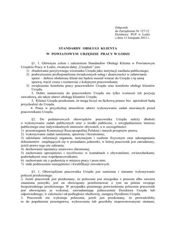 Załącznik do Zarządzenia Nr 127/12 Dyrektora PUP w Łodzi z dnia 12 listopada 2012 r. STANDARDY OBSŁUGI KLIENTA W POWIATOWYM URZĘDZIE PRACY W ŁODZI §1. 1. Głównym celem i założeniem Standardów Obsługi Klienta w Powiatowym Urzędzie Pracy w Łodzi, zwanym dalej „Urzędem” jest: 1) zbudowanie pozytywnego wizerunku Urzędu jako instytucji zaufania publicznego; 2) podwyższenie profesjonalizmu świadczonych usług i skuteczności w załatwianiu spraw – dobrze obsłużony klient nie będzie musiał wracać do Urzędu z tą samą sprawą, tracić czasu i rozmawiać z kolejnymi pracownikami; 3) zwiększenie komfortu pracy pracowników Urzędu oraz komfortu obsługi klientów Urzędu. 2. Dobre nastawienie do pracowników Urzędu nie tylko wzmocni ich pozycję zawodową, ale także ułatwi obsługę klientów Urzędu. 3. Klienci Urzędu przekonani, że mogą liczyć na fachową pomoc bez uprzedzeń będą przychodzić do Urzędu. 4. Praca w przychylnej atmosferze ułatwi wykonywanie zadań stawianych przed pracownikami Urzędu. §2. Do podstawowych obowiązków pracownika Urzędu należy dbałość o wykonywanie zadań publicznych oraz o środki publiczne, z uwzględnieniem interesu publicznego oraz indywidualnych interesów obywateli, a w szczególności: 1) przestrzeganie Konstytucji Rzeczpospolitej Polskiej i innych przepisów prawa; 2) wykonywanie zadań sumiennie, sprawnie i bezstronnie; 3) udzielanie informacji organom, instytucjom i osobom fizycznym oraz udostępnianie dokumentów znajdujących się w posiadaniu jednostki, w której pracownik jest zatrudniony, jeżeli prawo tego nie zabrania; 4) dochowanie tajemnicy ustawowo chronionej; 5) zachowanie uprzejmości i życzliwości w kontaktach z obywatelami, zwierzchnikami, podwładnymi oraz współpracownikami; 6) zachowanie się z godnością w miejscu pracy i poza nim; 7) stałe podnoszenie umiejętności i kwalifikacji zawodowych. §3. 1. Obowiązkiem pracownika Urzędu jest sumienne i staranne wykonywanie poleceń przełożonego. 2. Jeżeli pracownik jest przekonany, że polecenie jest niezgodne z prawem albo zawiera znamiona pomyłki, jest on obowiązany poinformować o tym na piśmie swojego bezpośredniego przełożonego. W przypadku pisemnego potwierdzenia polecenia pracownik jest obowiązany je wykonać, zawiadamiając jednocześnie Dyrektora Urzędu lub odpowiedniego, w zależności od podległości służbowej, zastępcę Dyrektora Urzędu. 3. Pracownik nie wykonuje polecenia, jeżeli jest przekonany, że prowadziłoby to do popełnienia przestępstwa, wykroczenia lub groziłoby niepowetowanymi stratami, o czym niezwłocznie informuje Dyrektora Urzędu lub odpowiedniego, w zależności od podległości służbowej, zastępcę Dyrektora Urzędu. §4. W trakcie wykonywania czynności służbowych, m.in. w bezpośrednim kontakcie z klientem Urzędu, pracownik Urzędu: 1) kieruje się zasadą nadrzędną stanowiącą, że władza państwowa jest władzą służebną w stosunku do obywateli i prawa; 2) traktuje pracę jak służbę publiczną i działa tak, by jego postępowanie było wzorem praworządności i prowadziło do pogłębienia zaufania obywateli do Państwa i jego organów; 3) powierzone zadania wykonuje z poszanowaniem godności innych i z poczuciem godności własnej, pamiętając o tym, że daje swoim postępowaniem świadectwo o organach administracji państwowej i współtworzy wizerunek administracji samorządowej, w tym Urzędu; 4) wykazuje osobiste ukierunkowanie na klienta umieszczając go w centrum zainteresowania; 5) buduje relacje z klientem w oparciu o klimat otwartości, wzajemnego szacunku i empatii, tak by klient załatwiając sprawę miał pełne przekonanie, że Urząd jest przyjazny dla klienta; 6) działa w sposób profesjonalny, bezstronny, zgodny z obowiązującymi przepisami prawa; 7) dba o to, by klient uzyskał informacje i usługi, których naprawdę potrzebuje i dostarcza je w sposób najbardziej odpowiedni dla klienta; 8) dostosowuje formę przekazu do możliwości percepcyjnych klienta i przekazuje informacje w sposób przejrzysty i logiczny, językiem zrozumiałym dla klienta. §5. Komunikacja z klientem realizowana jest poprzez wszelkie dostępne kanały informacyjne i może odbywać się w sposób: 1) bezpośredni - realizowany poprzez: a) osobisty kontakt klienta z pracownikiem Urzędu, b) osobisty kontakt klienta z pracownikiem prowadzącym czynności sprawdzające lub prowadzącym postępowanie, c) telefoniczną rozmowę z pracownikiem Urzędu, d) osobisty kontakt z pracownikiem Urzędu prowadzącym otwarte spotkania informacyjne z klientami; 2) pośredni - realizowany poprzez: a) kolportaż drukowanych materiałów informacyjnych, b) Internet (publikowanie na stronach internetowych Urzędu podstawowych informacji o Urzędzie i podejmowanych przez Urząd inicjatywach, informacji o zmianach obowiązujących przepisów, możliwość korespondencji za pomocą poczty elektronicznej), c) współpracę z lokalnymi mediami (podejmowaną z inicjatywy Urzędu w celu przekazania w formie informacji dotyczących: funkcjonowania Urzędu, podejmowanych przez Urząd akcji, zmiany w obowiązujących przepisach, interpretacji przepisów itp.). §6. Podstawowe standardy obsługi klienta w Urzędzie: 1) zainteresowanie klientem - klient wchodzący do Urzędu powinien odczuć zainteresowanie i życzliwość ze strony pracowników Urzędu. Jeśli jest taka potrzeba pracownik Urzędu powinien pomóc, kierując klienta do odpowiedniej komórki organizacyjnej lub punktu informacyjnego; 2) odpowiedni wygląd stanowiska pracy - na biurku powinny znaleźć się tylko dokumenty obsługiwanego klienta i dotyczące jego sprawy. Pracownik Urzędu powinien tak ustawić monitor z bazą danych oraz inne dokumenty aby były niewidoczne dla osób znajdujących się w pobliżu stanowiska pracy; 3) odpowiedni zewnętrzny wygląd pracownika Urzędu - wygląd pracownika powinien mieć charakter służbowy (p
